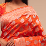 Experience the richness of silk with this orioles orange banarasi saree. It’s all about the floral-peaock butta pattern and a beautifully designed border that stands out. It’s traditionally woven and feels grand, perfect for when you want to look and feel special.
