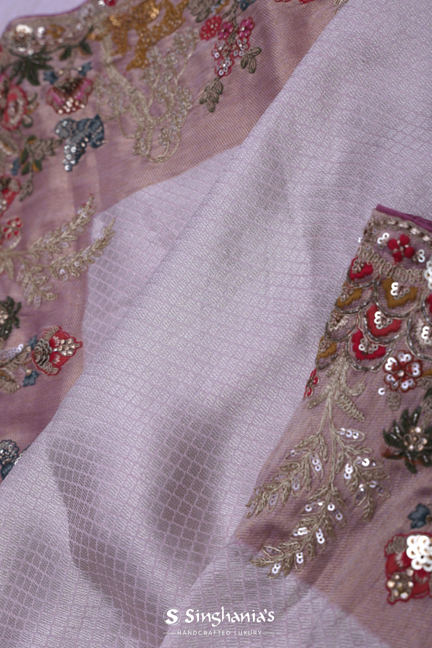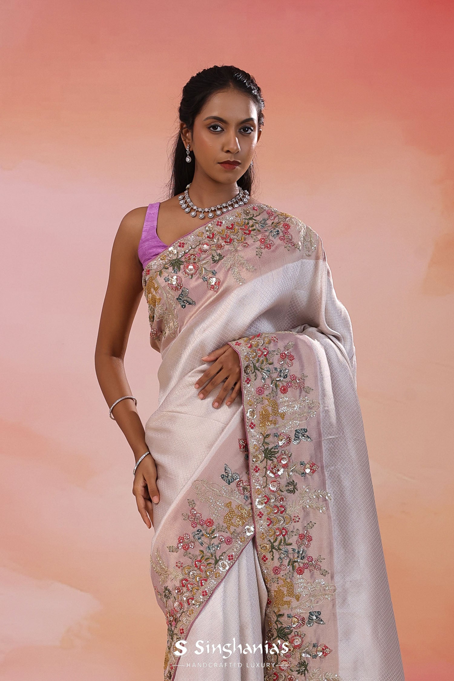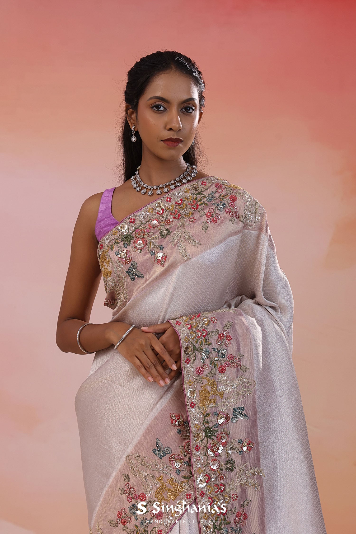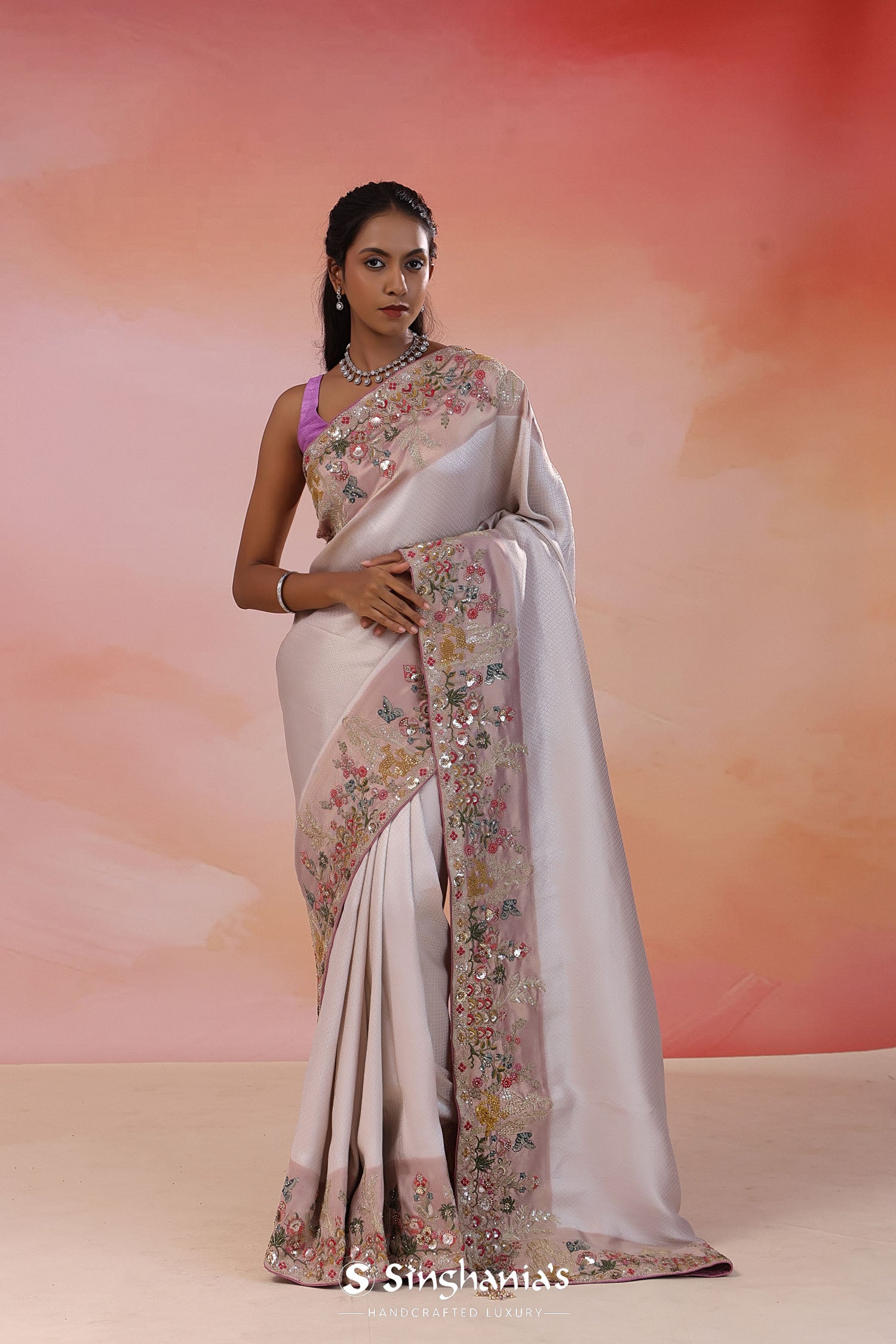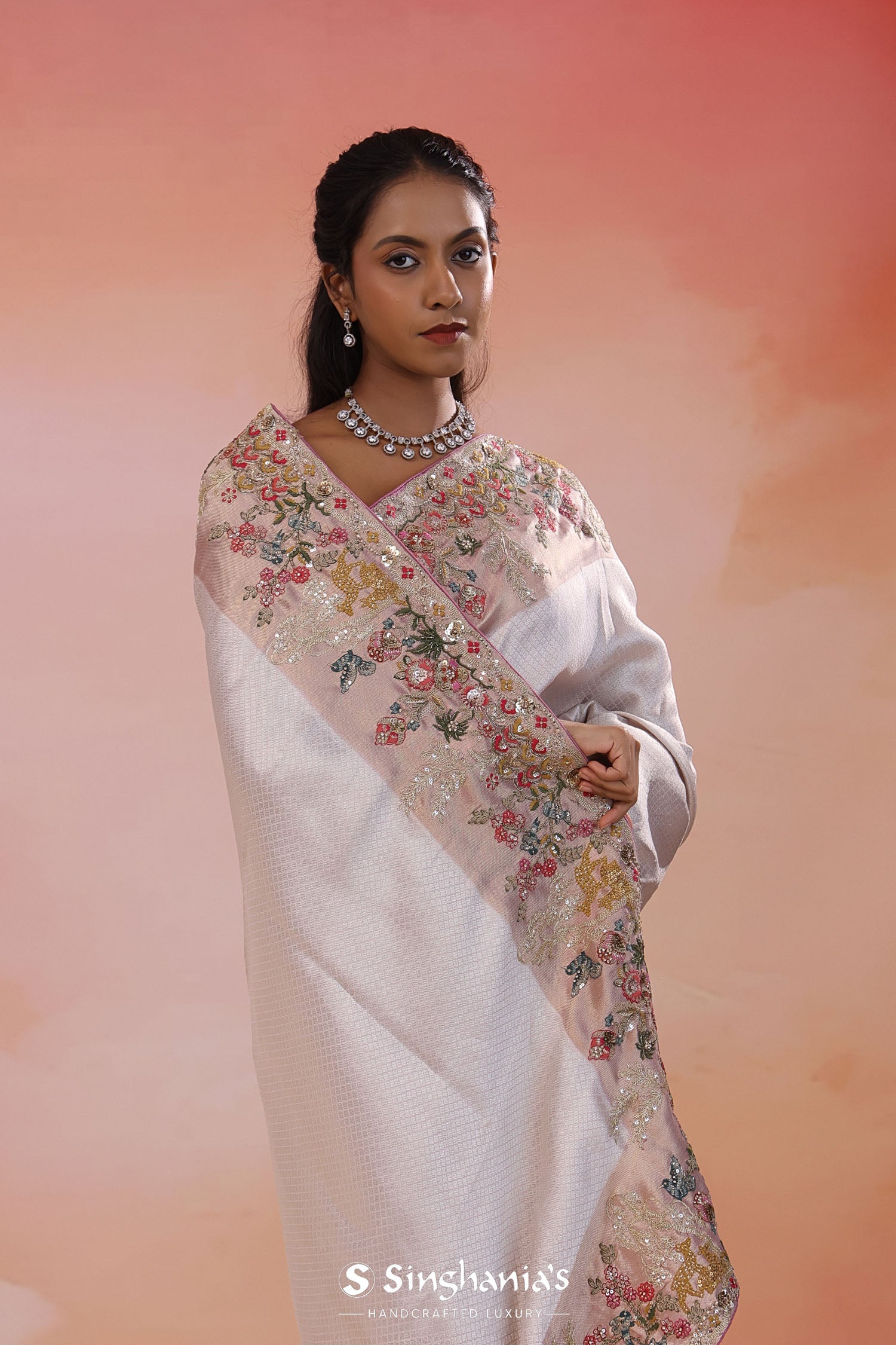 Pair with minimal jewellery and soft makeup to highlight the timeless elegance Singhania’s is known for.