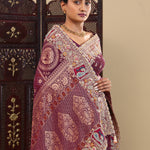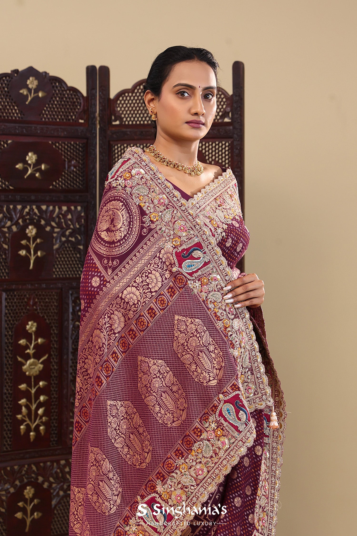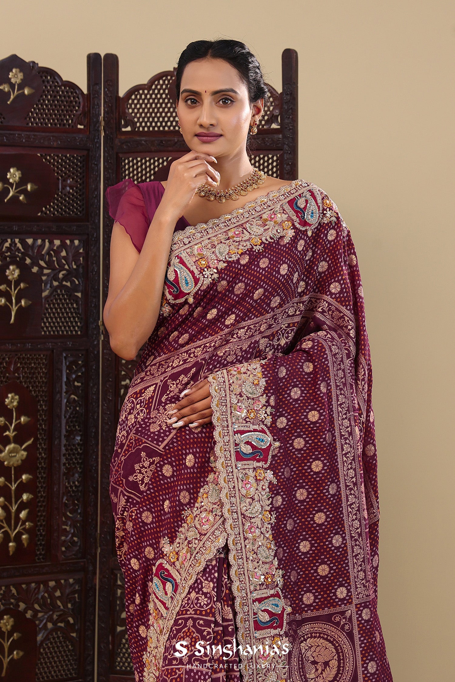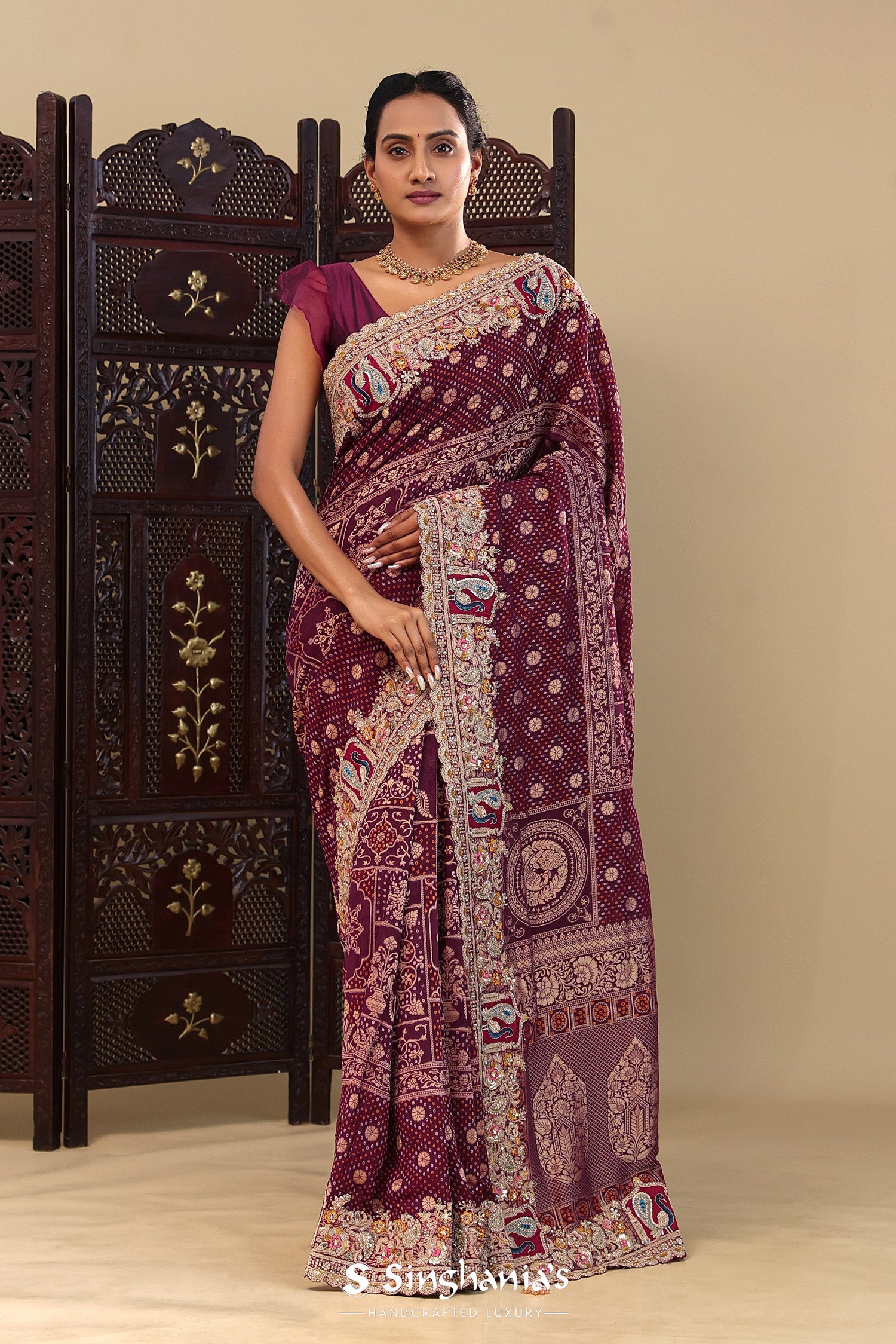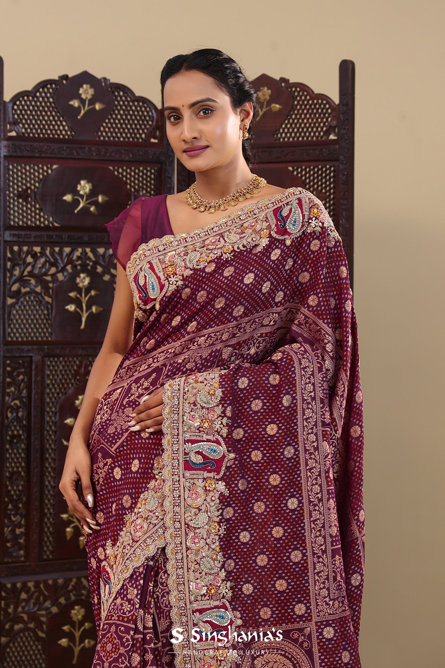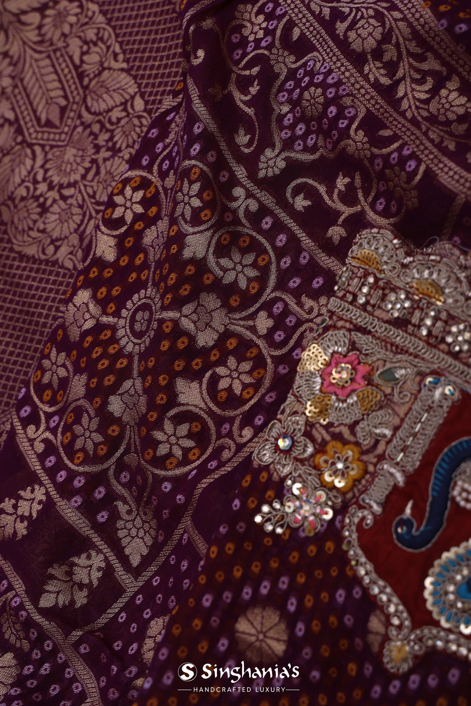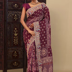 This bandhani work spread all across the body of saree along with floral motifs complemented with embroidered scallop border