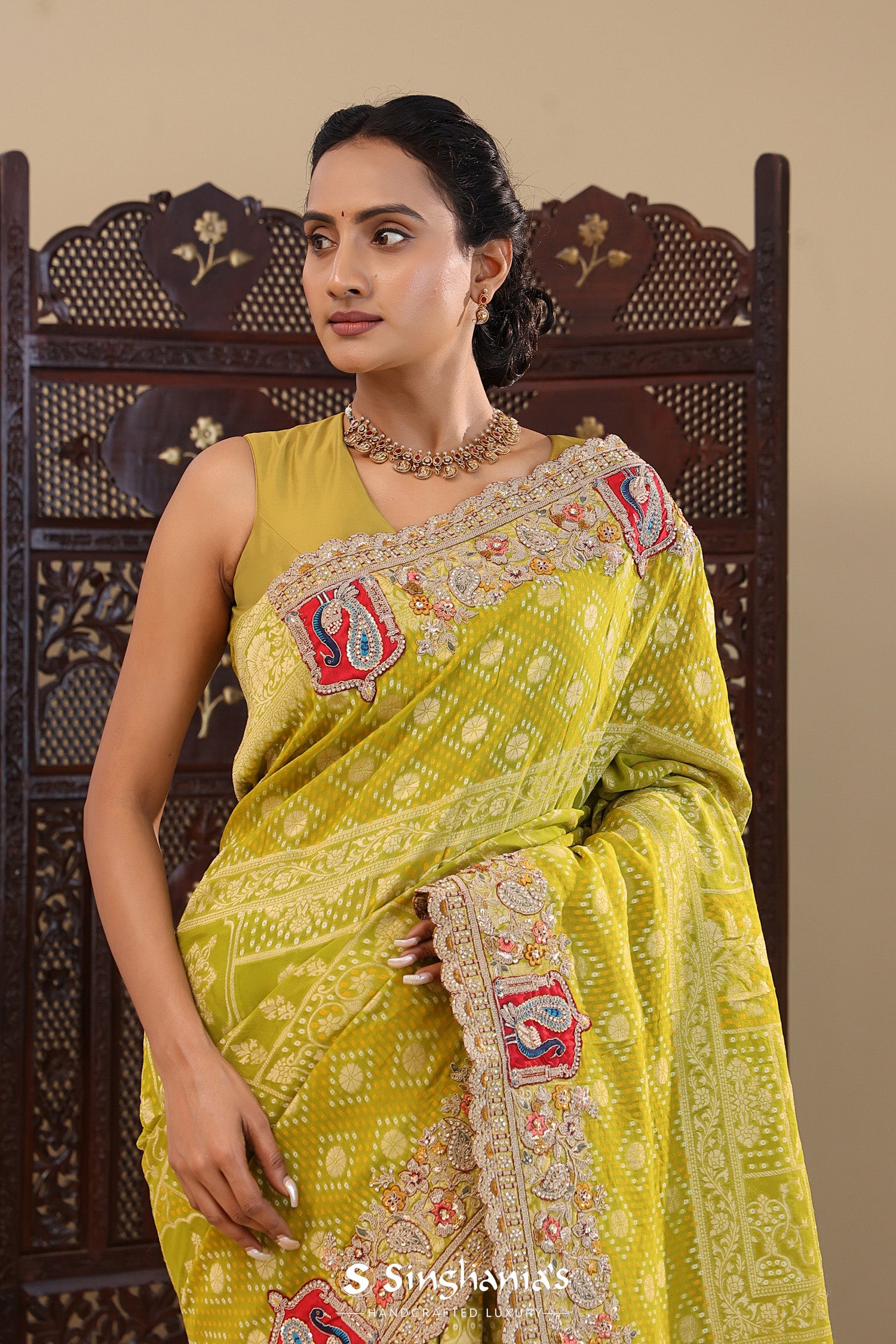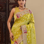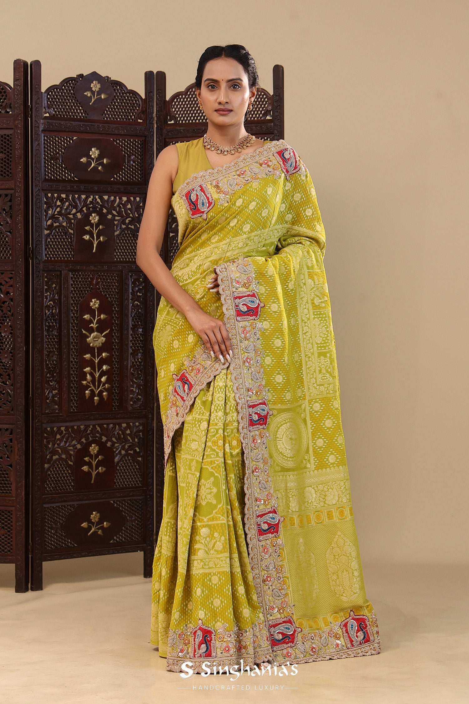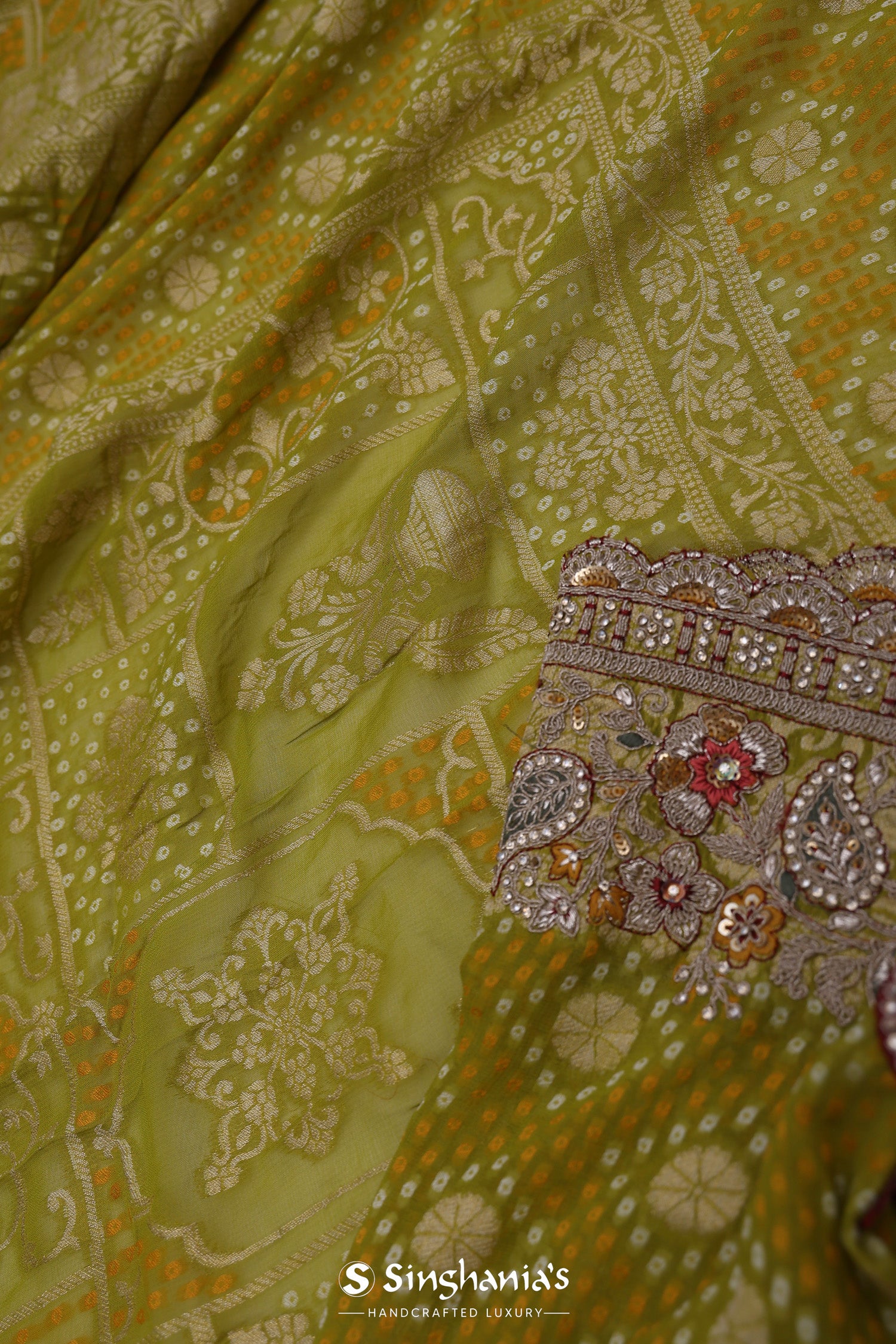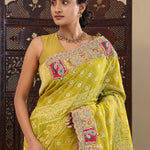 This bandhani work spread all across the body of saree along with floral motifs complemented with embroidered scallop border