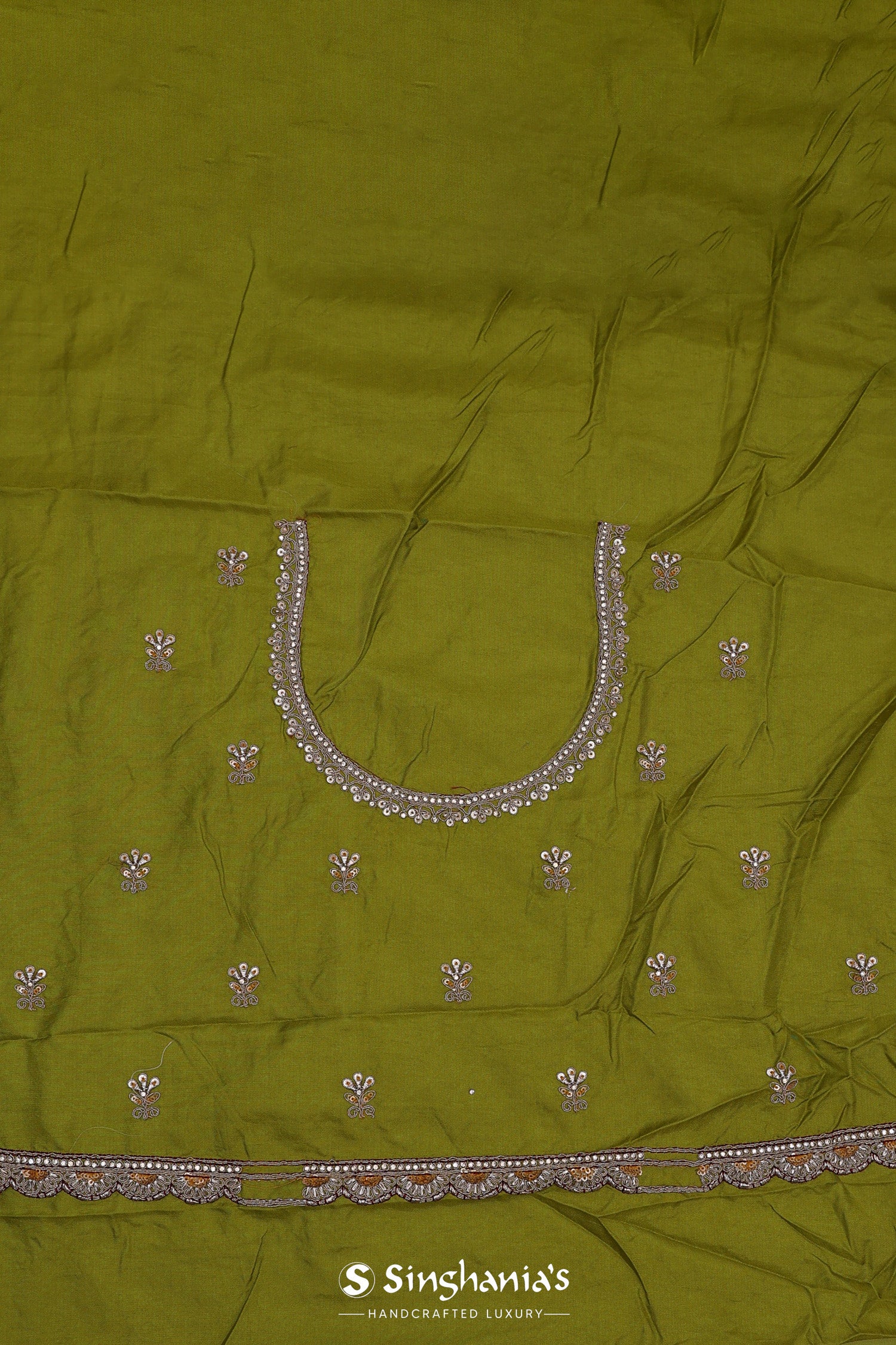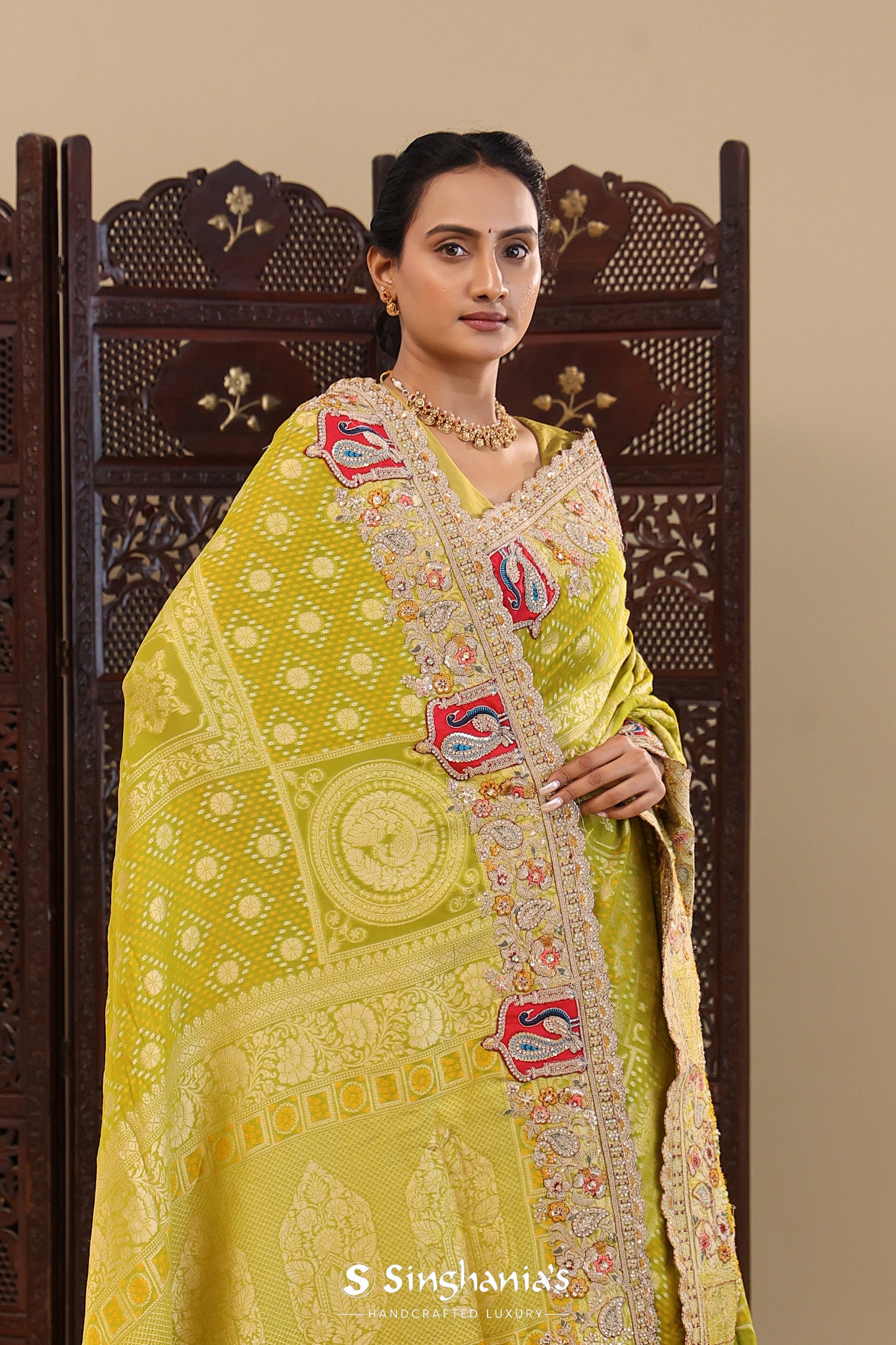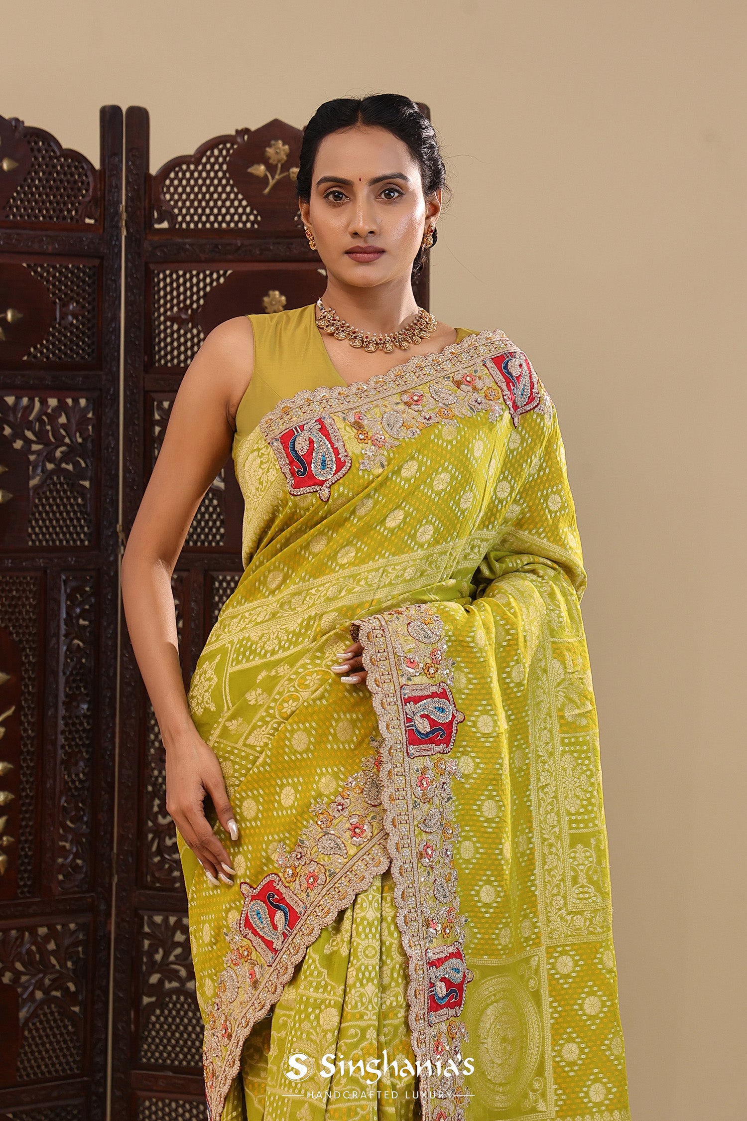 This bandhani work spread all across the body of saree along with floral motifs complemented with embroidered scallop border