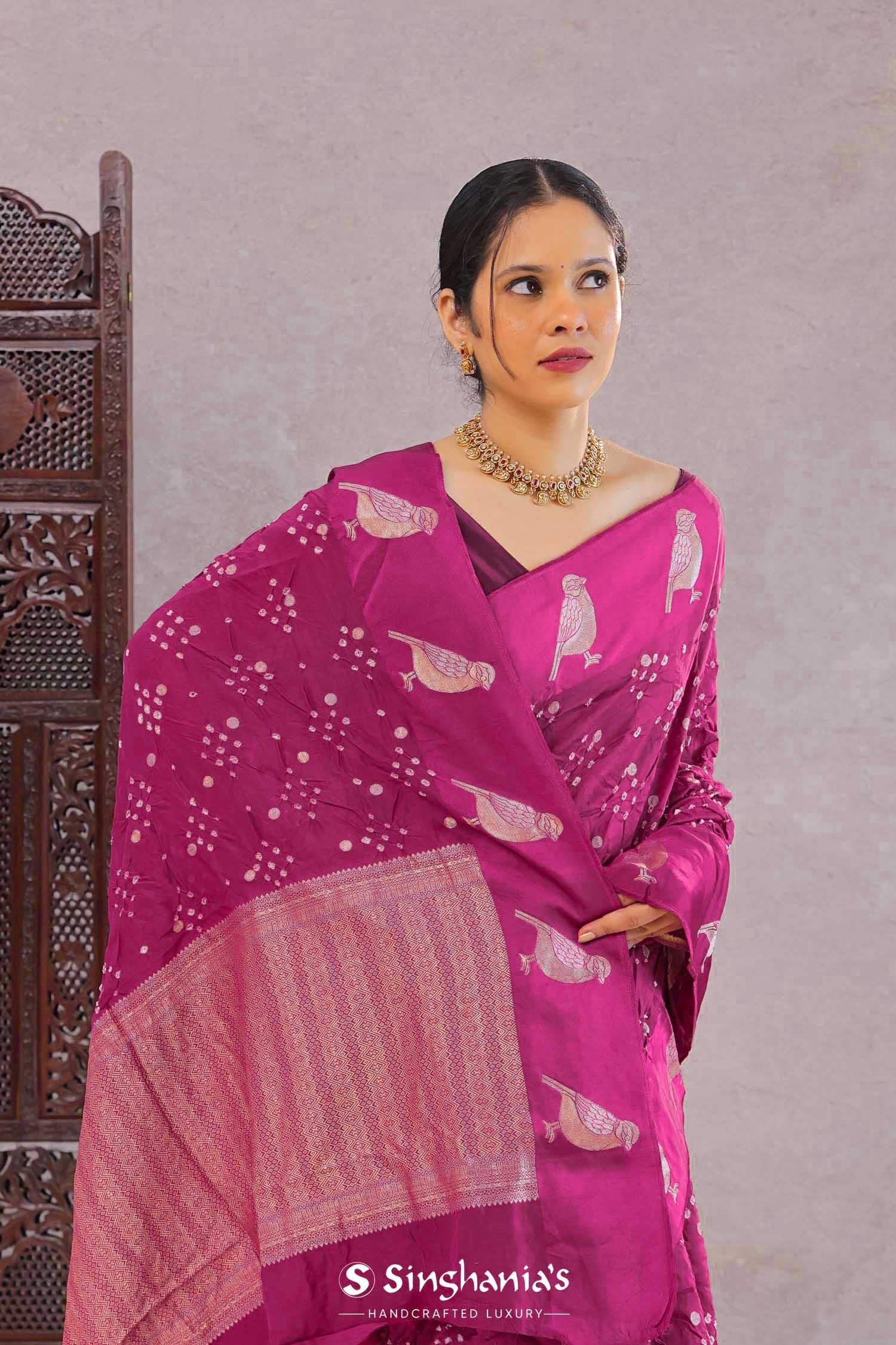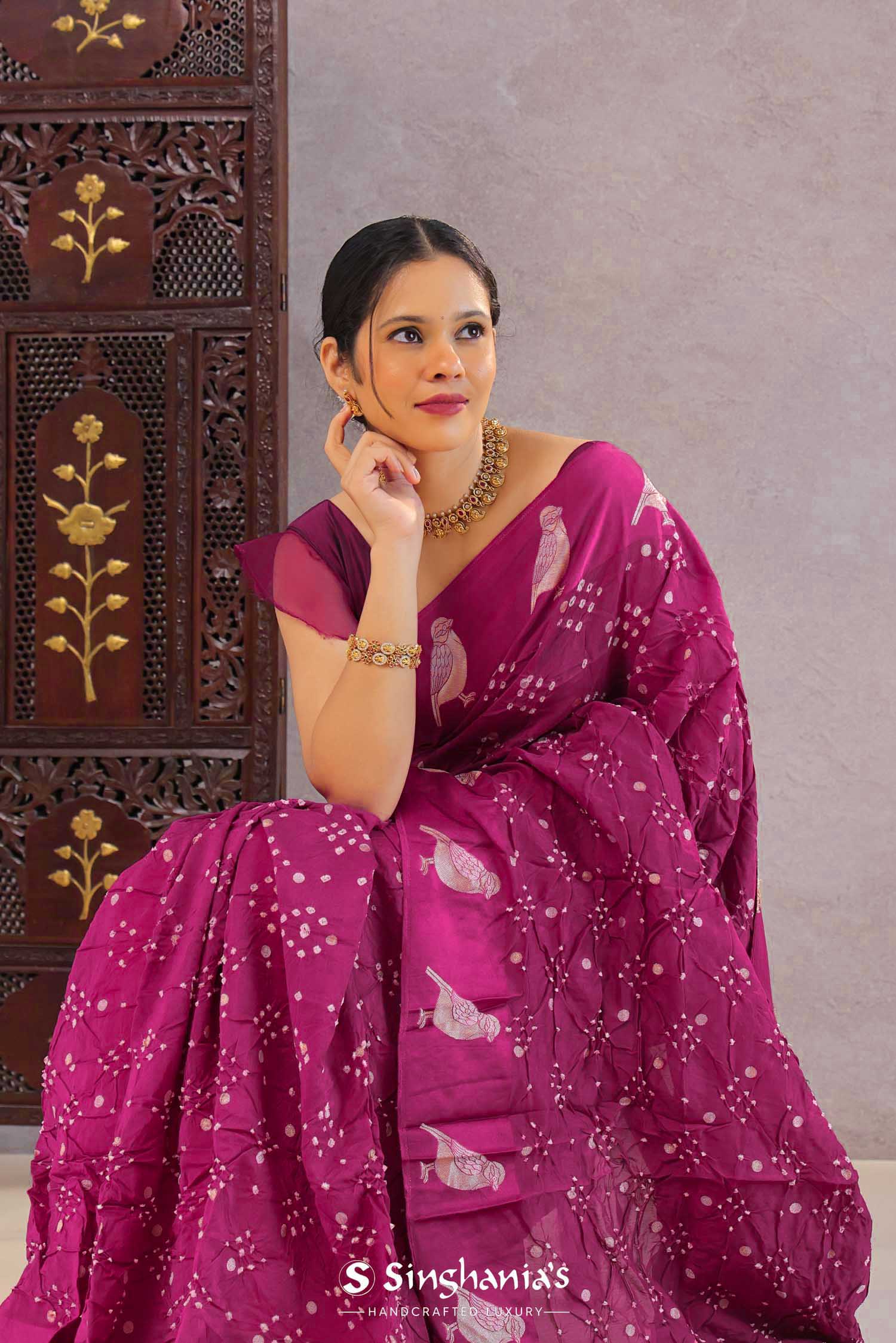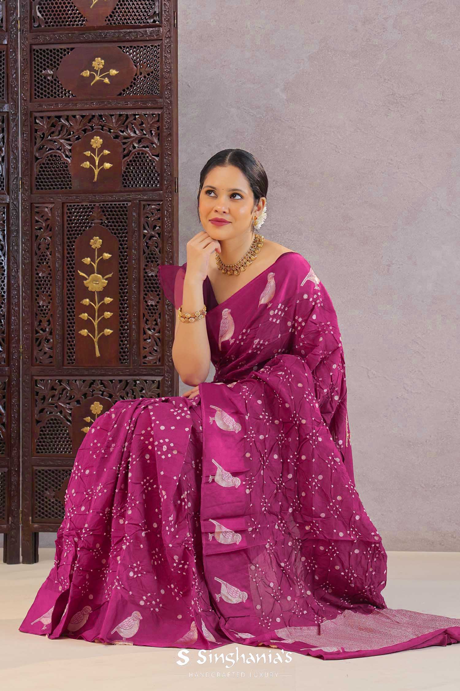 This dye pattern on Red violet bandhani silk saree with border featuring avian motifs is a ideal choice for any occasion.Making you satisfy with each drape