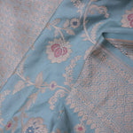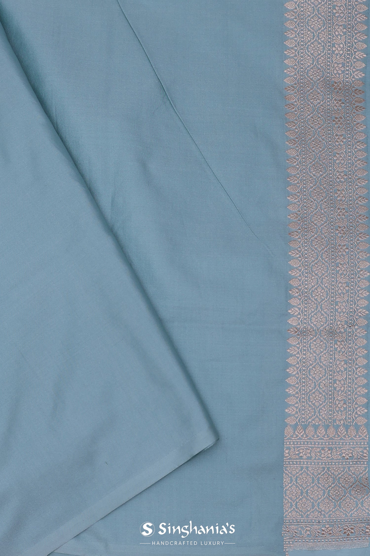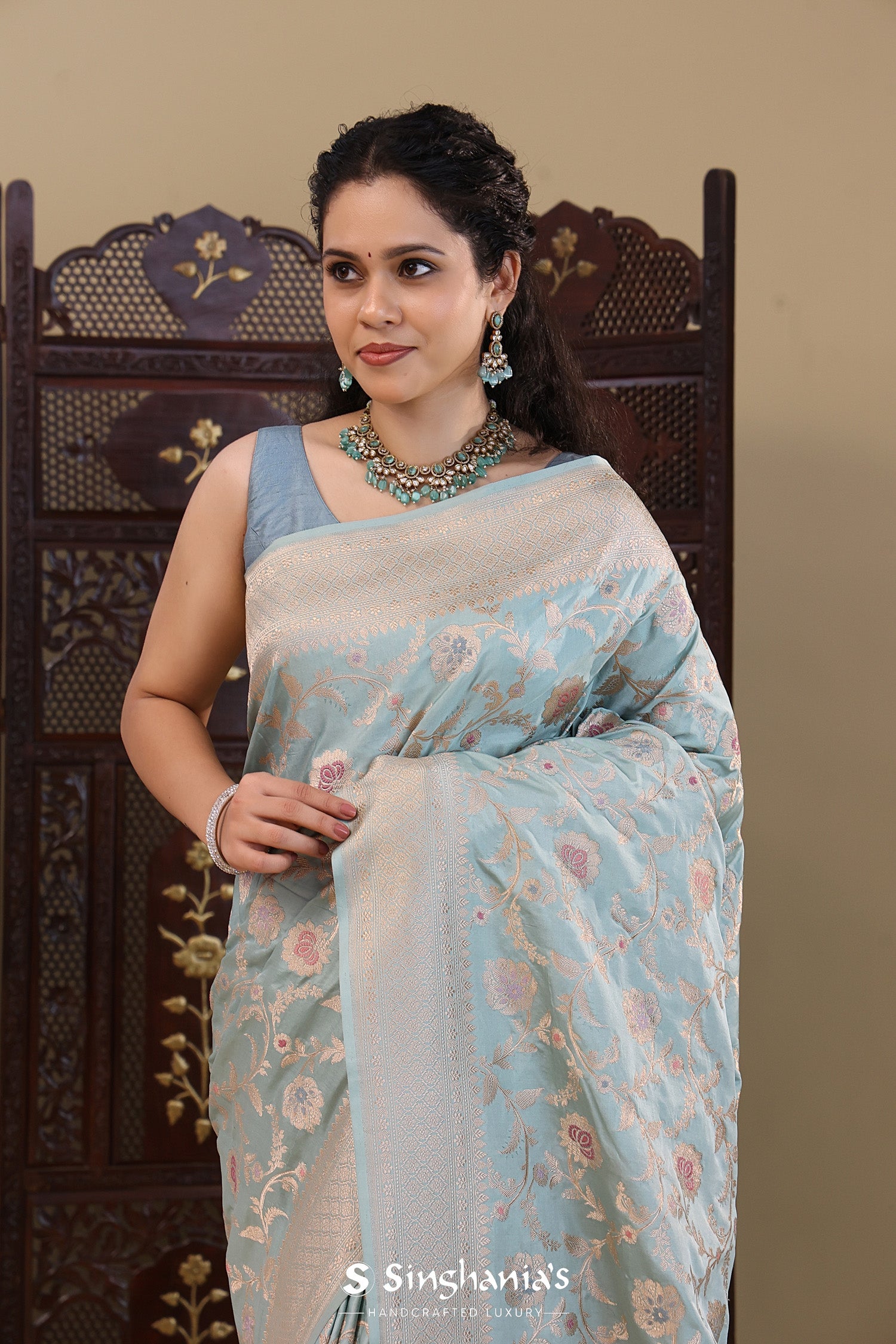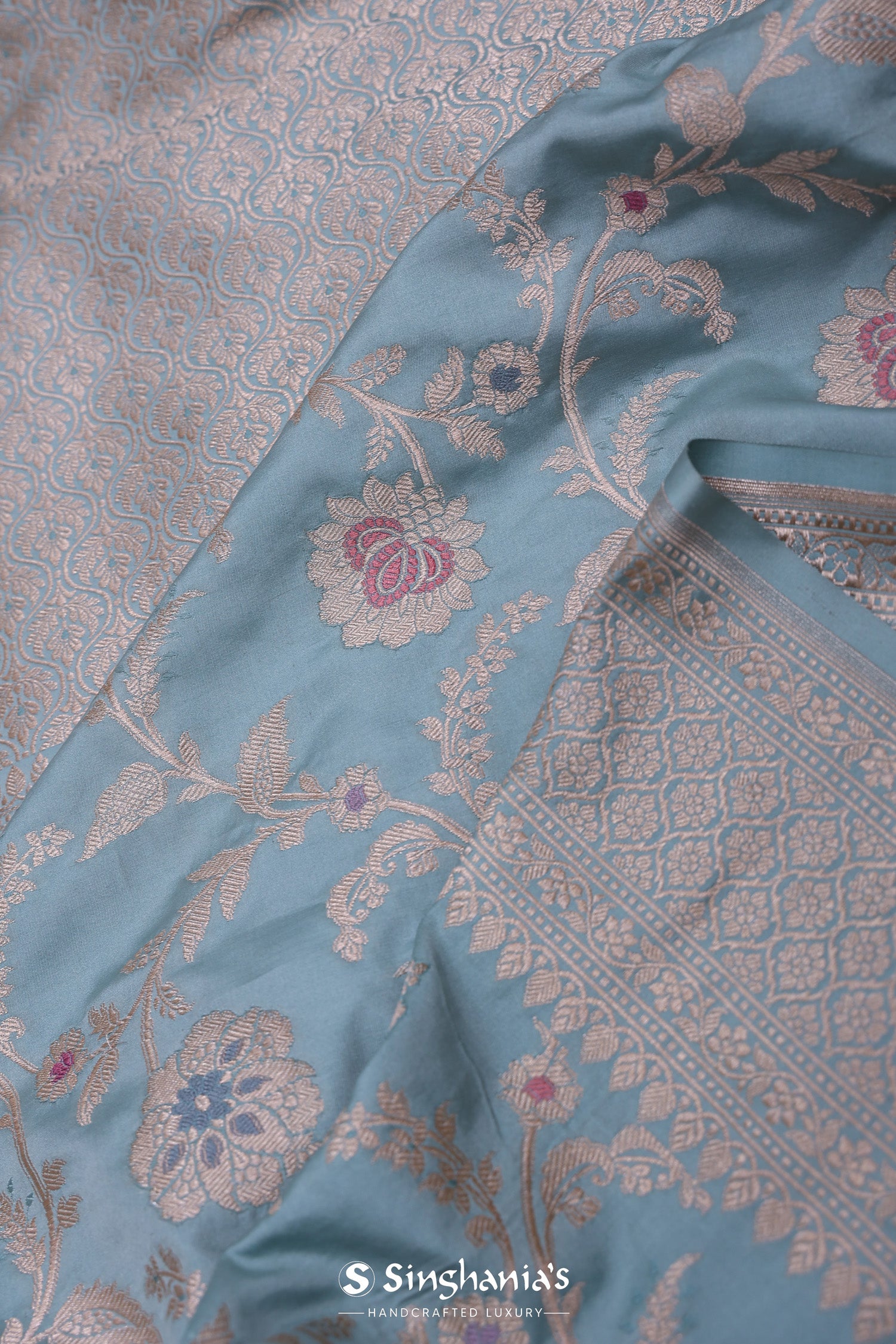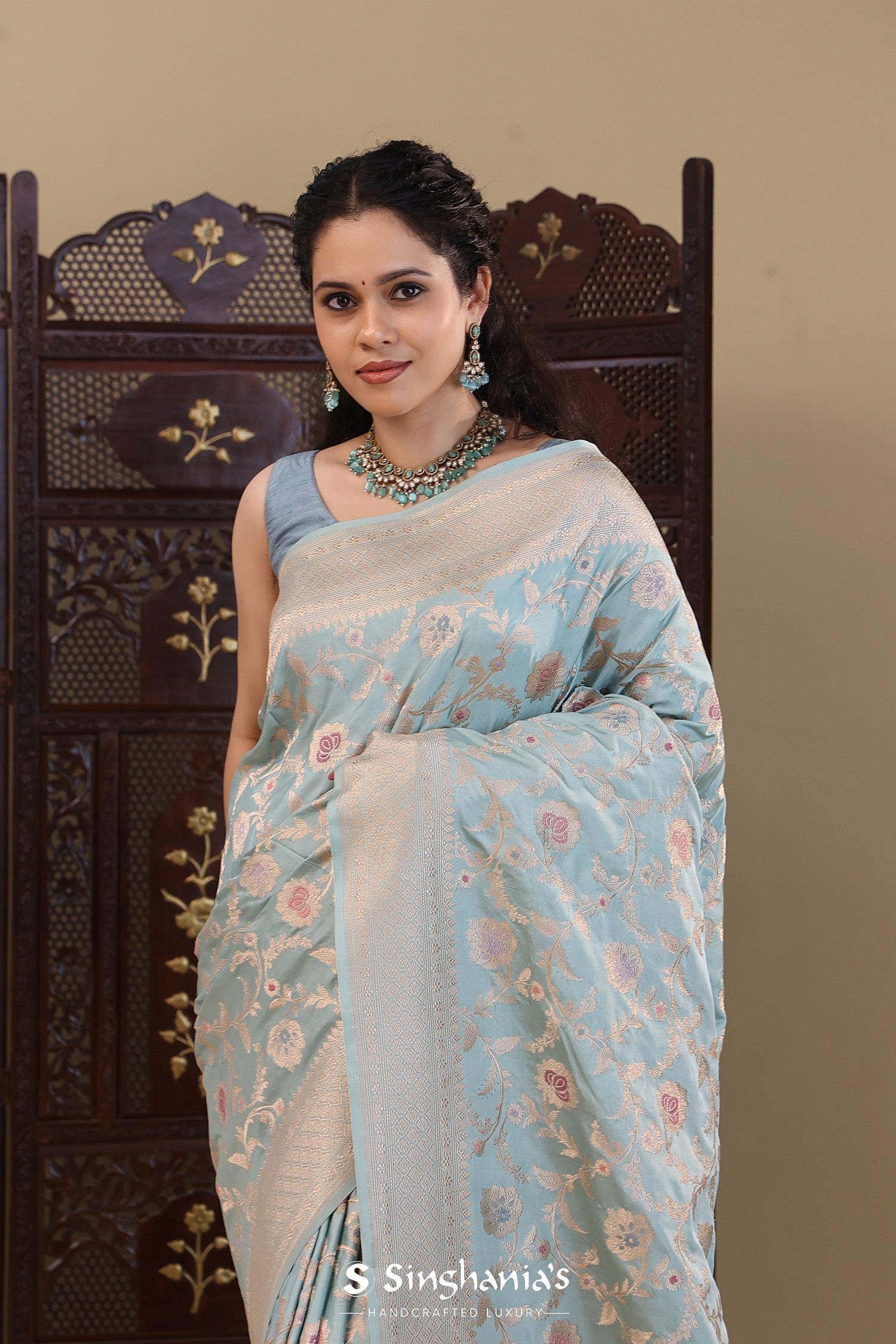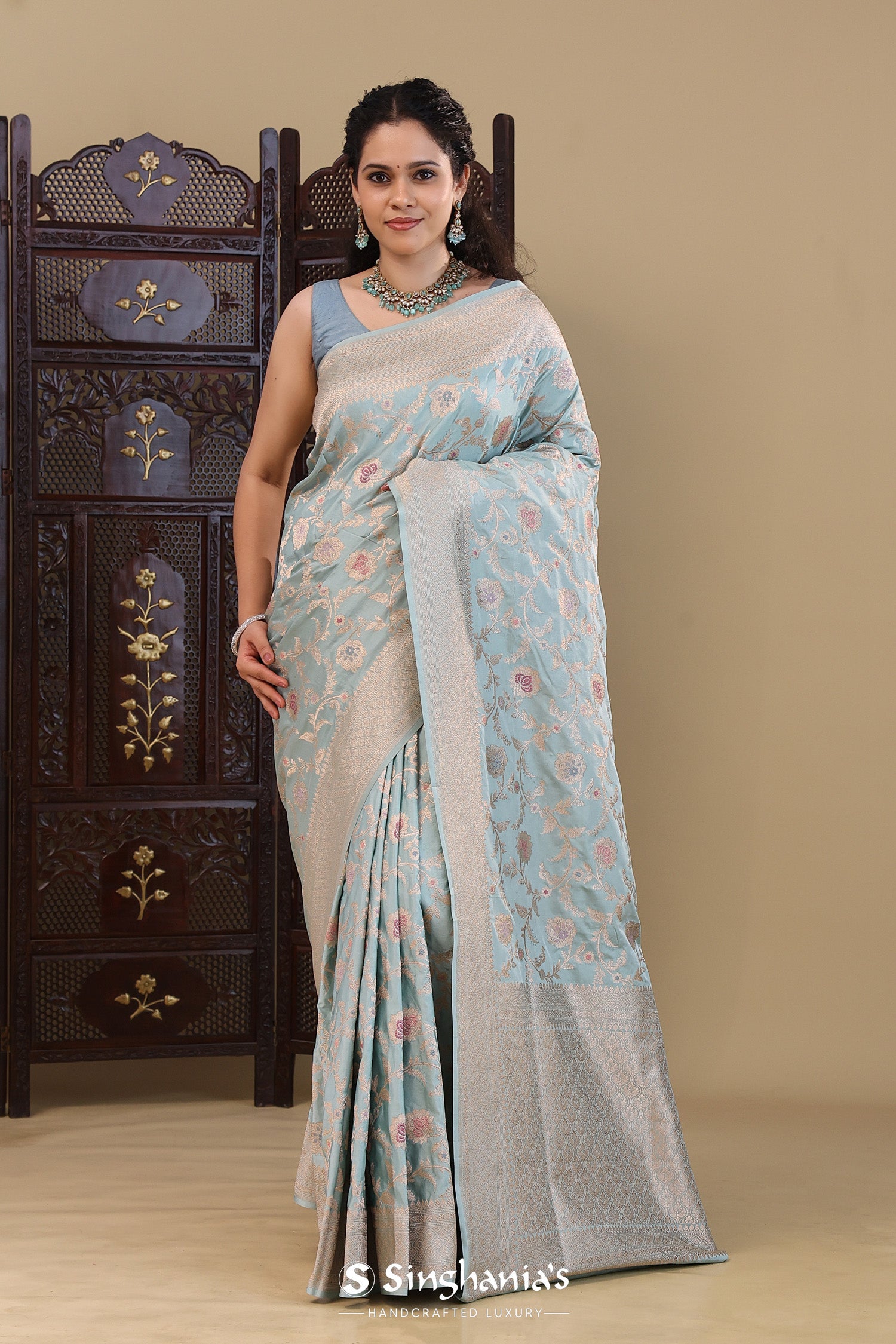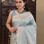 Light Aqua Blue Banarasi Saree With Floral Jaal Work