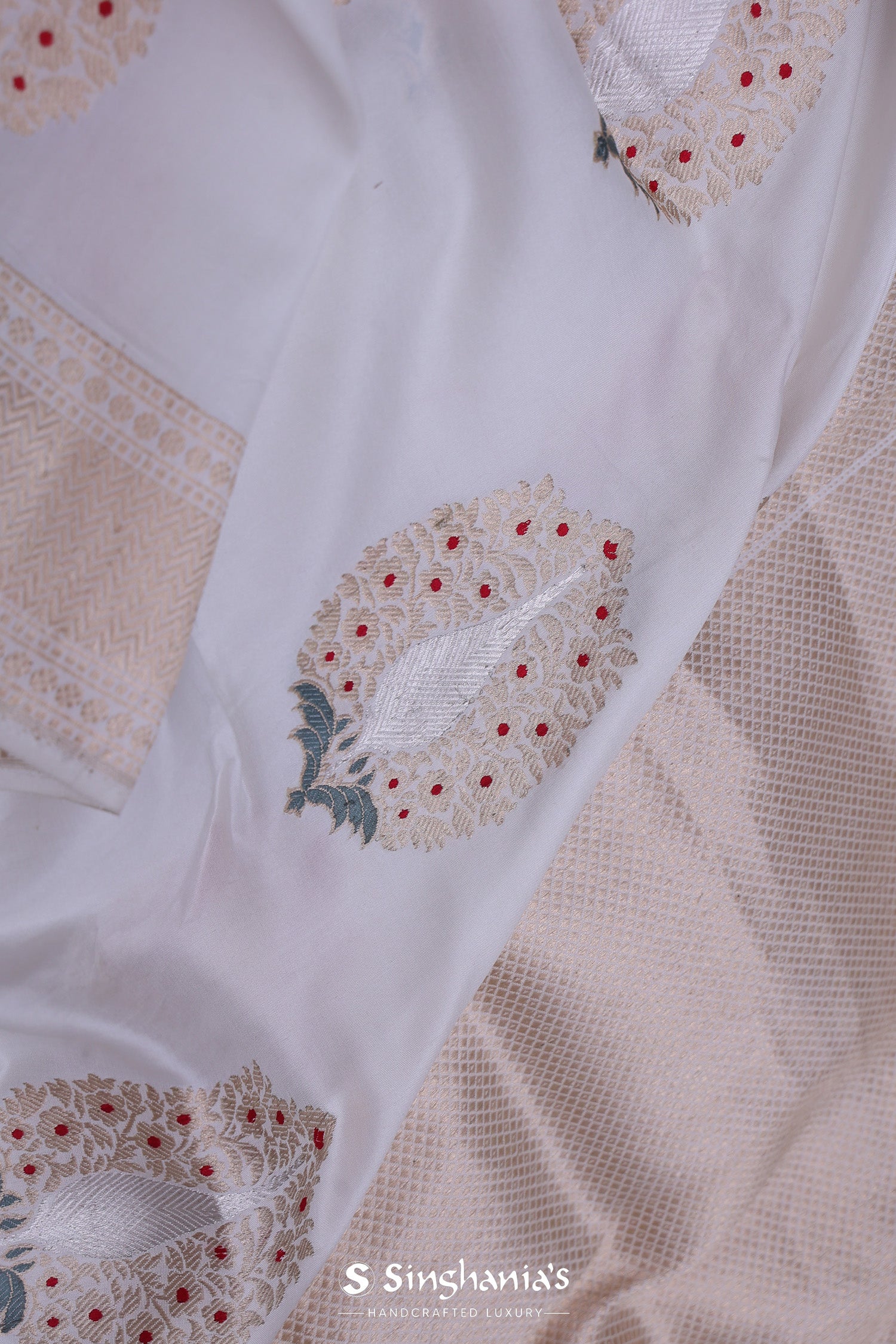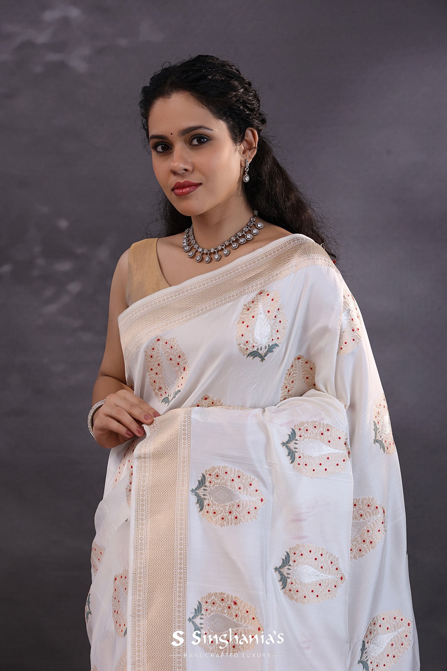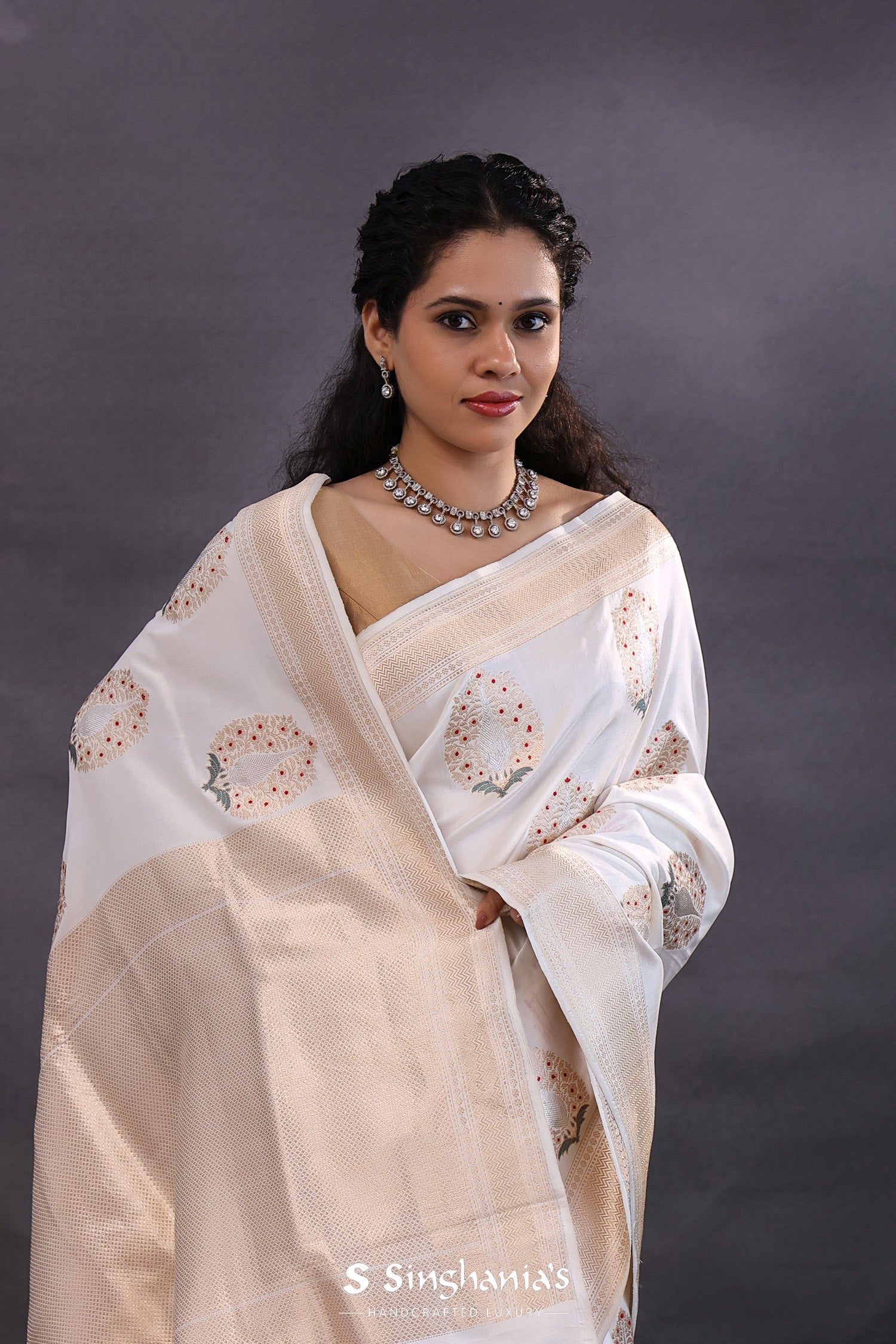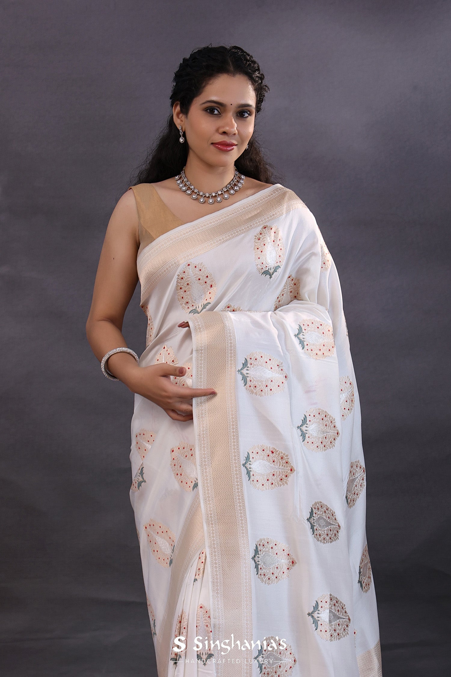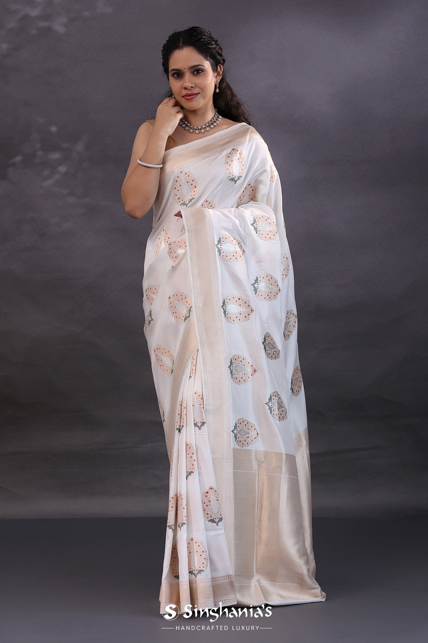 The off-white banarasi silk saree with floral zari meenakari work for a classy rich look.