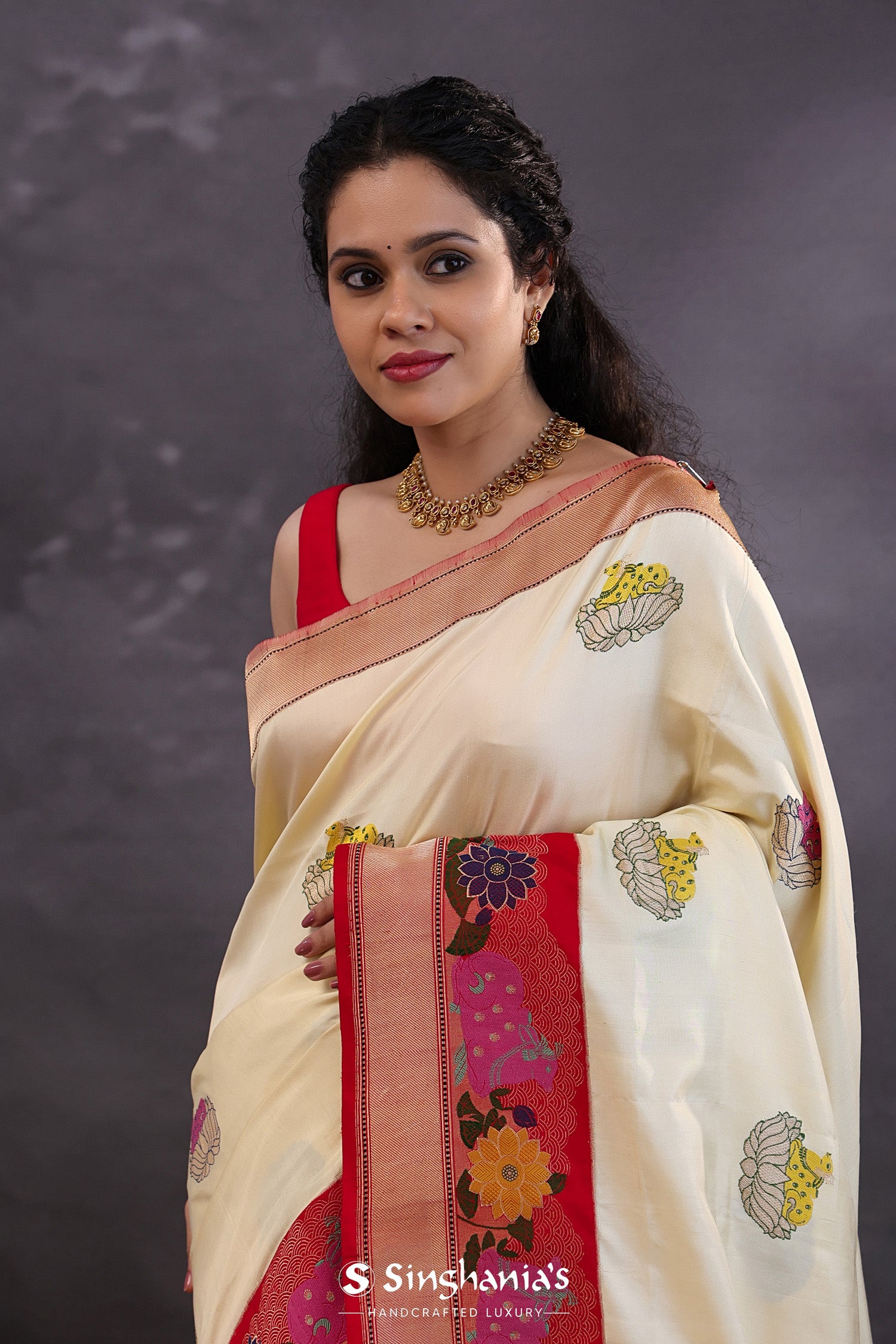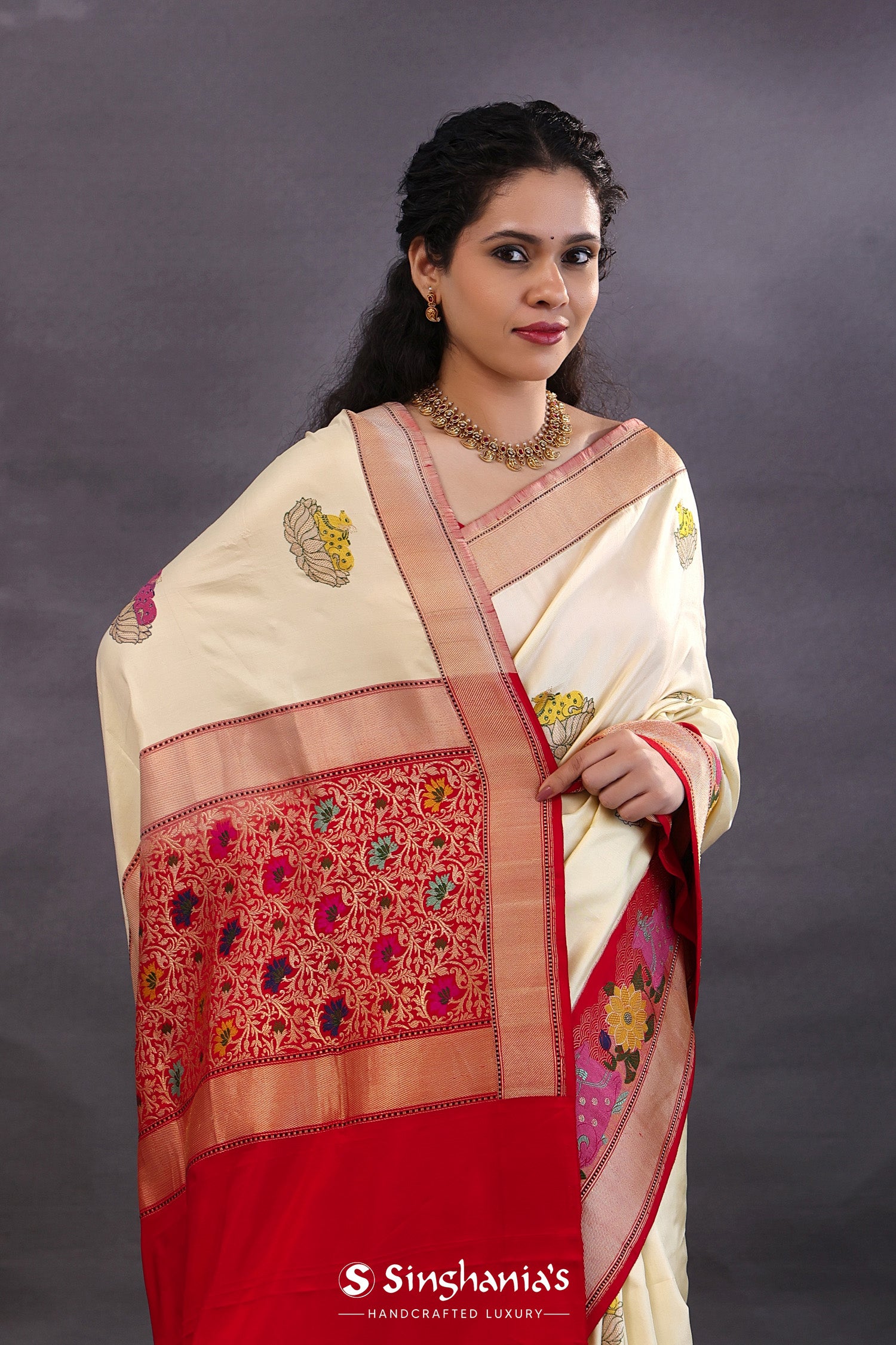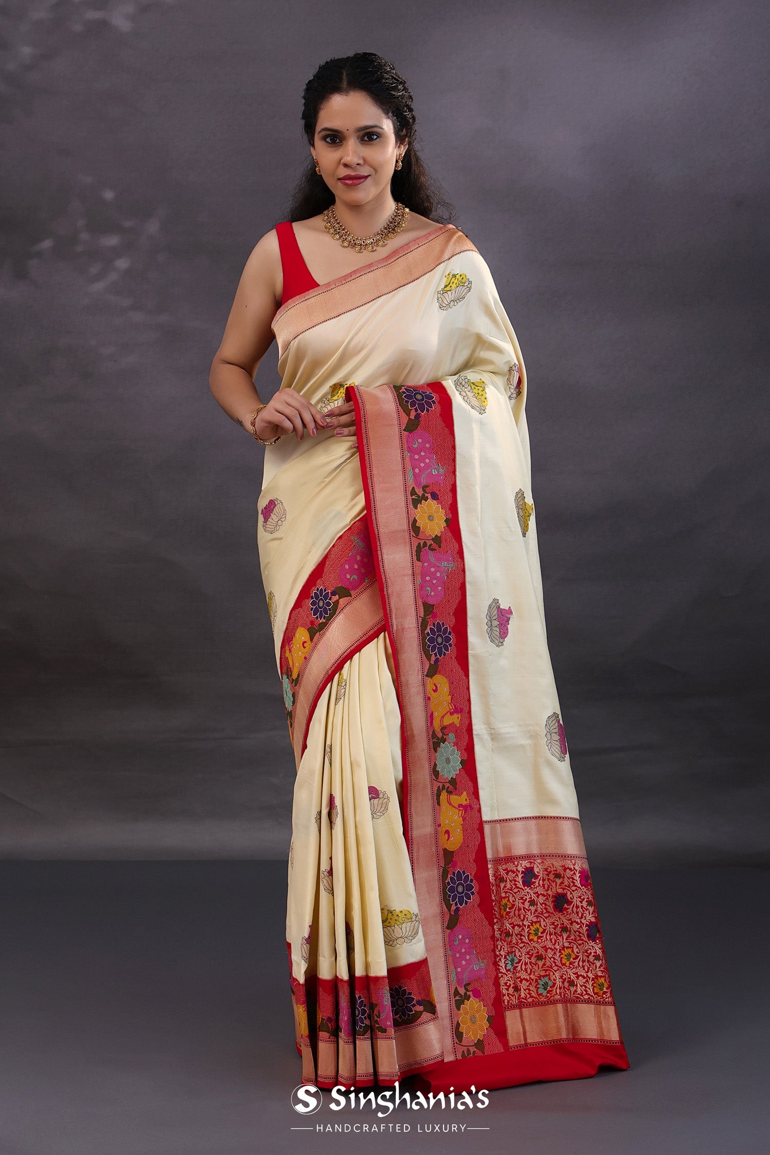 Pair with minimal jewellery and soft makeup to highlight the timeless elegance Singhaniaβs is known for.