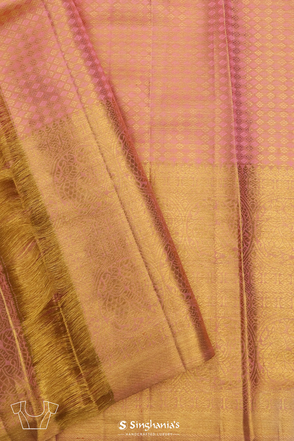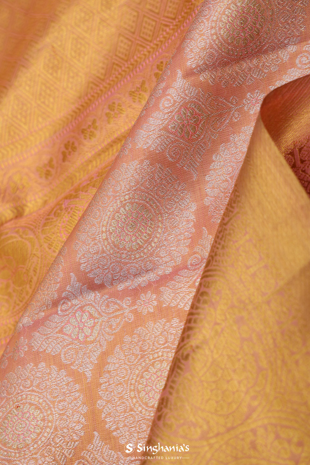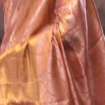 A melon peach kanjivaram silk saree featuring the floral butta woven in gold and silver zari. The broad border displays floral-peacock patterns, while the pallu boasts an elaborate arrangement of floral vines. Ideal for traditional ceremonies and festive gatherings.