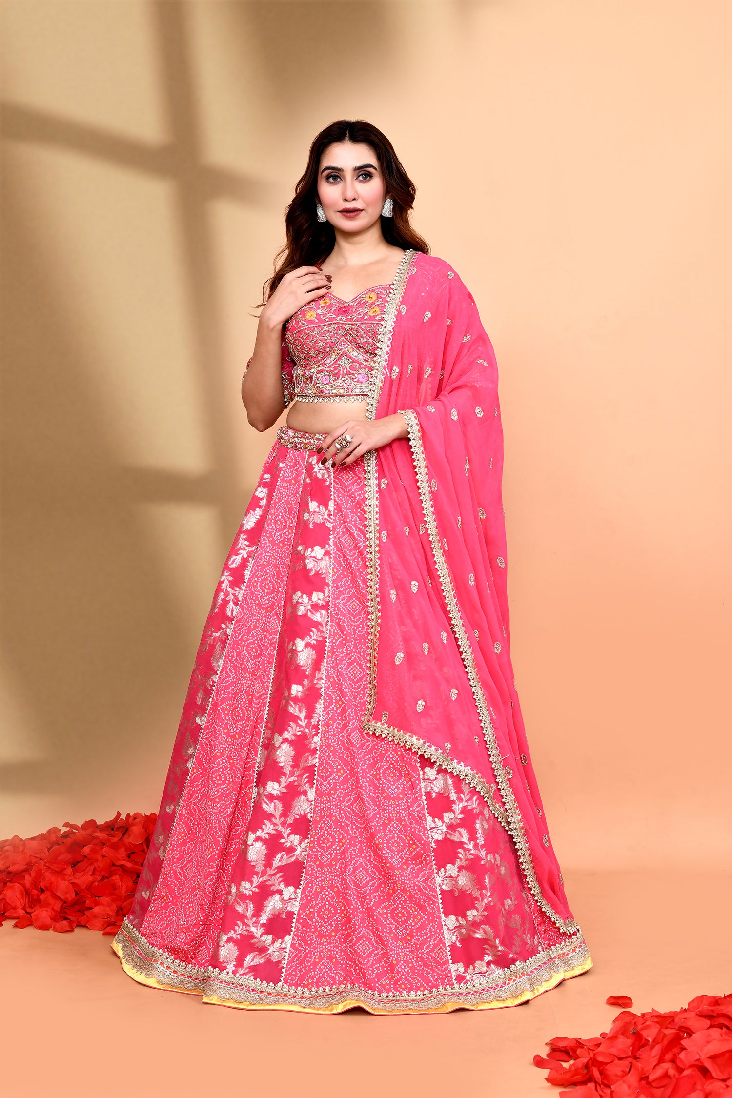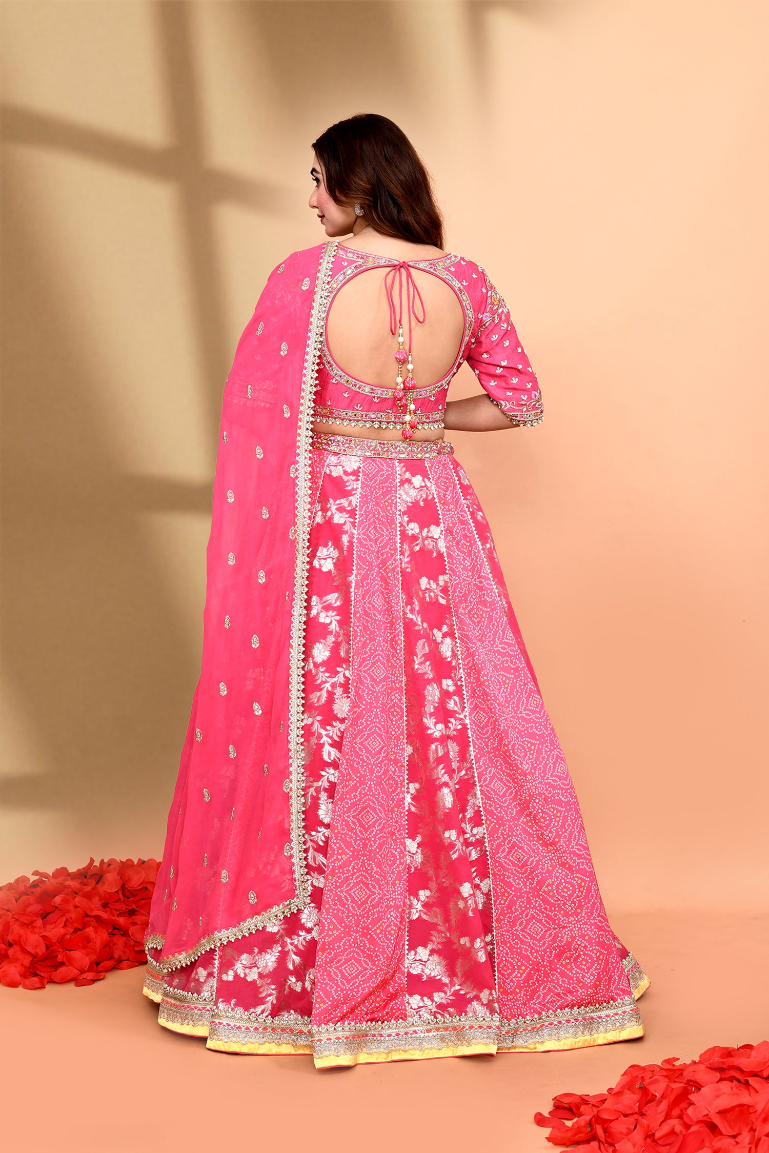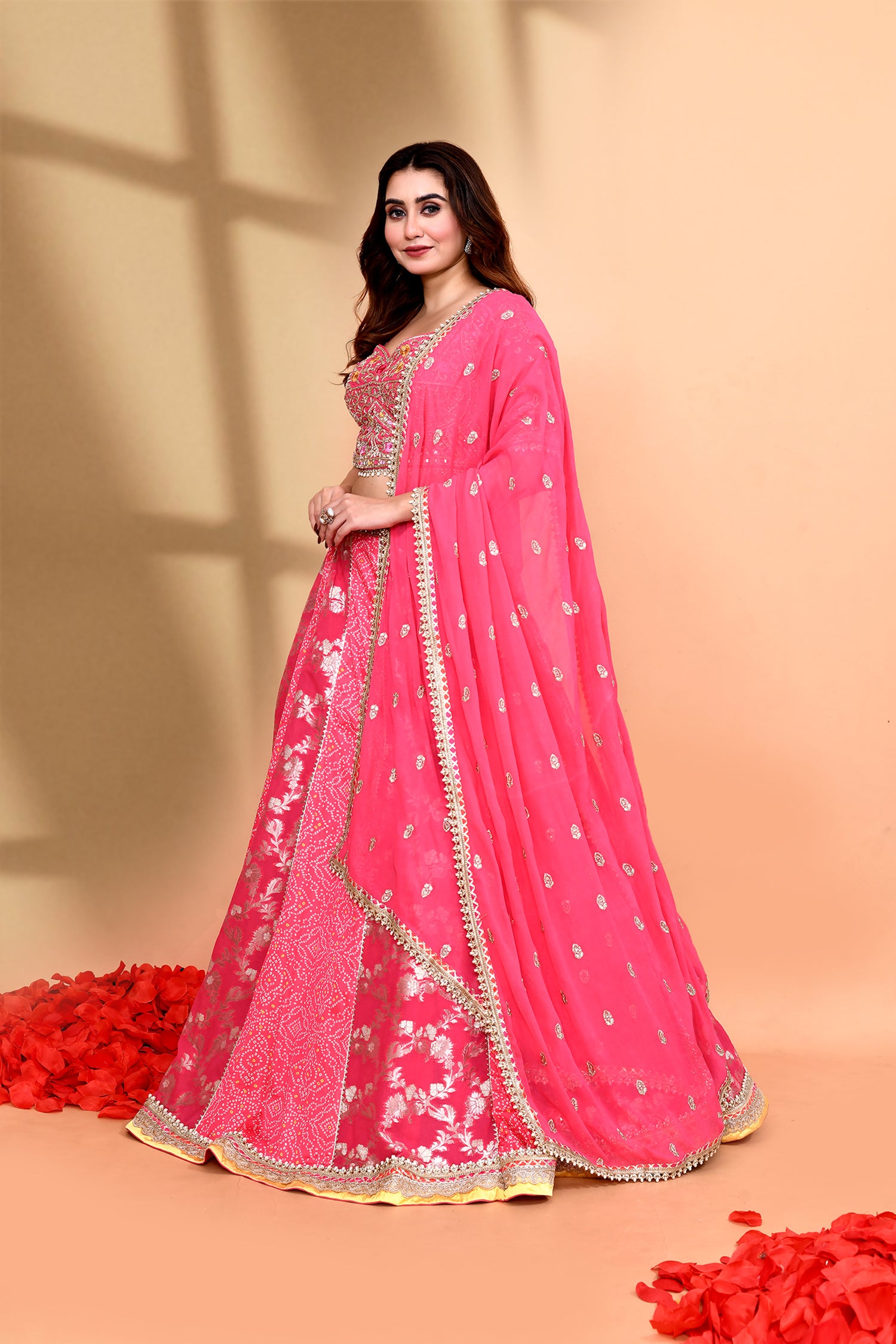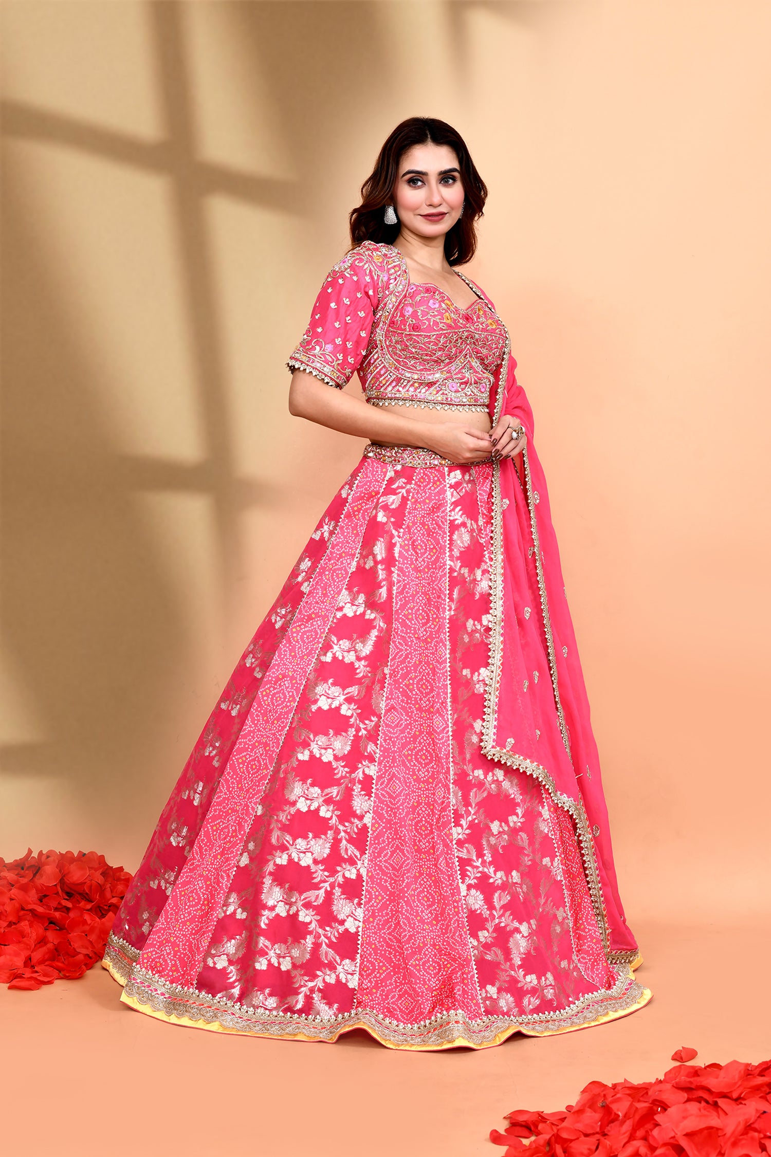 The hot pink silk floral printed lehenga set with bandhani and floral print along with georgette dupatta and raw silk blouse for a beautiful look.