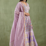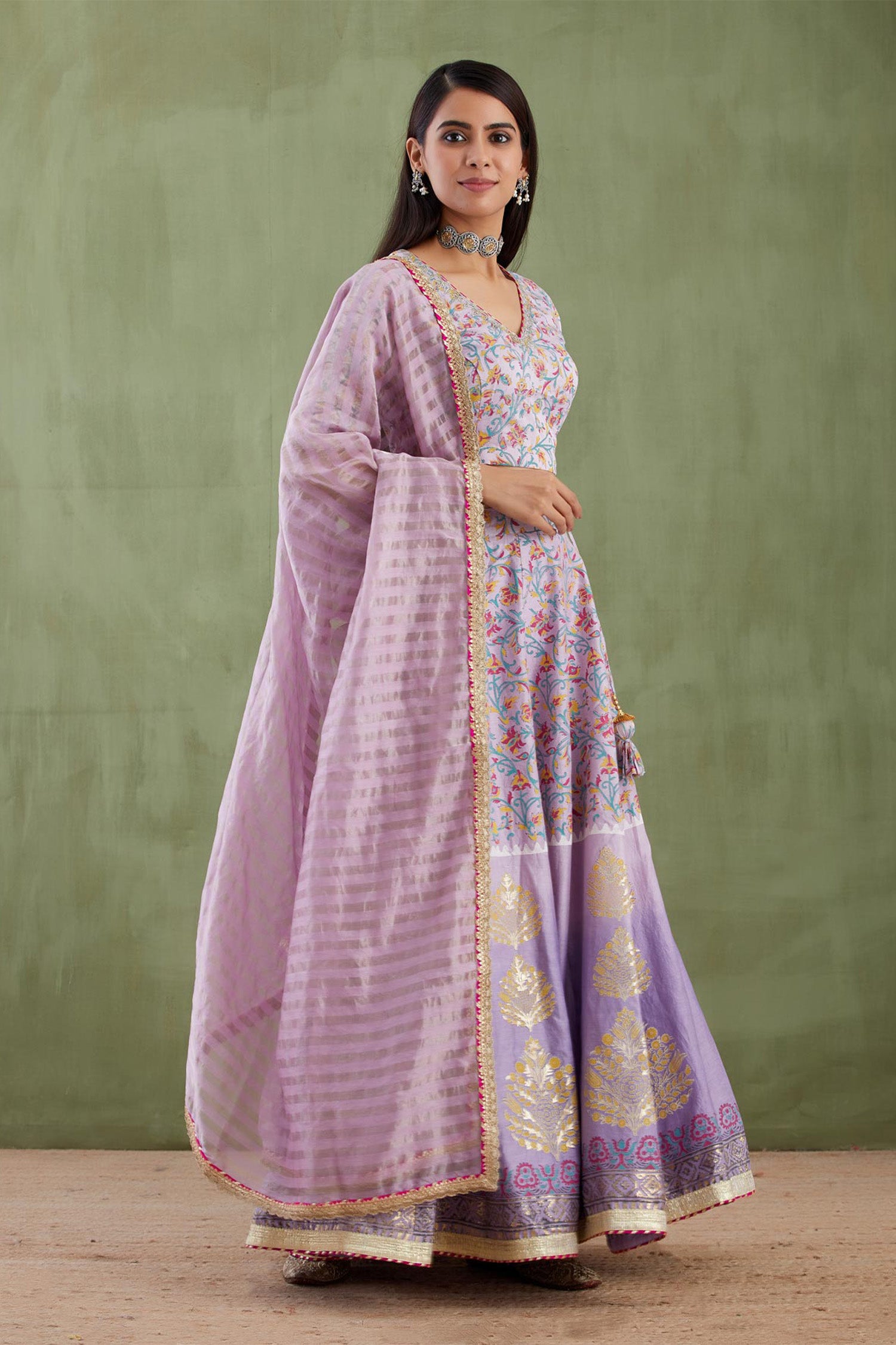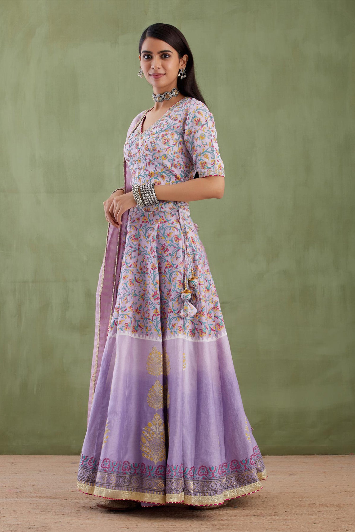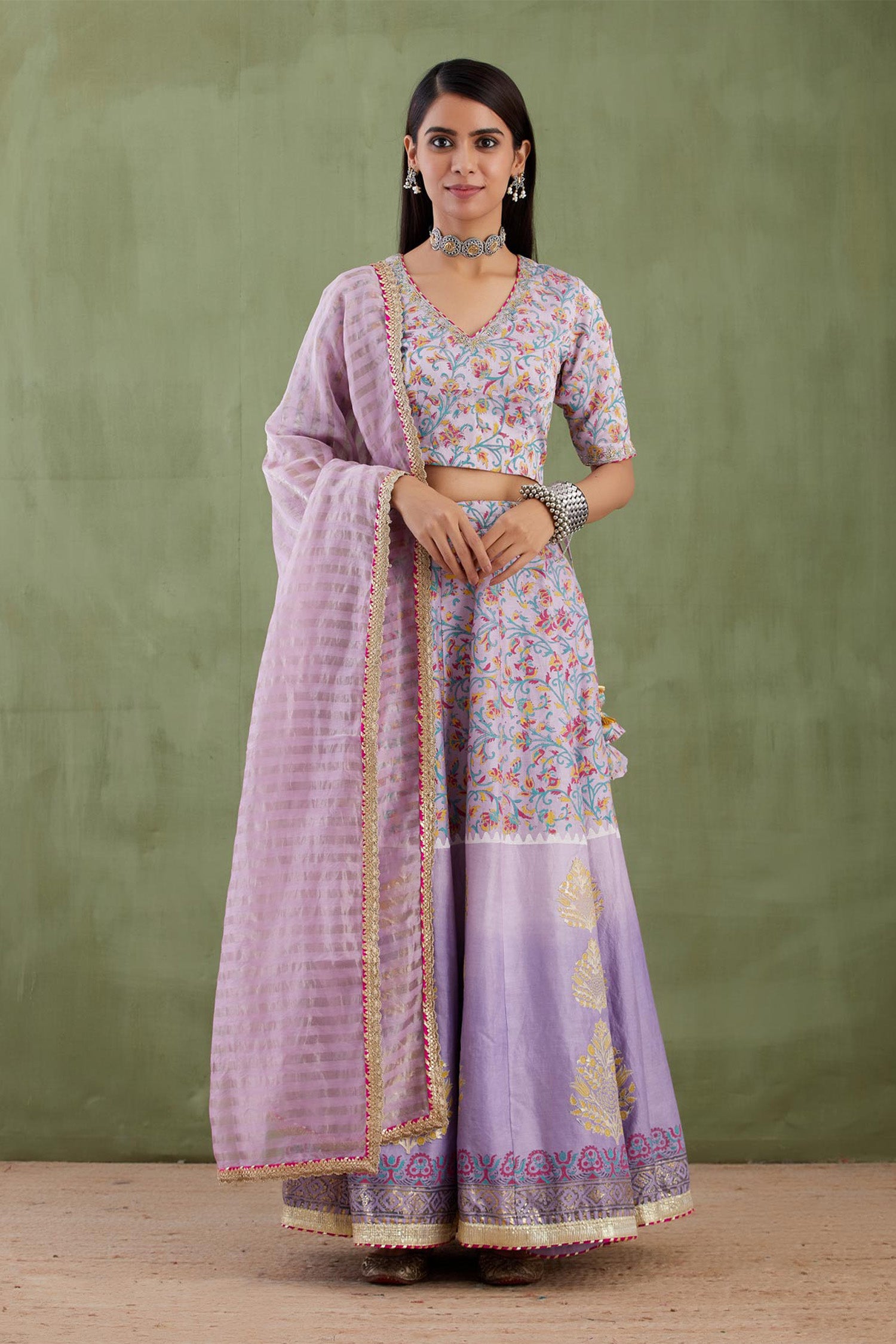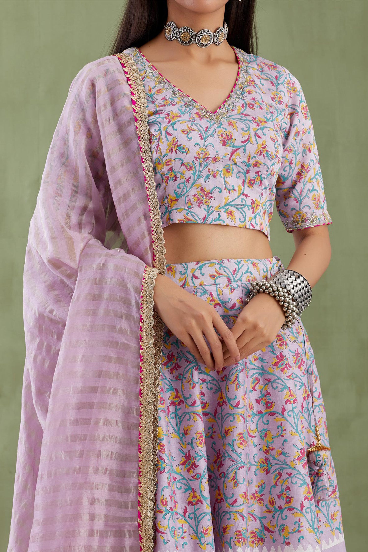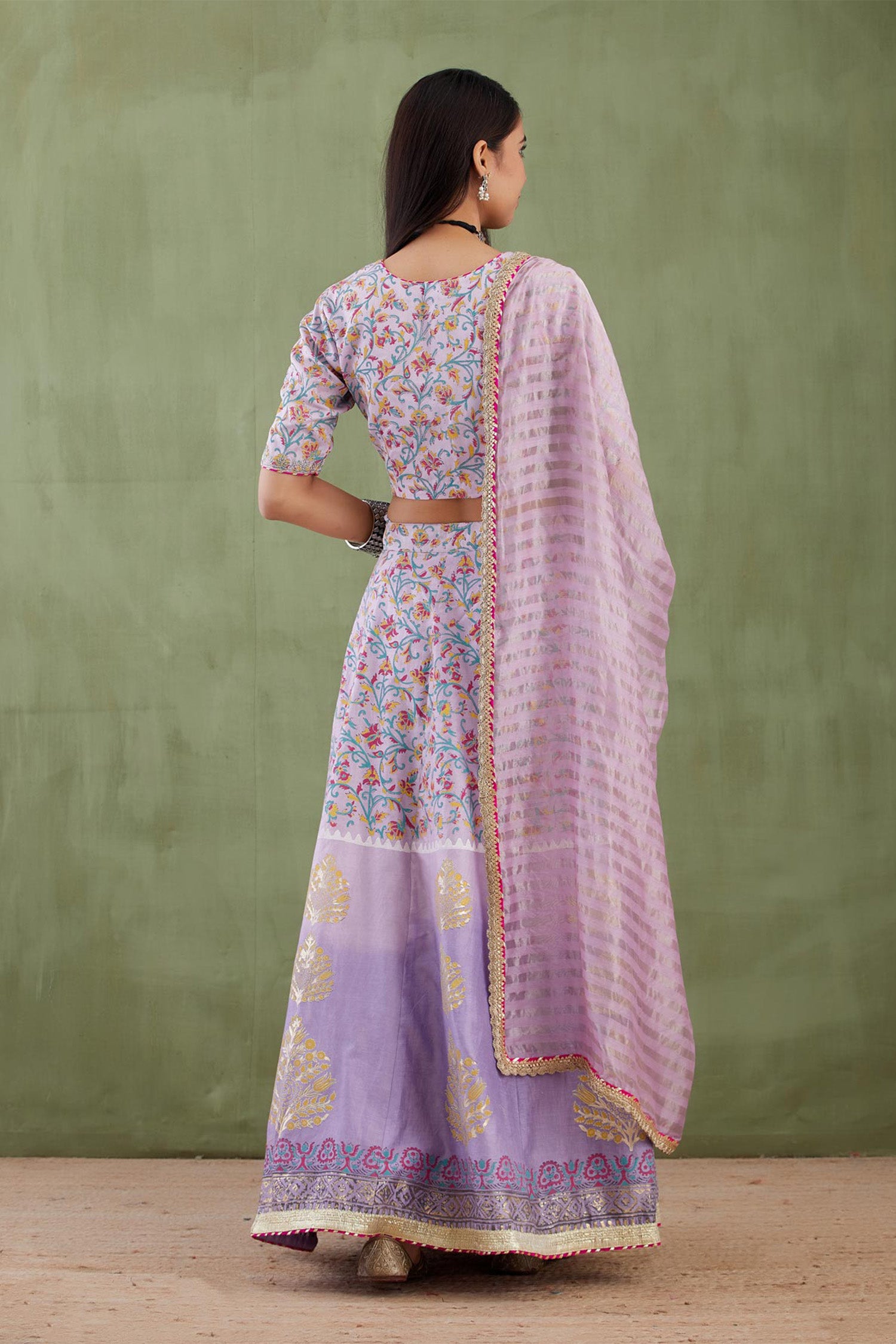 The beautiful lilac colour foil hand block printed chanderi lehenga with a matching dupatta and a skirt adorned with floral prints for the comfortable, neat and traditional charm.