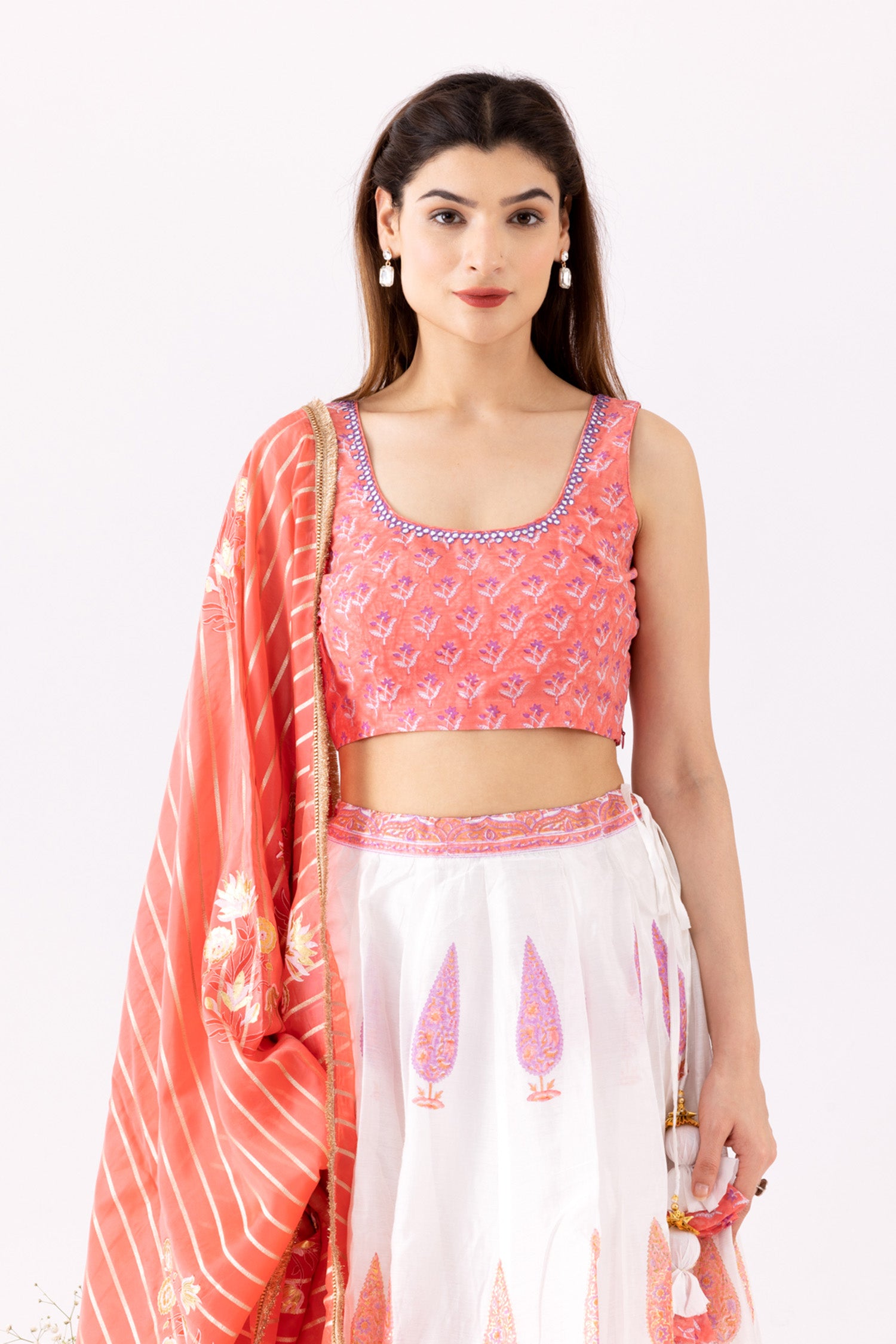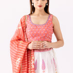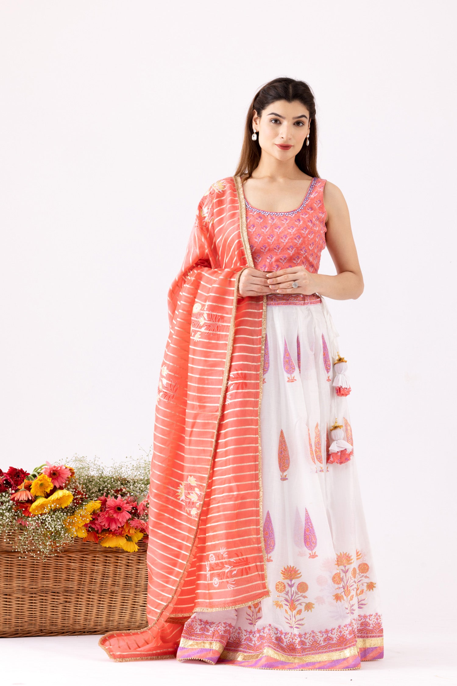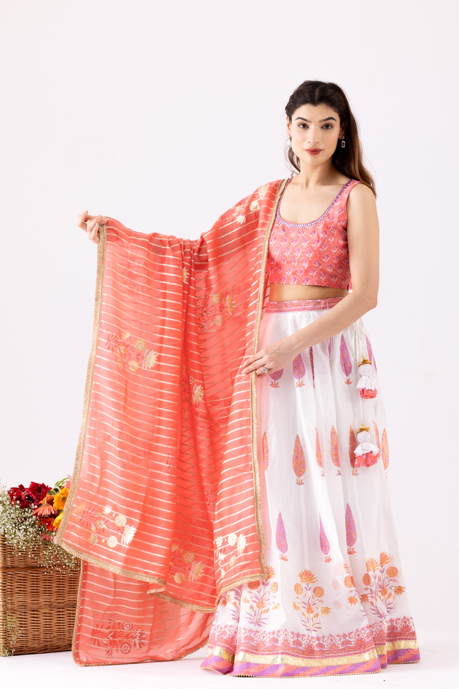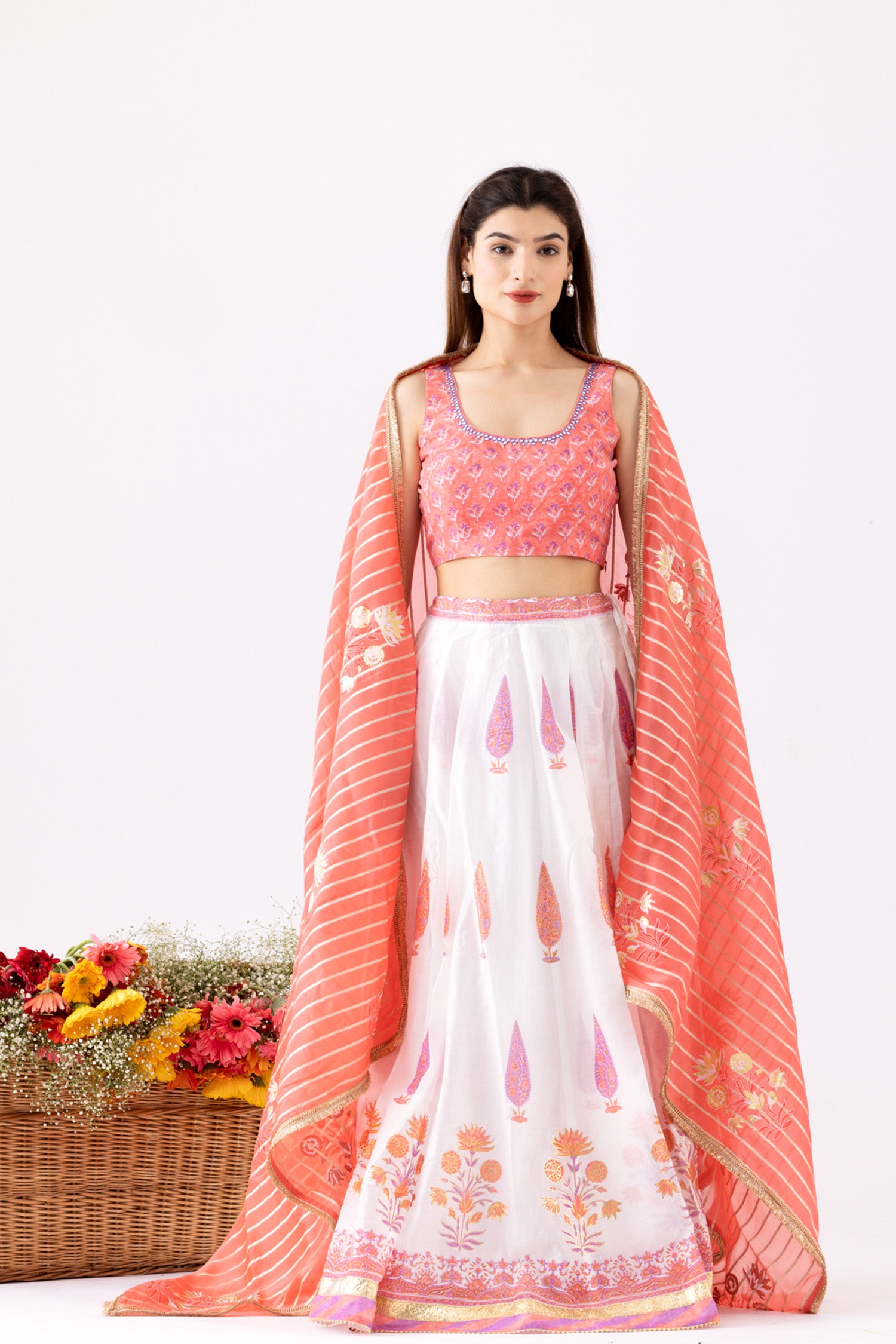 The Lehenga set with an foil print Lehenga and a Sleeveless Blouse with a mirror work Round Neck along with a striped Organza dupatta for a Classic and traditional look.