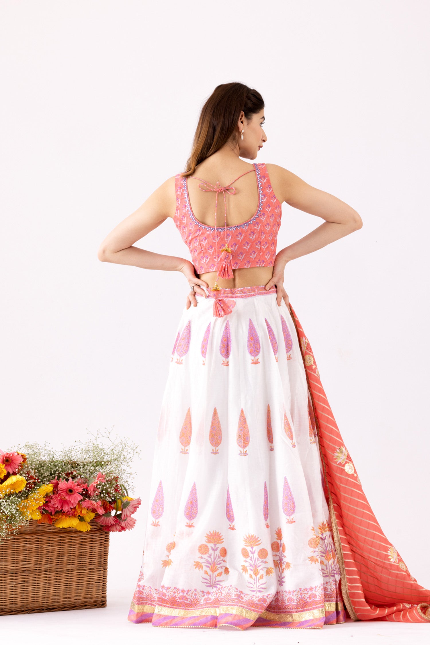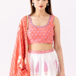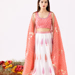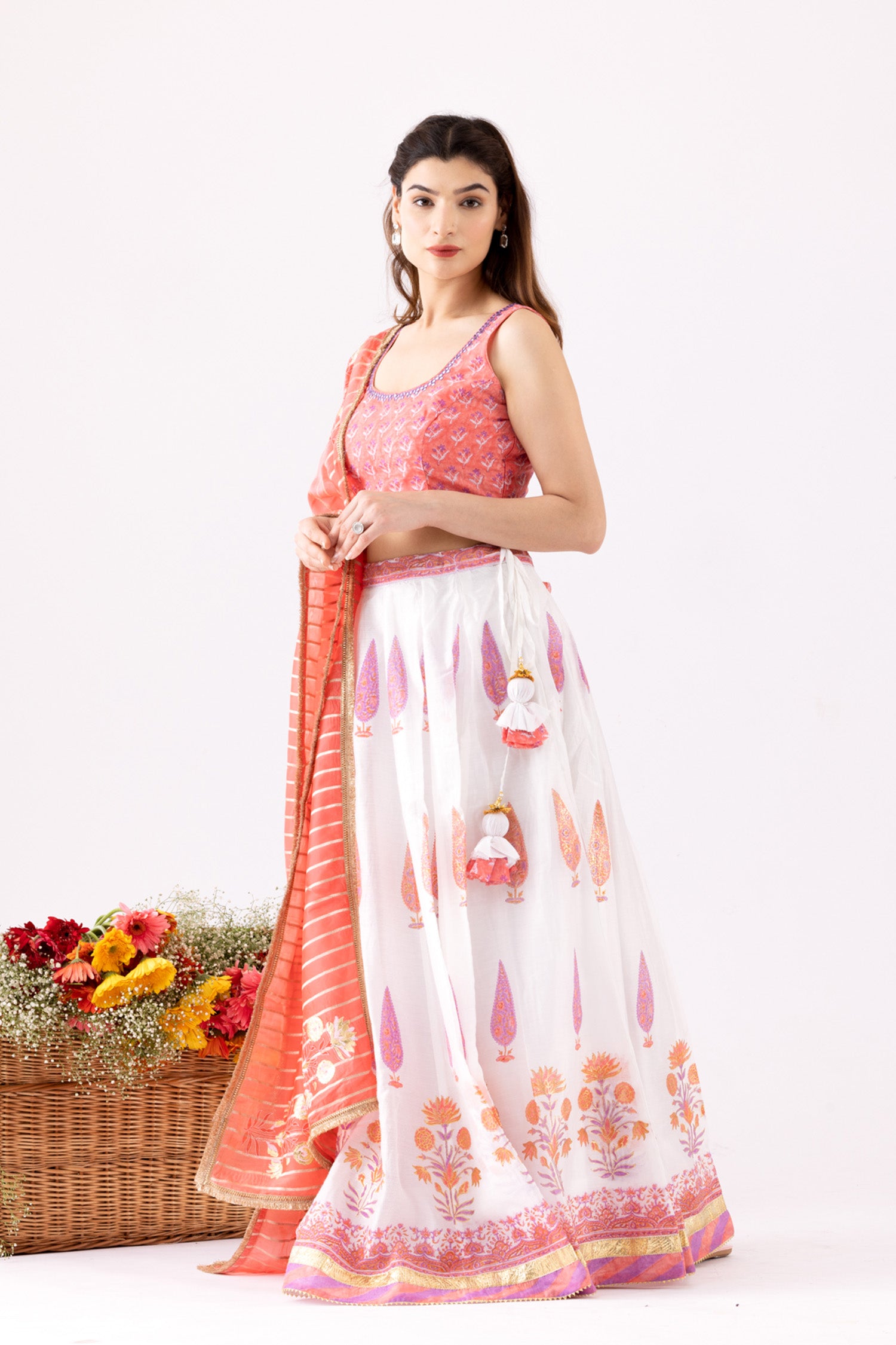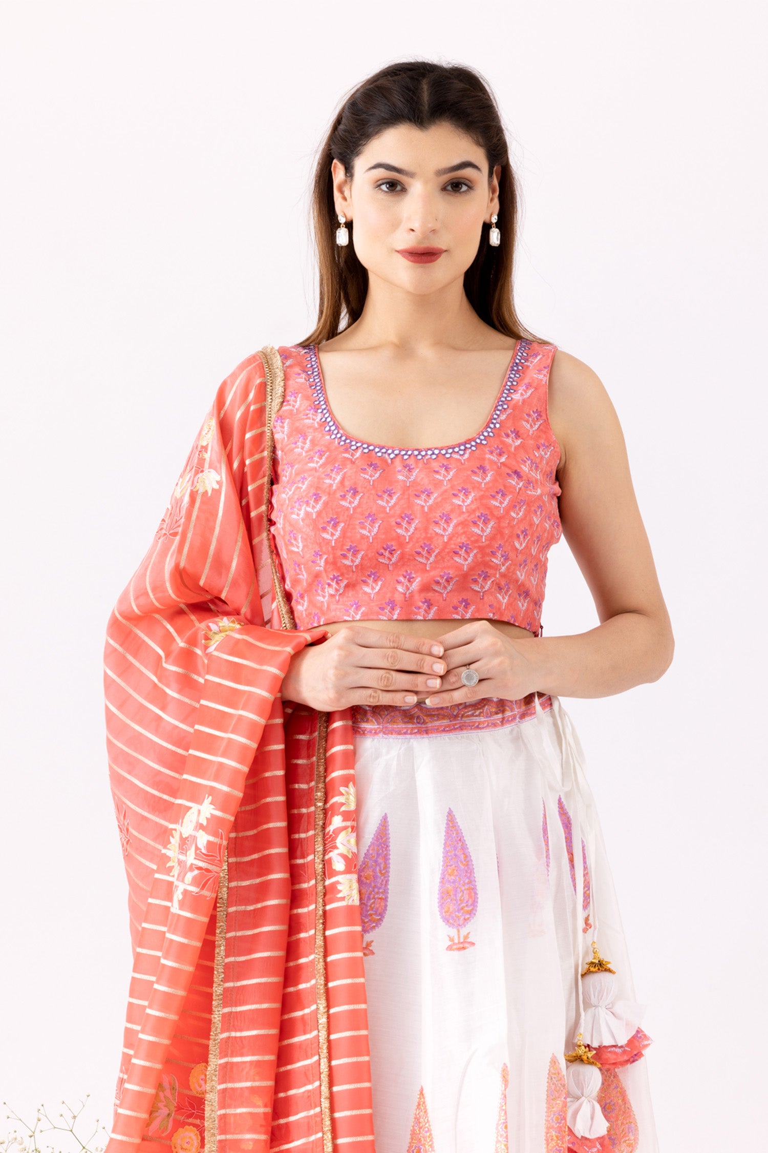 The Lehenga set with an foil print Lehenga and a Sleeveless Blouse with a mirror work Round Neck along with a striped Organza dupatta for a Classic and traditional look.