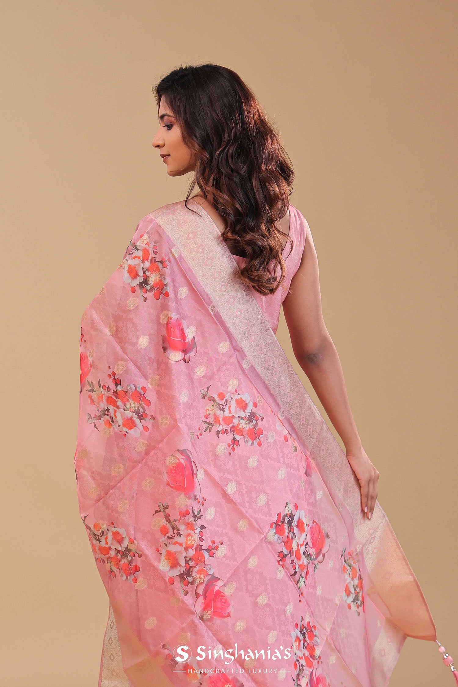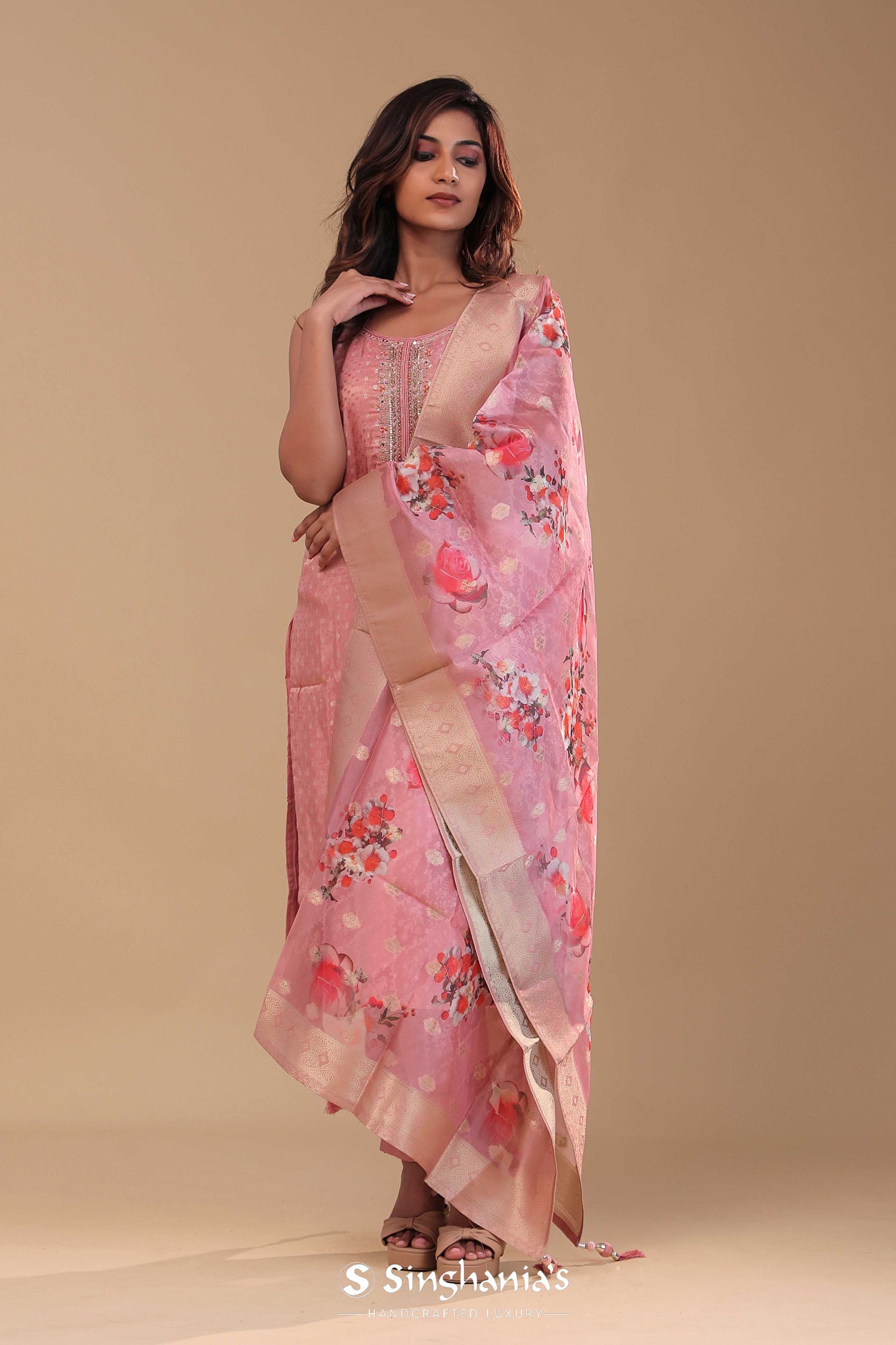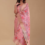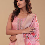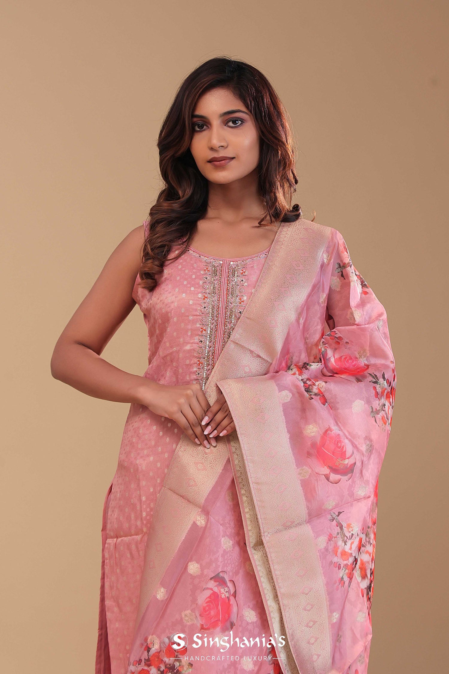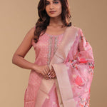 Light pink chanderi silk kurta set features round neckline kurta with woven butti's along straight leg. The organza dupatta with banarasi border and floral prints adds the finishing touch to the entire garment