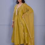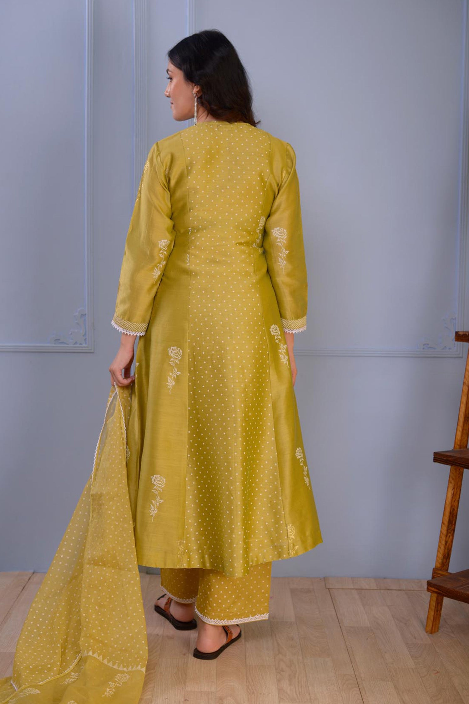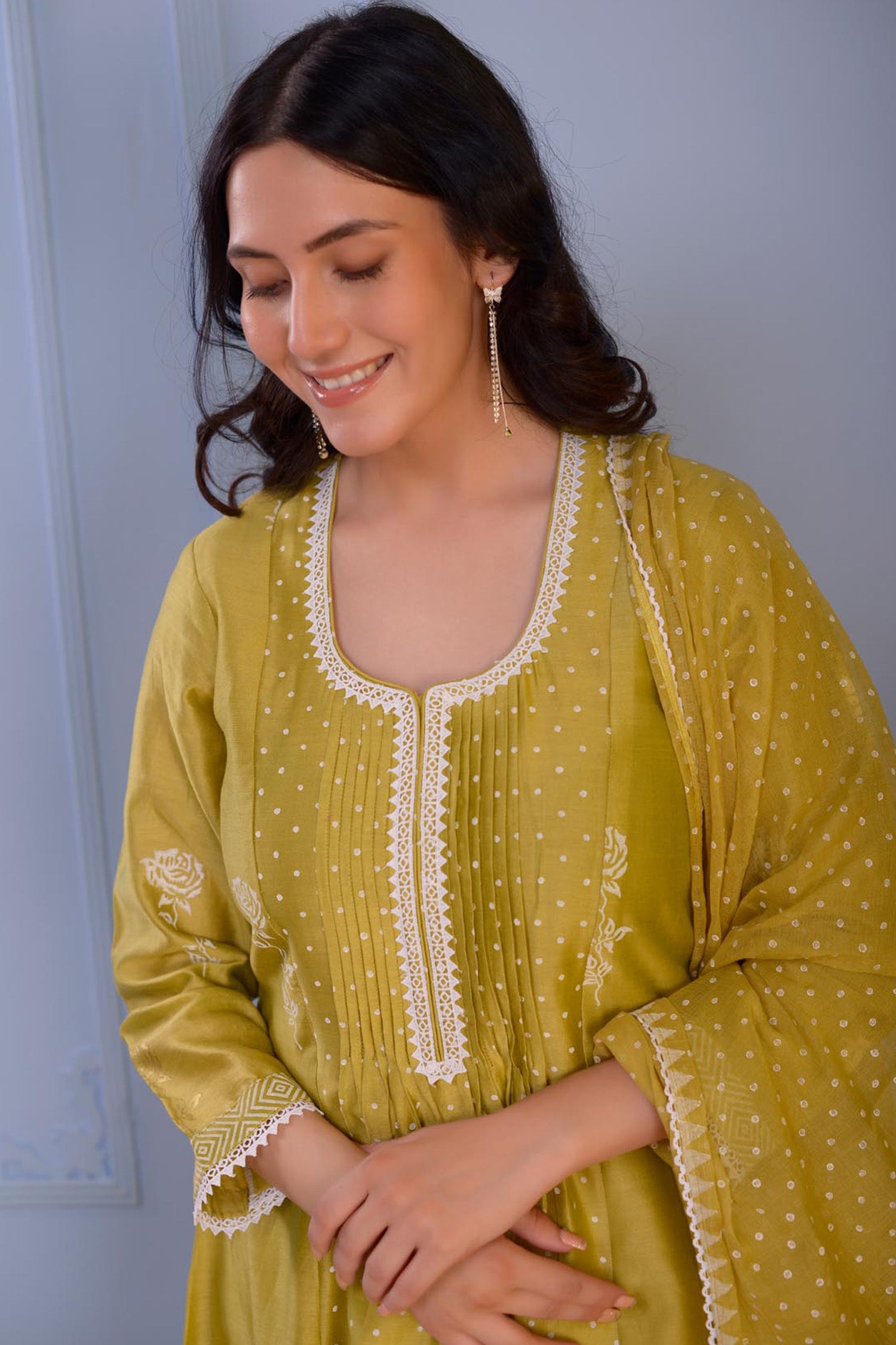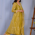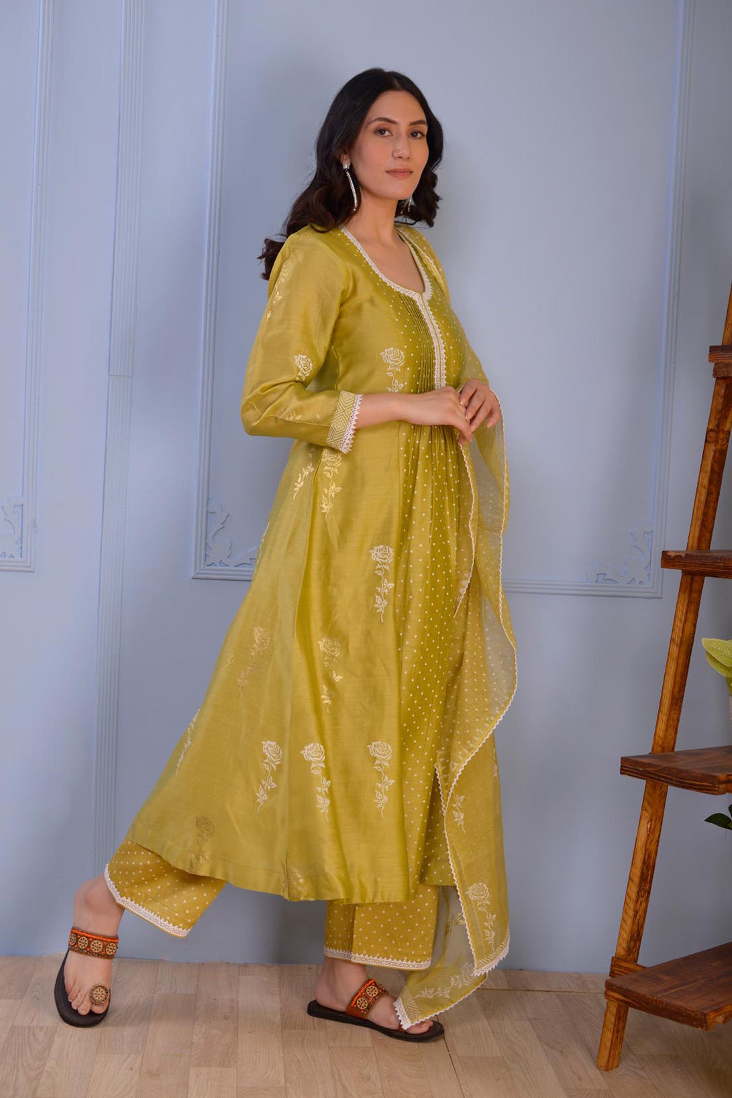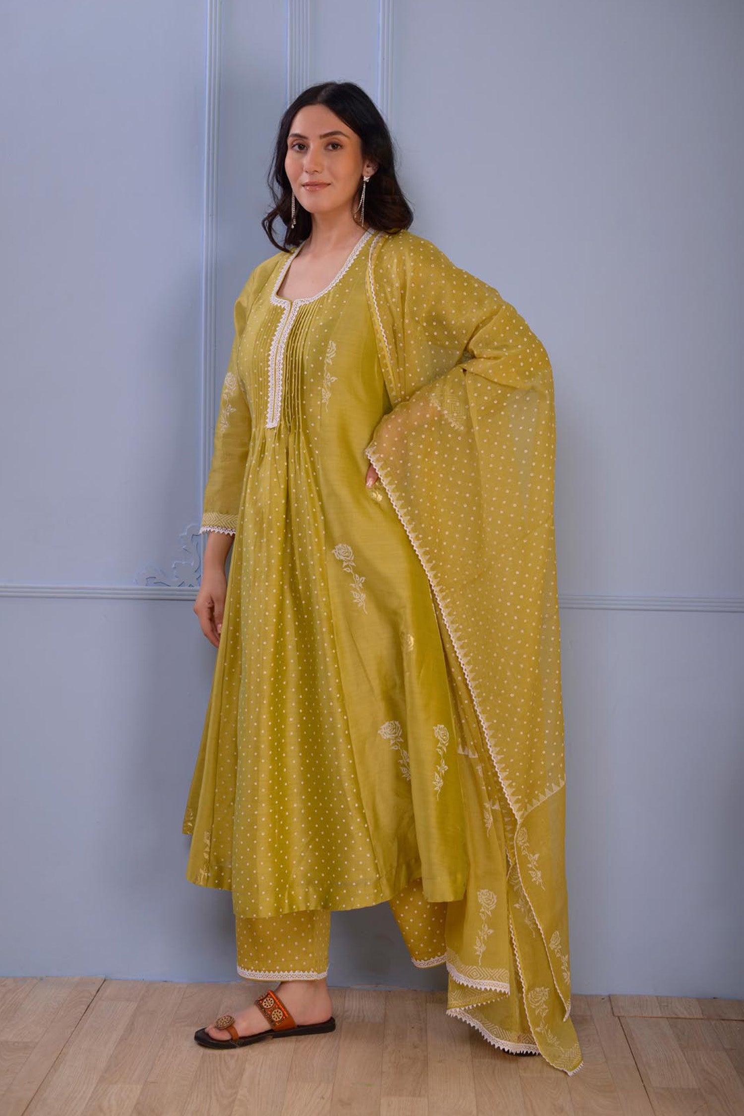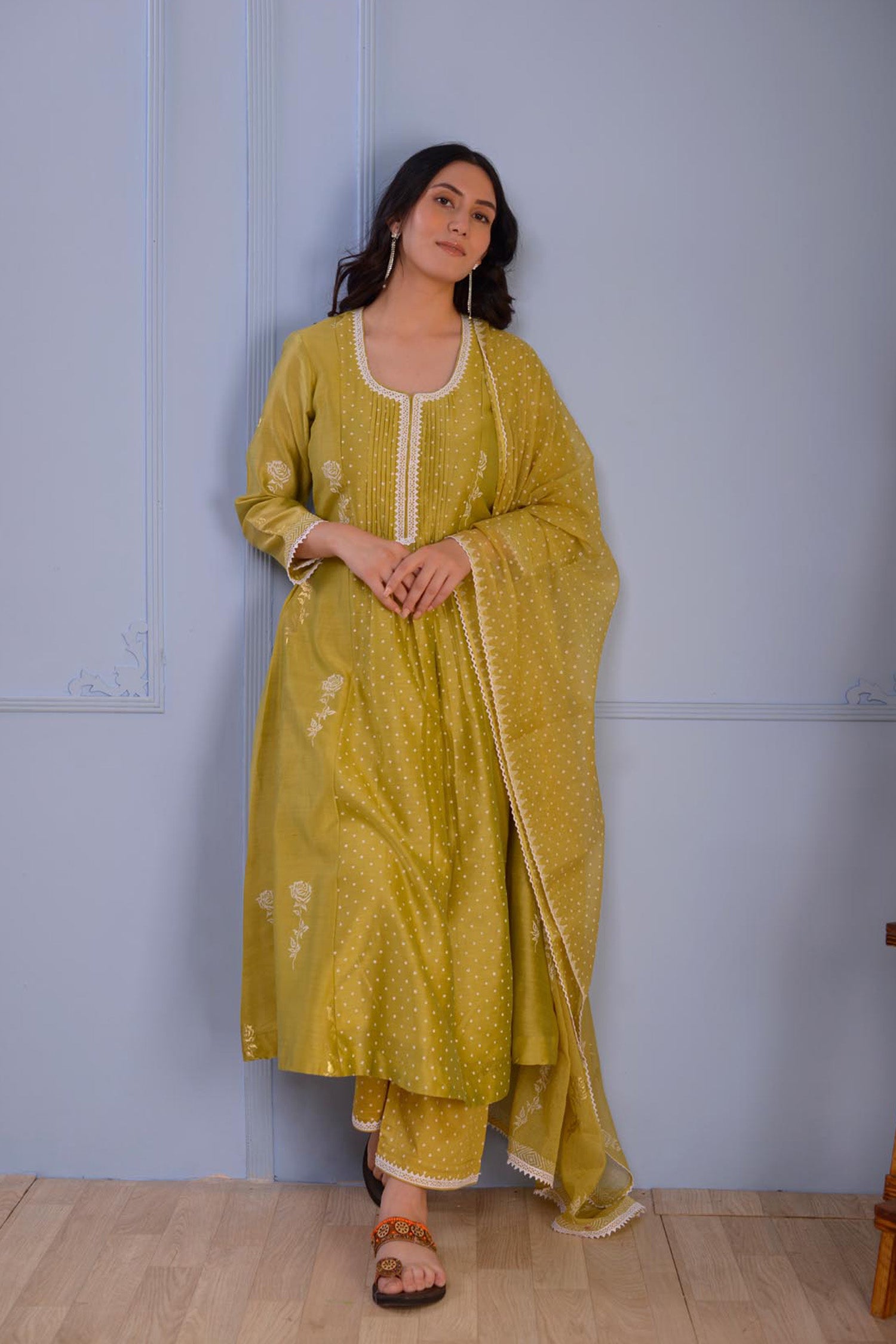 The Chanderi straight kurti set with floral design and the matching pants and dupatta for a casual yet dignified look along with the stylish comfort