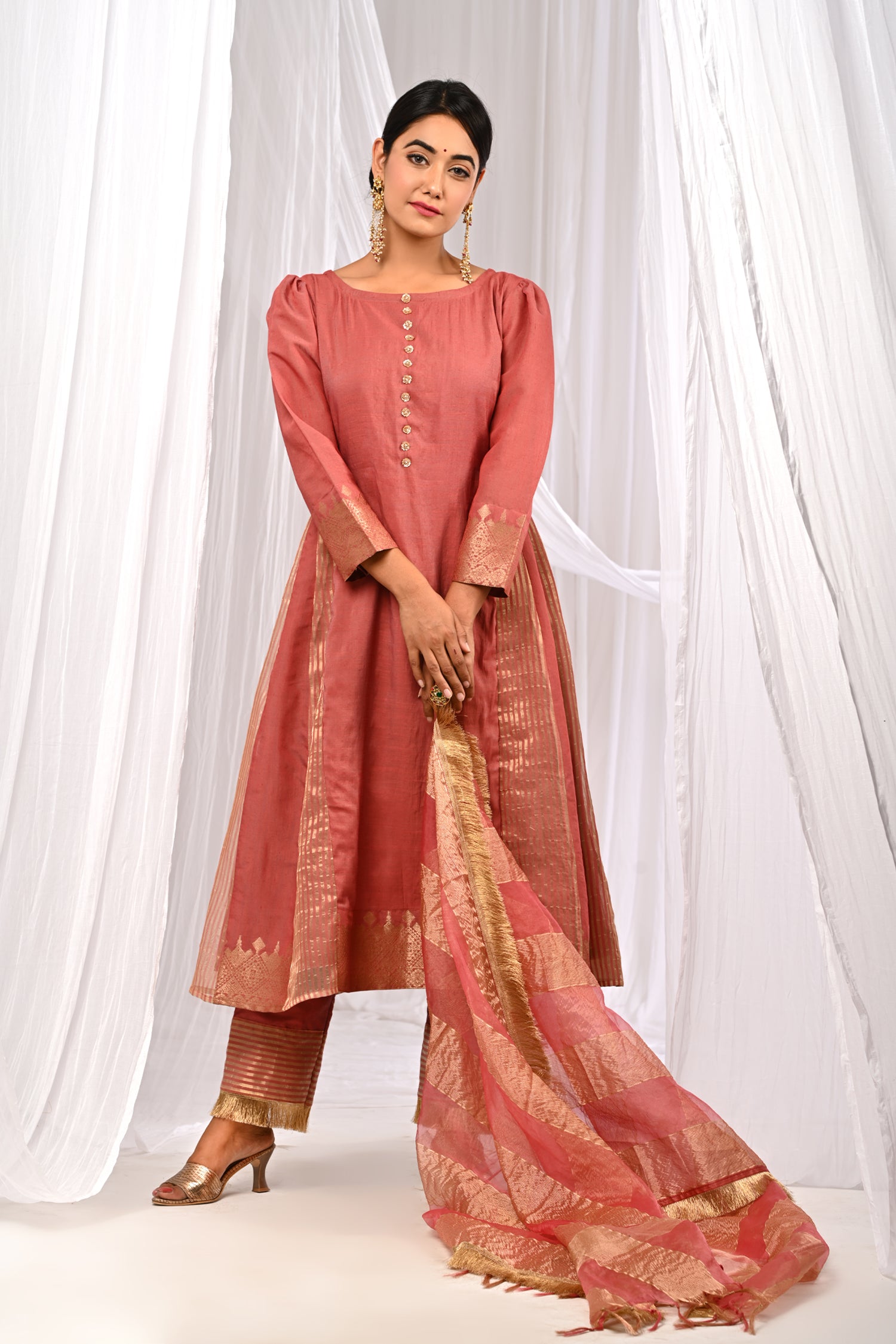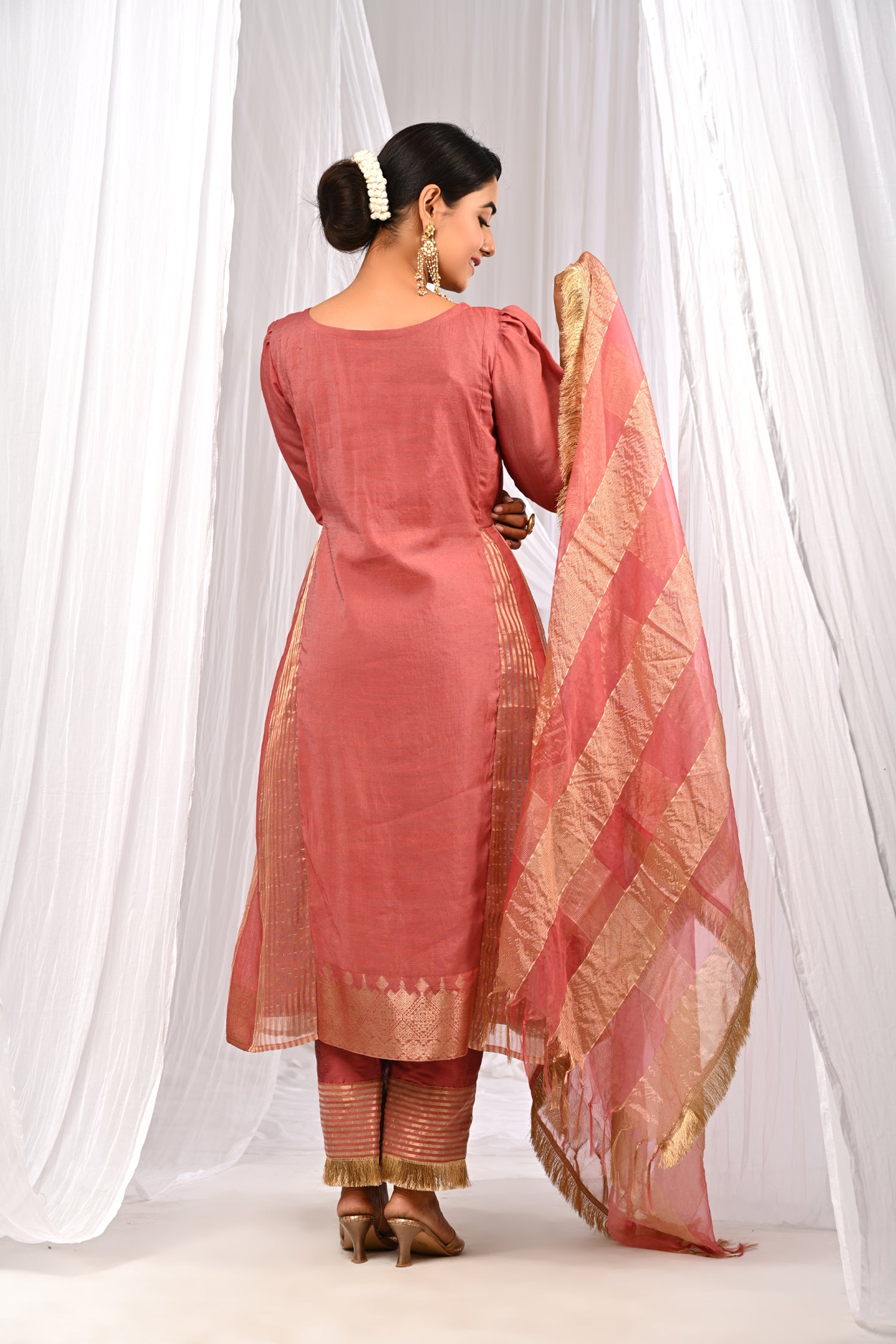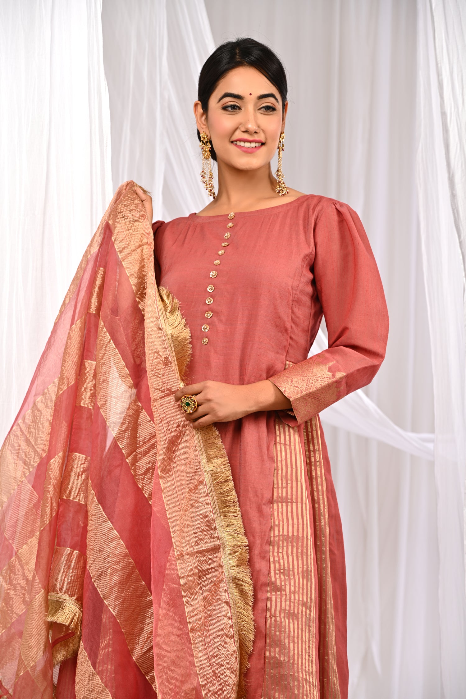 The peach kurta set with antique zari detailing with rich luxurious fabrics like chanderi and cotton silk for a vibrant look in any occasion.