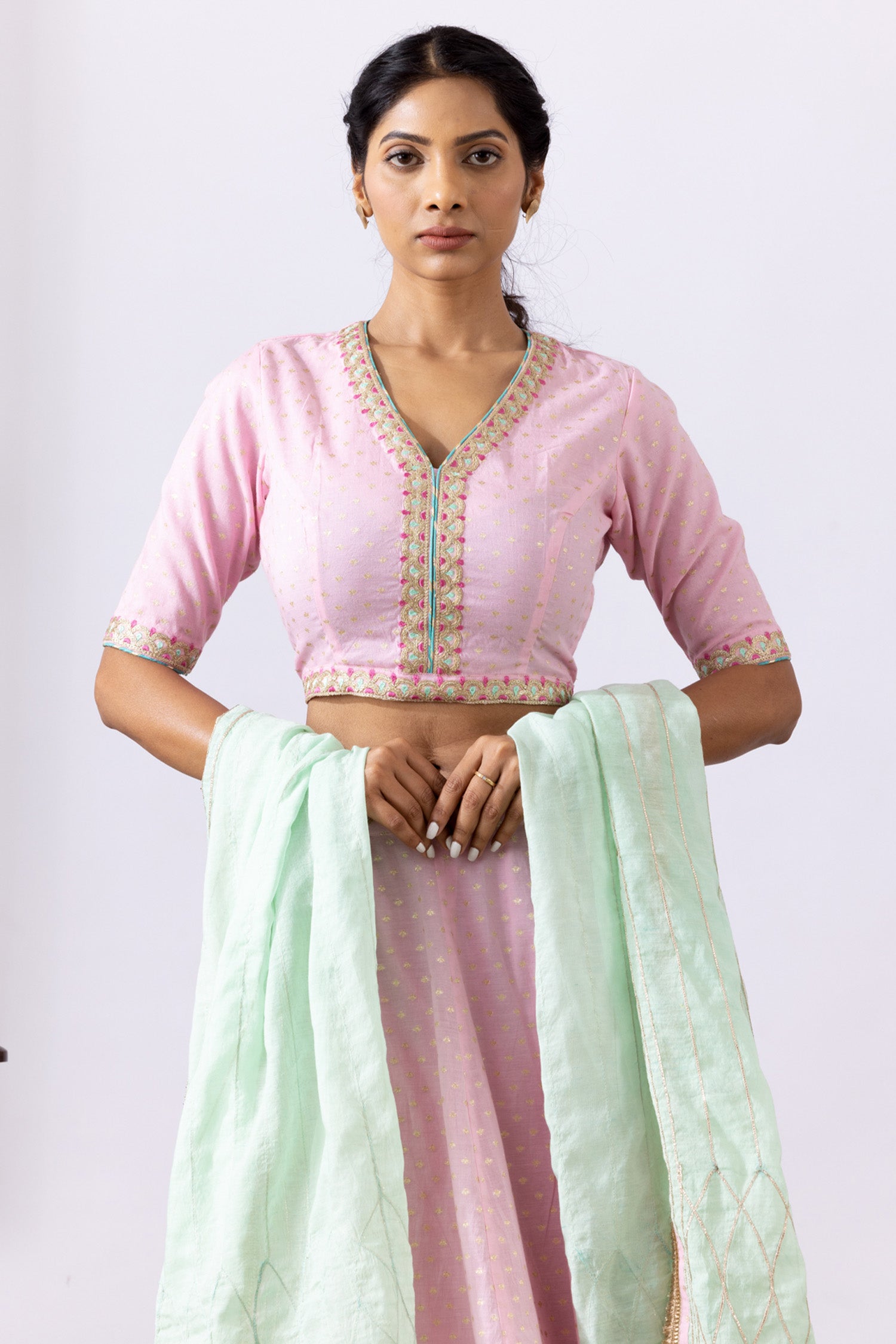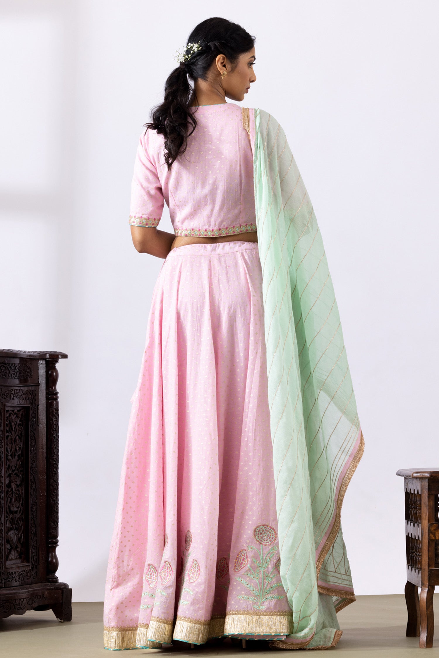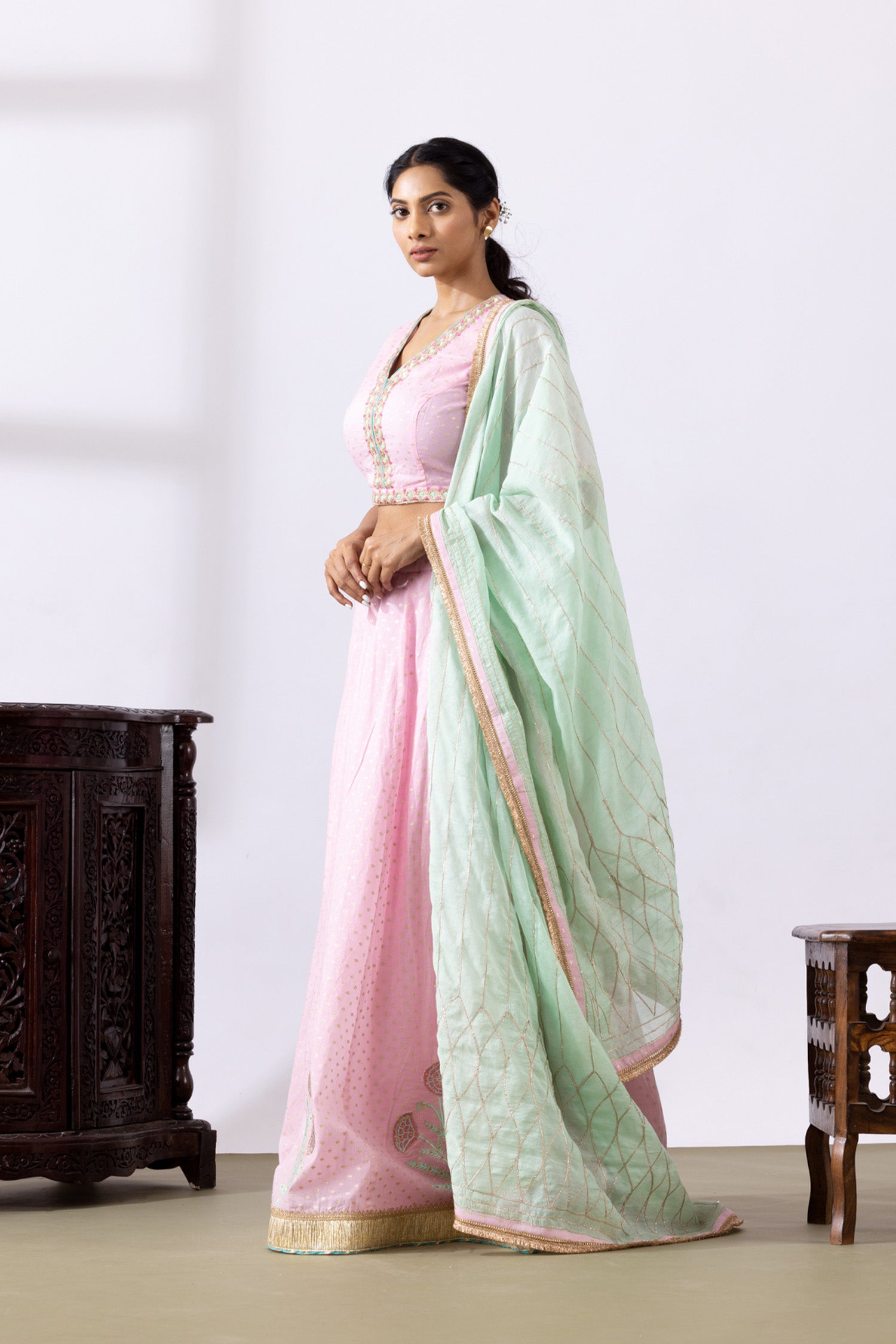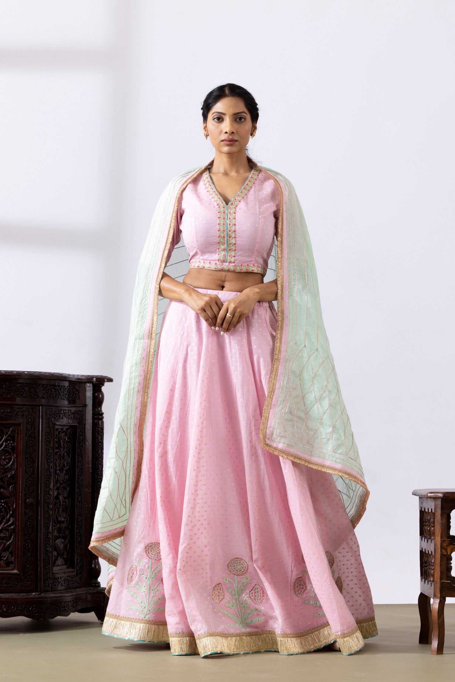The Pink Banarasi Chanderi Lehenga consisting of a Blouse with Embroidery Neck and a gotta work dupatta with a Lace detail for a perfect blend of tradition with elegance.