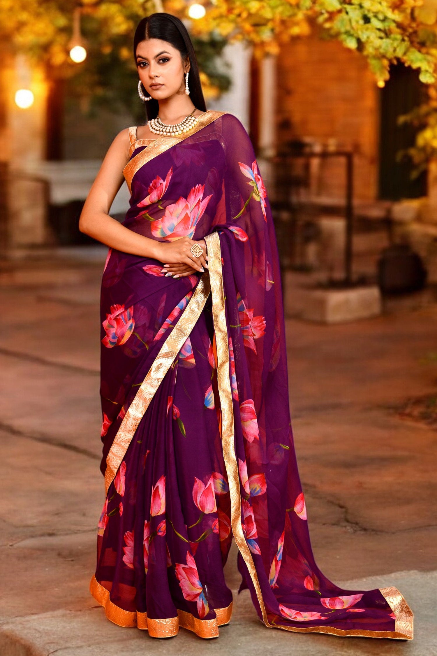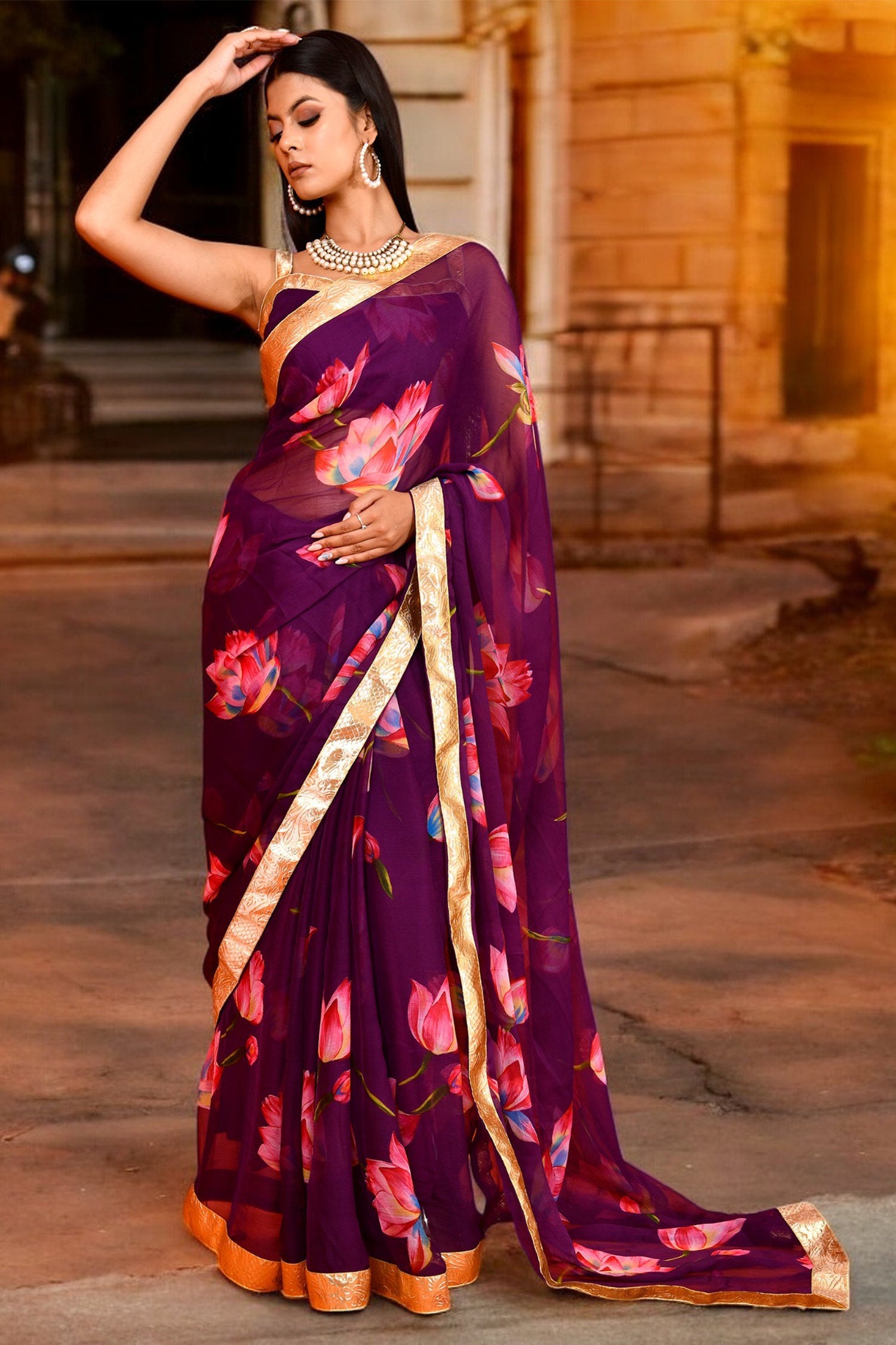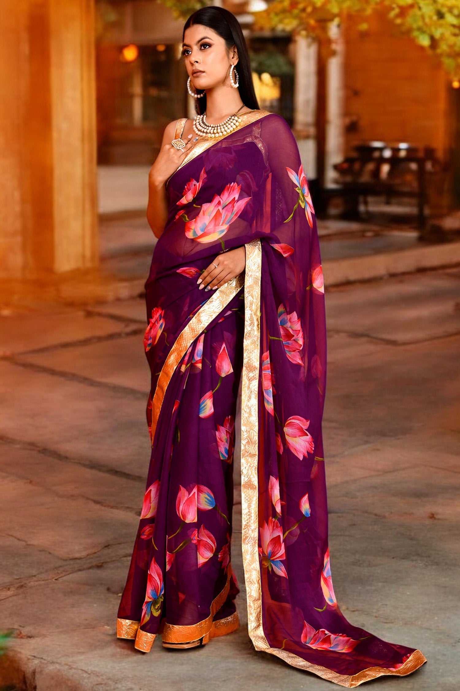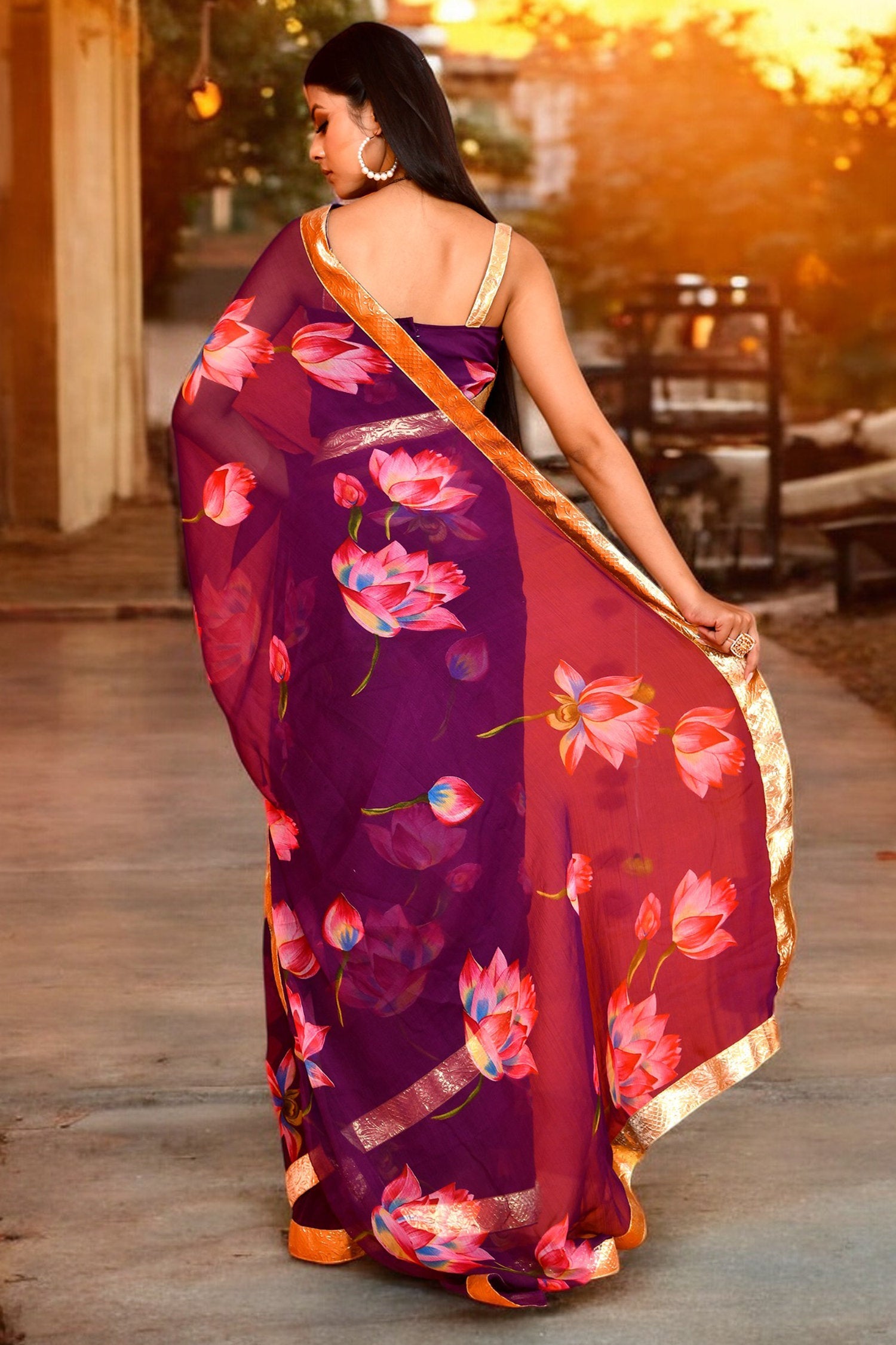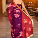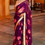 Purple Lotus Printed Chiffon Saree