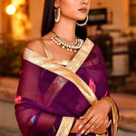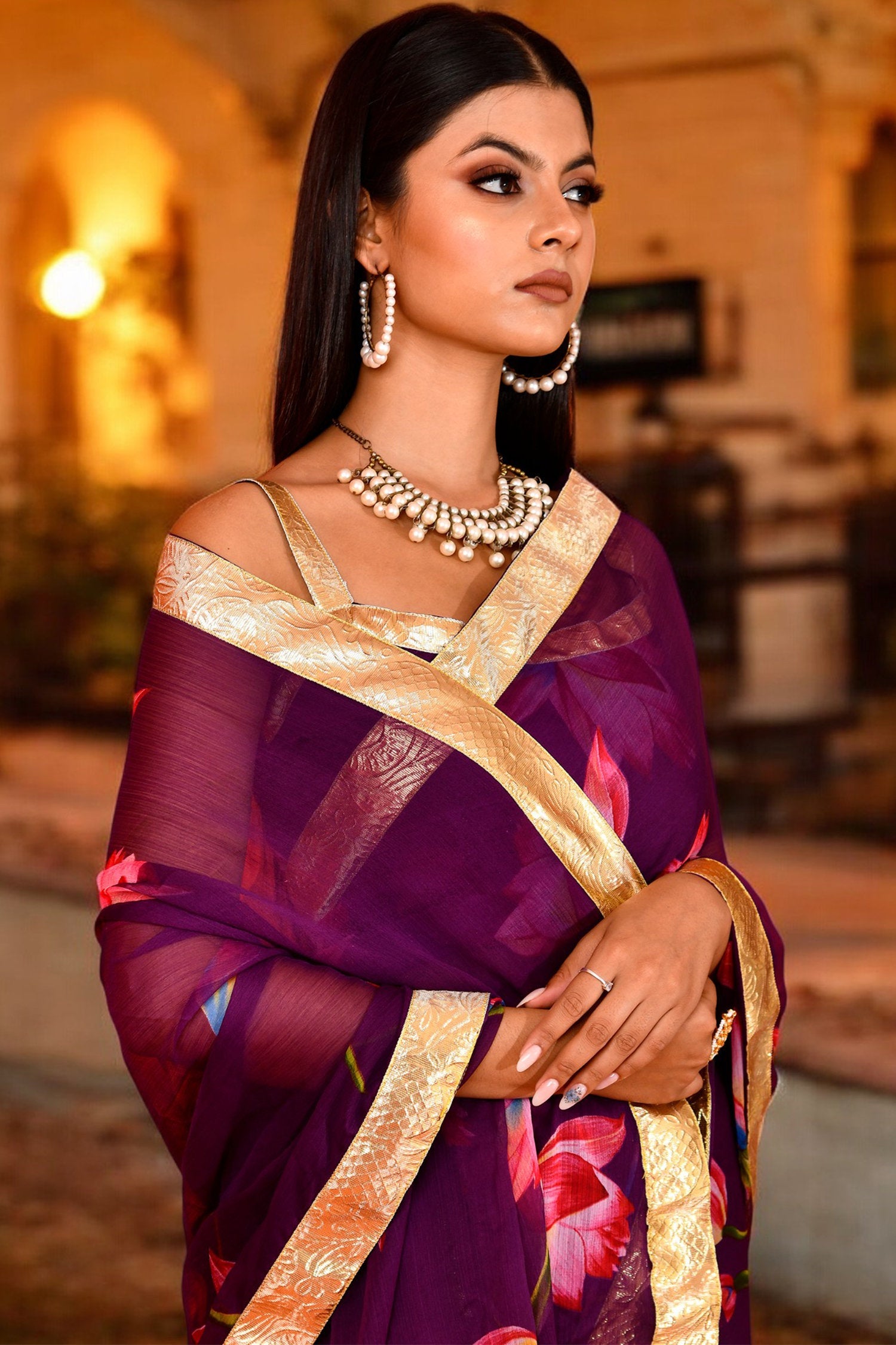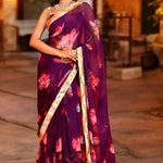 The beautiful purple floral printed chiffon saree and stitched floral chiffon blouse with gota details for a stunning and elegant look in every occasion.