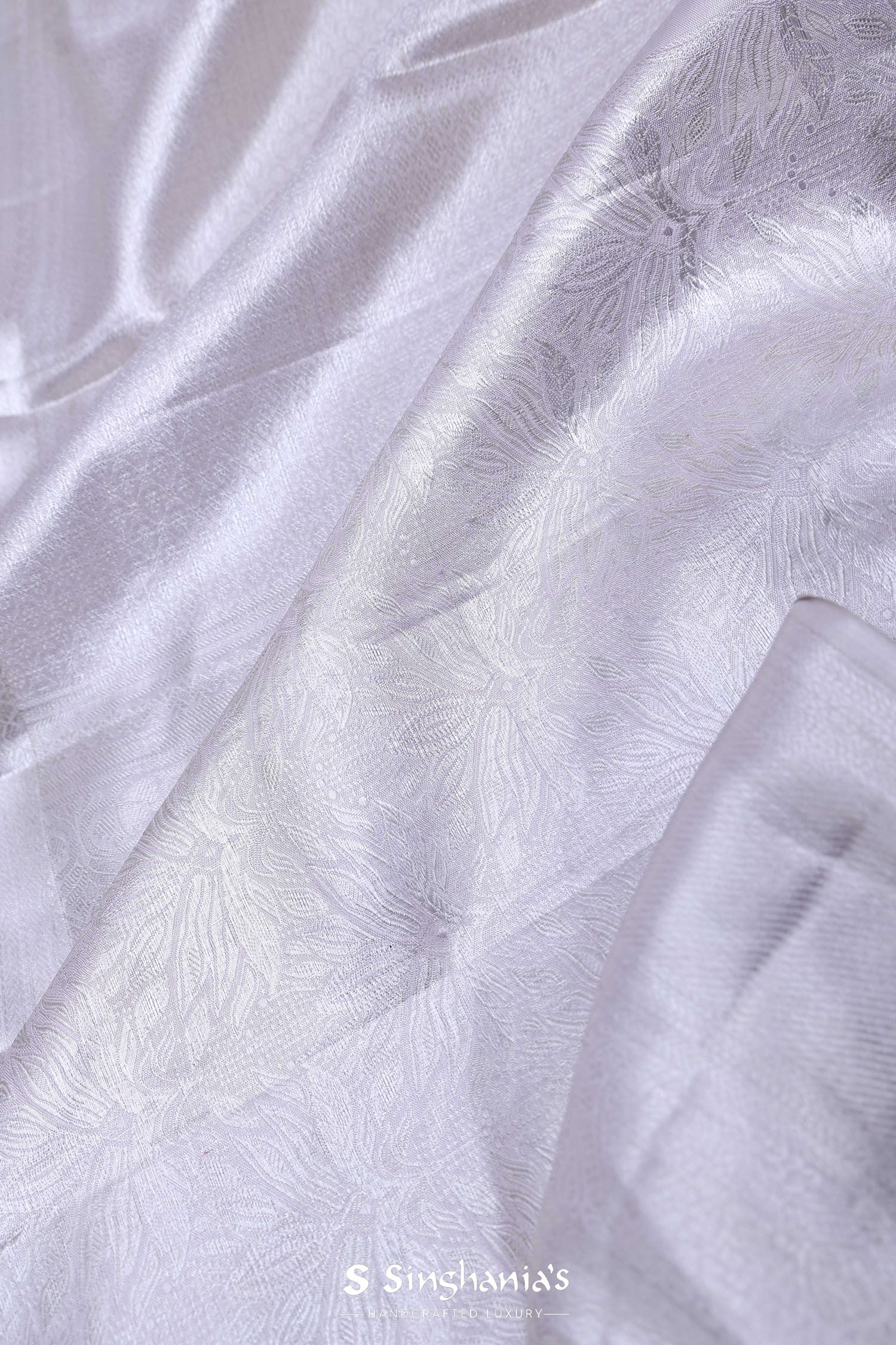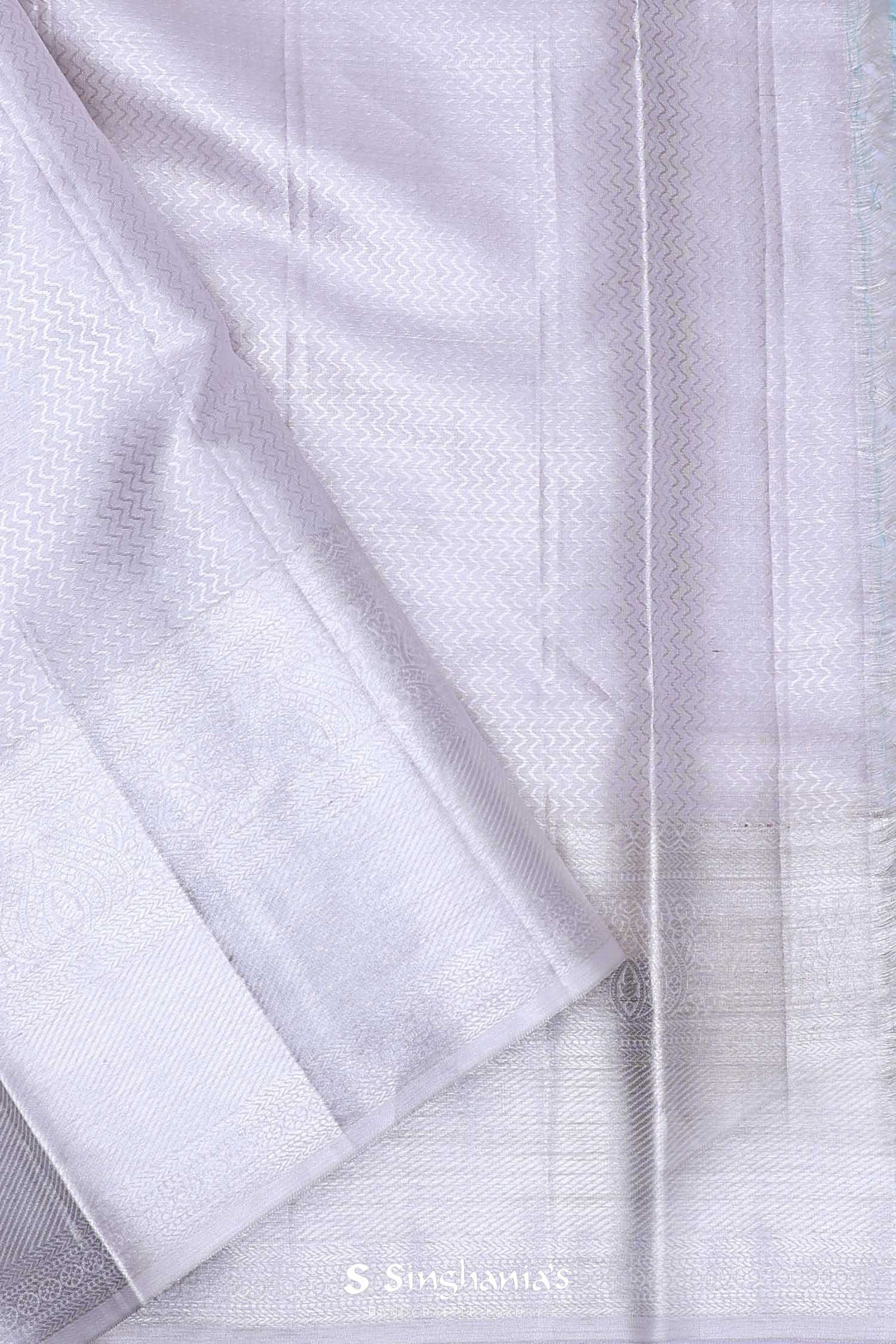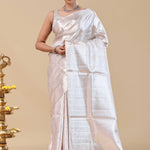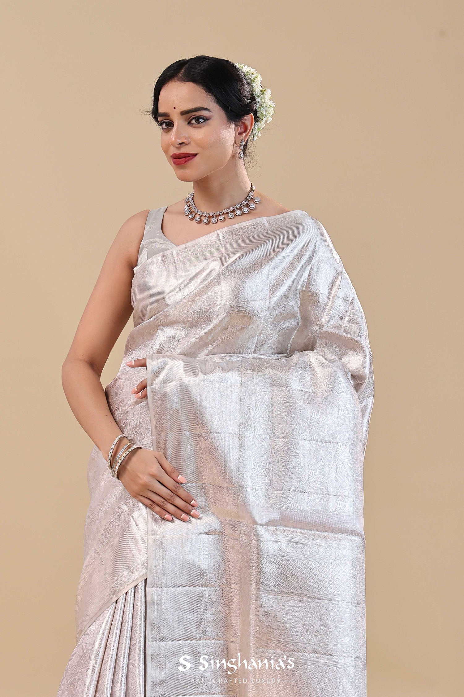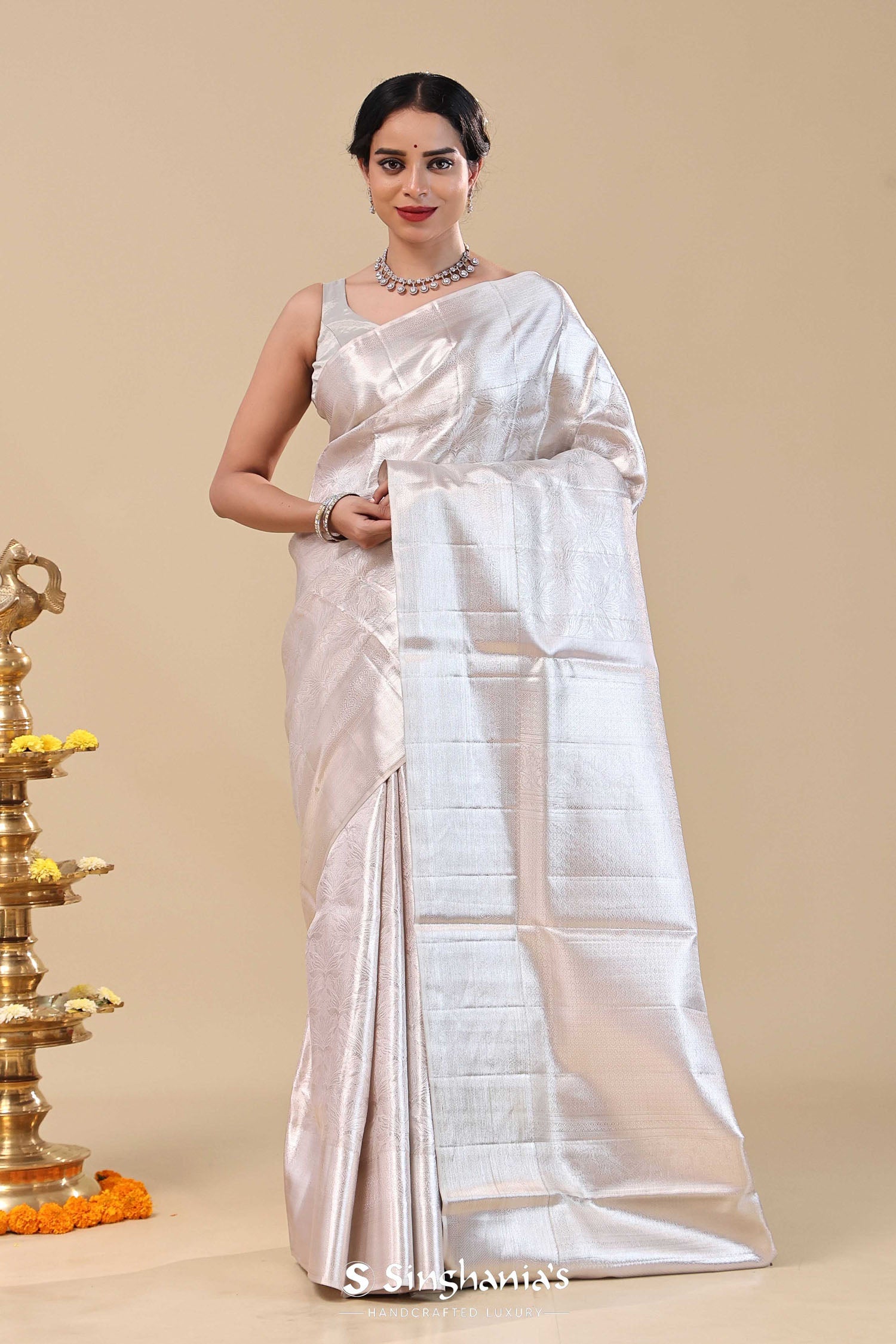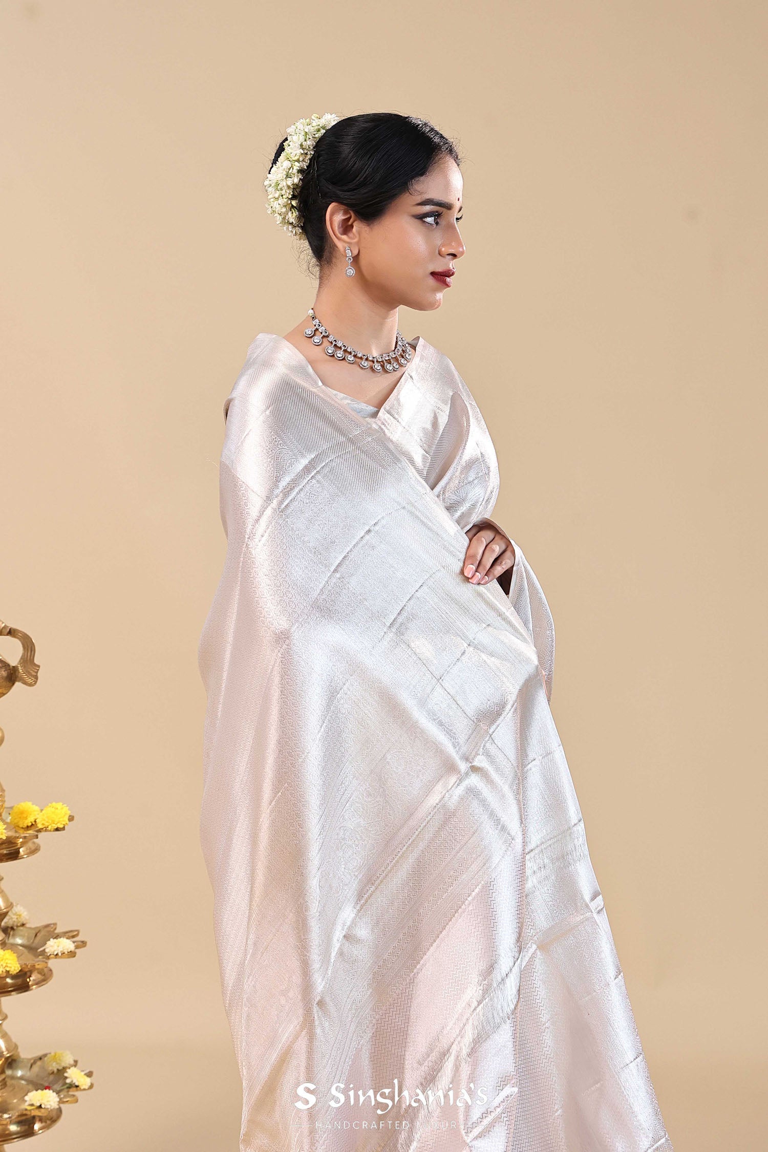 This White kanjivaram saree features floral jaal with silver zari spread all across the body along with traditional self border making it look elegant and traditional for any special occasions like festive and wedding