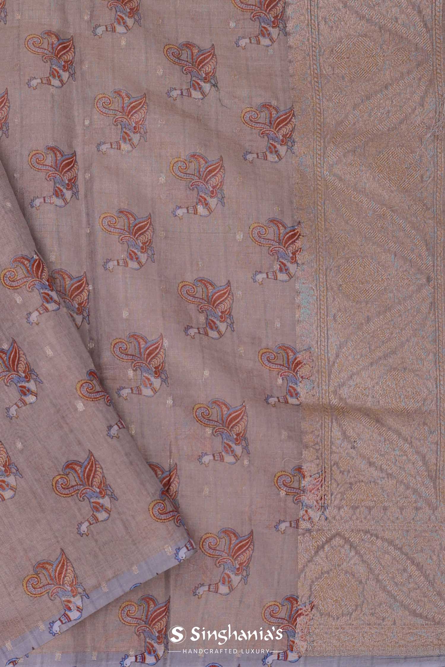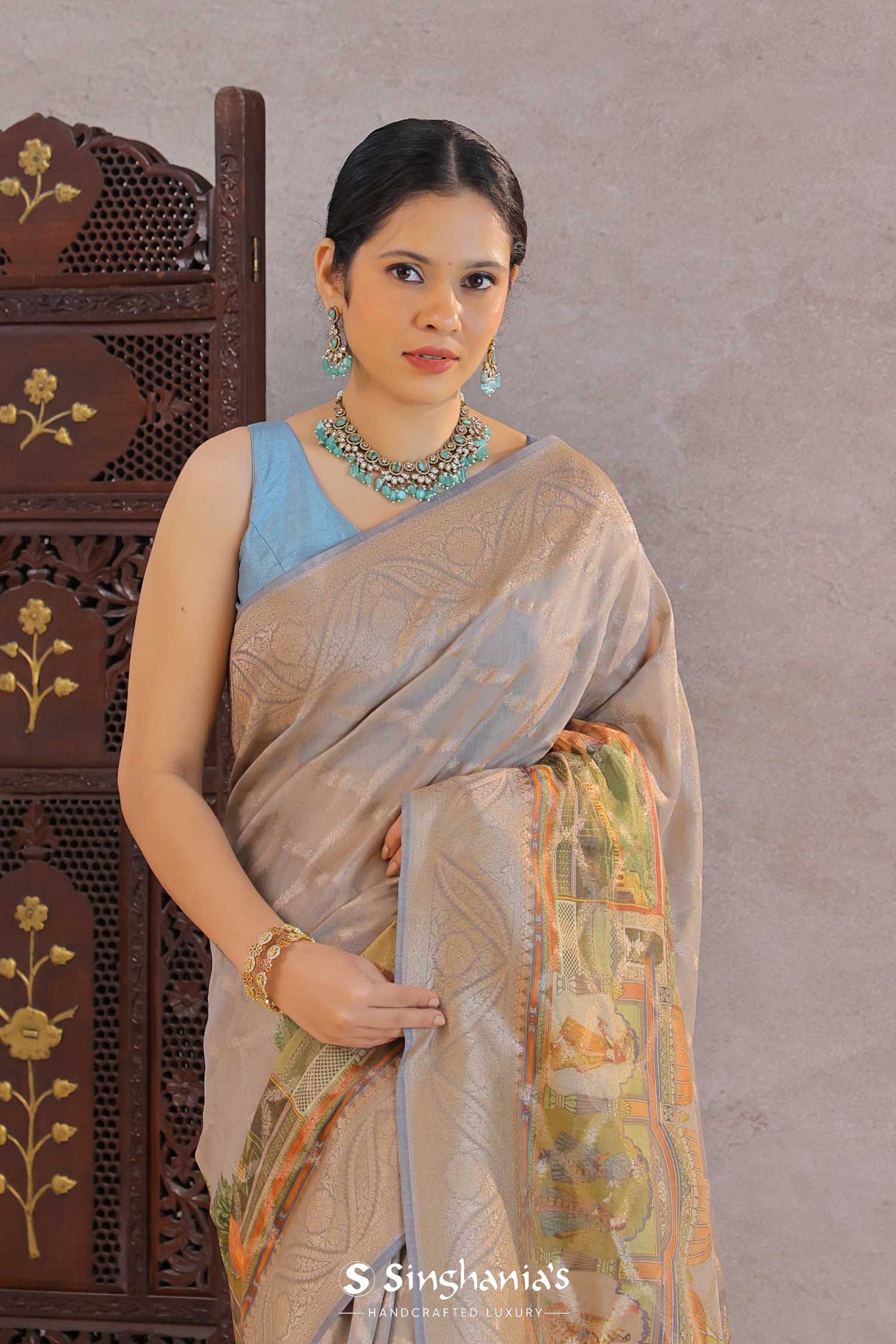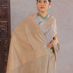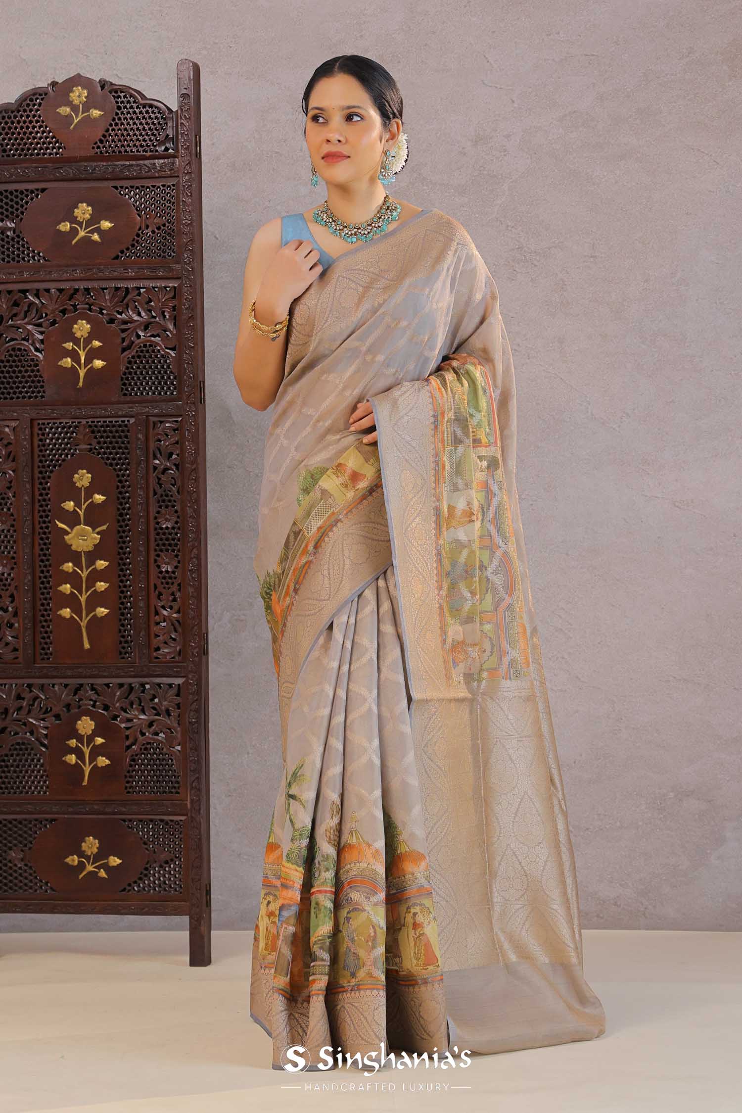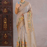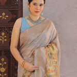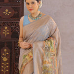 Grey Tissue Banarasi Saree With Human Figures