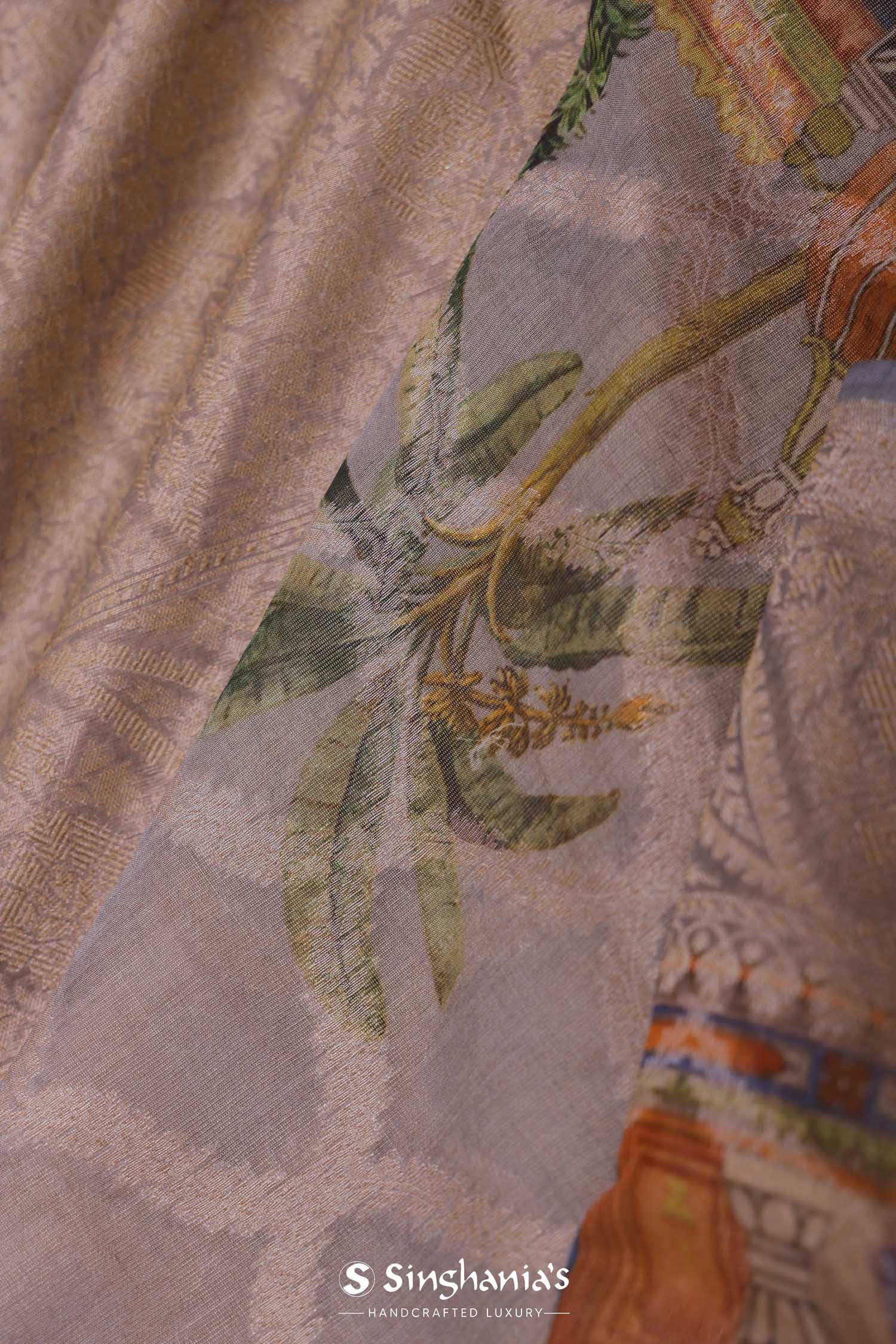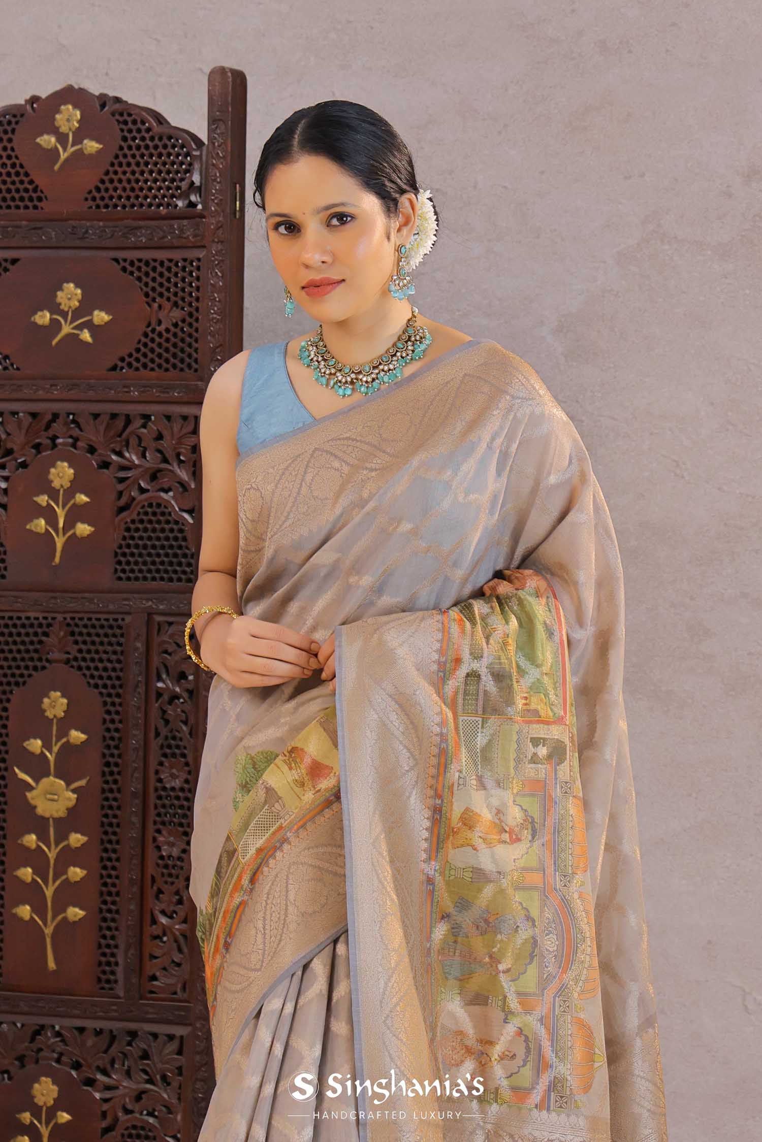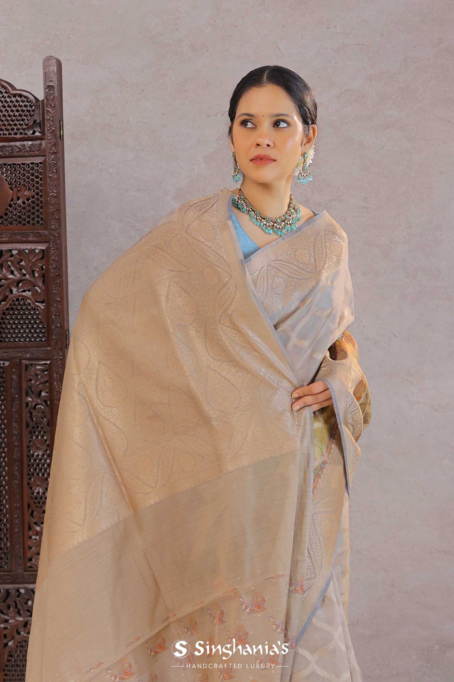 Grey Tissue Banarasi Saree With Human Figures
