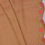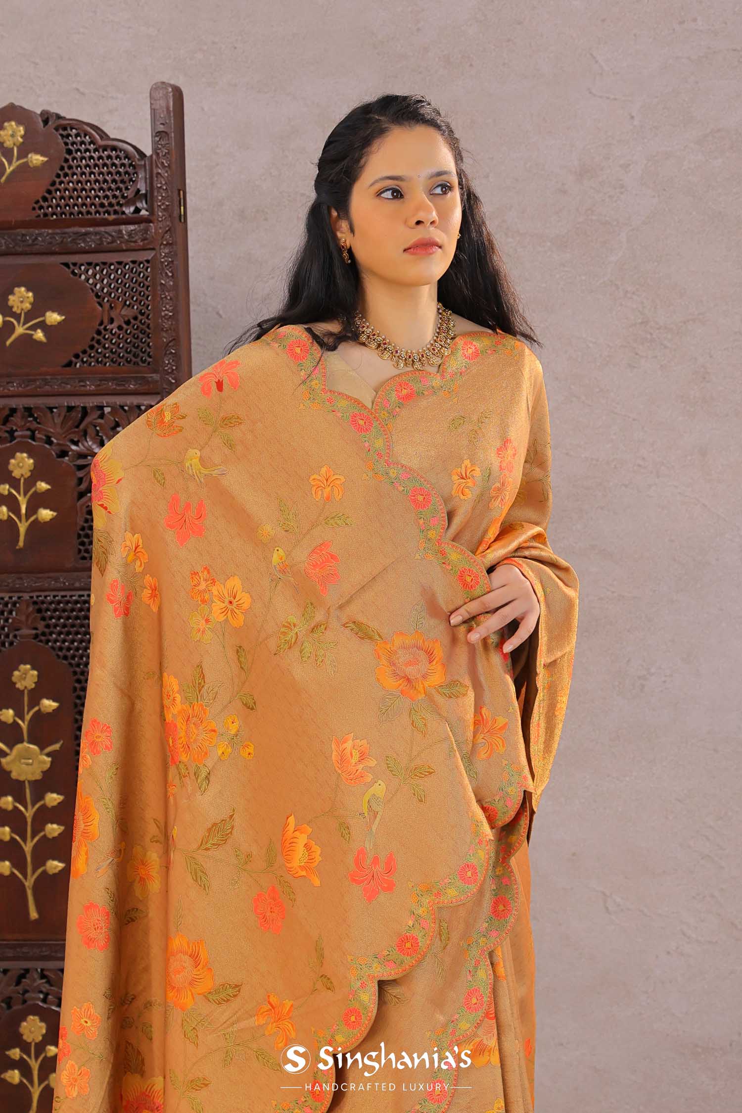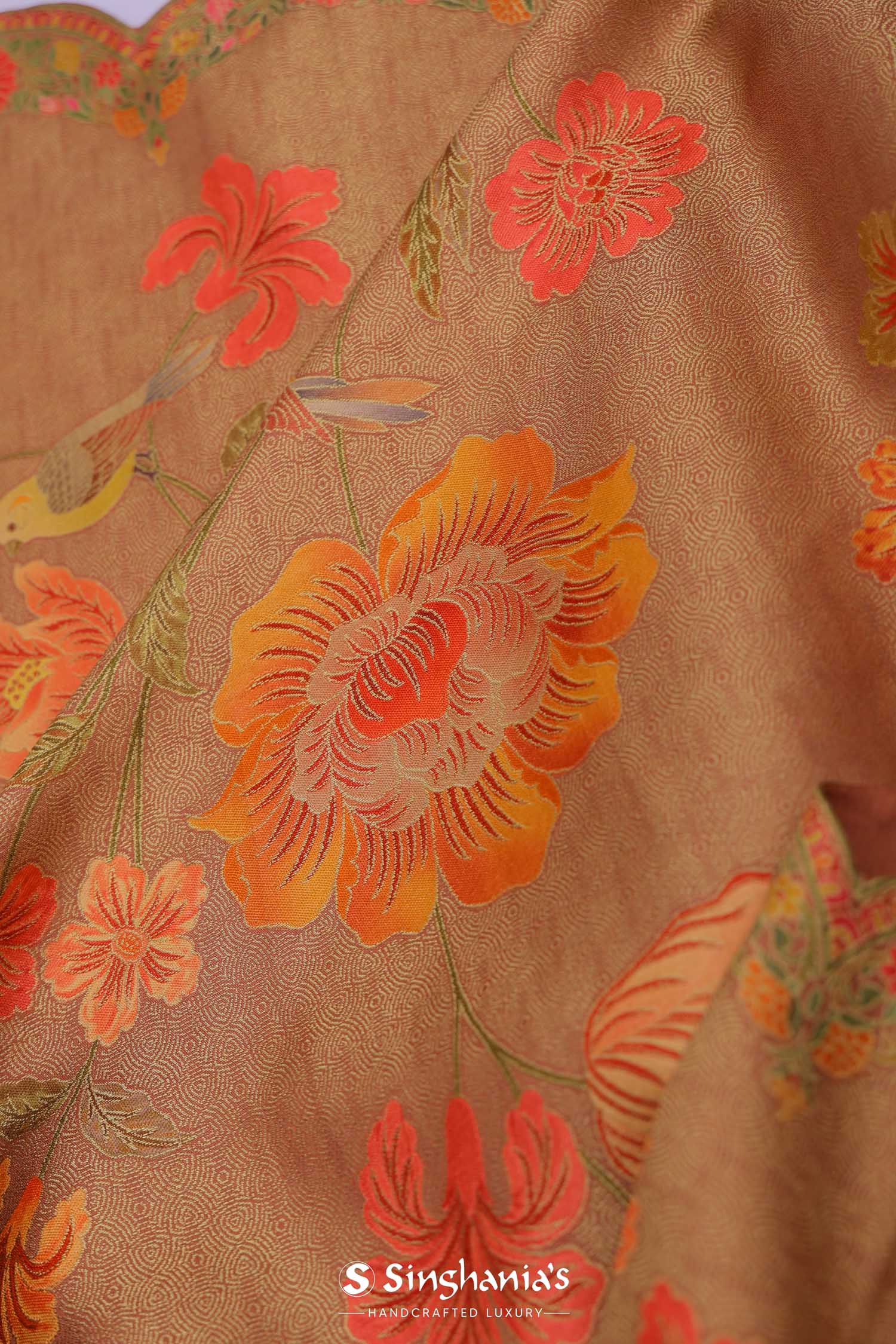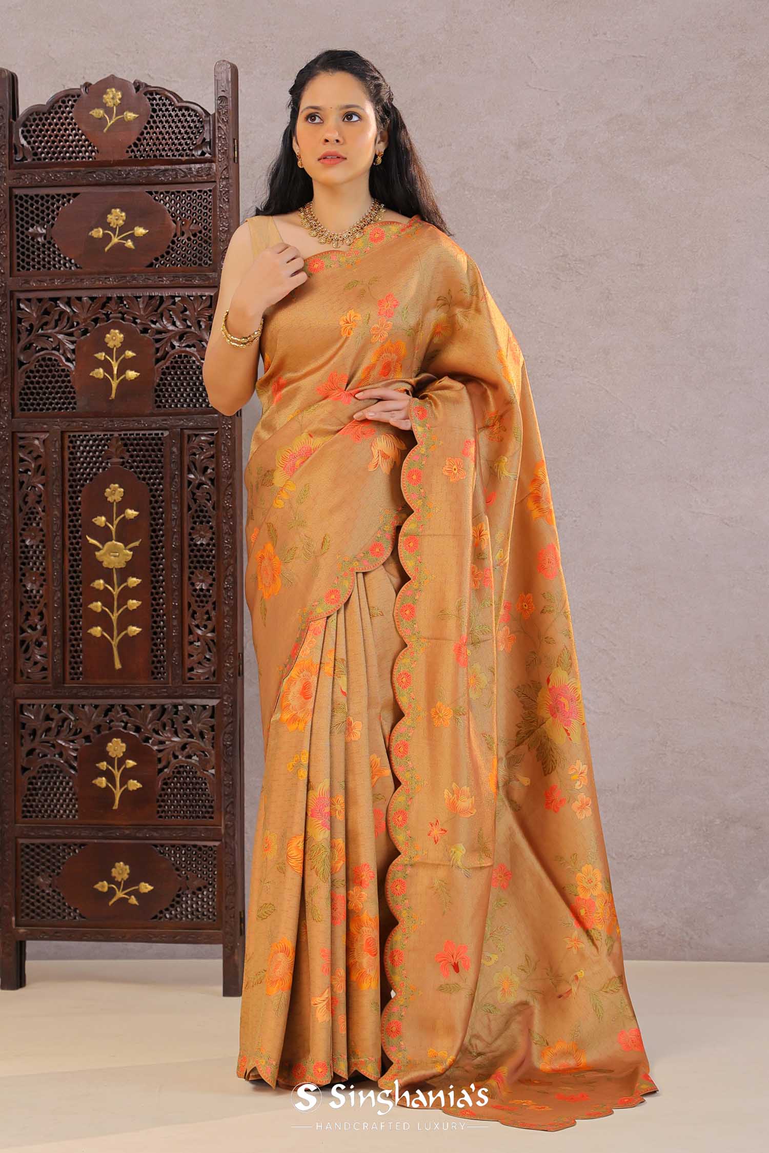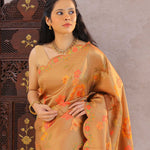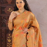 This Persian orange banarasi saree features floral jaal design spread across the entire saree with scallop border making it ideal choice for both fancy and festive occasions
