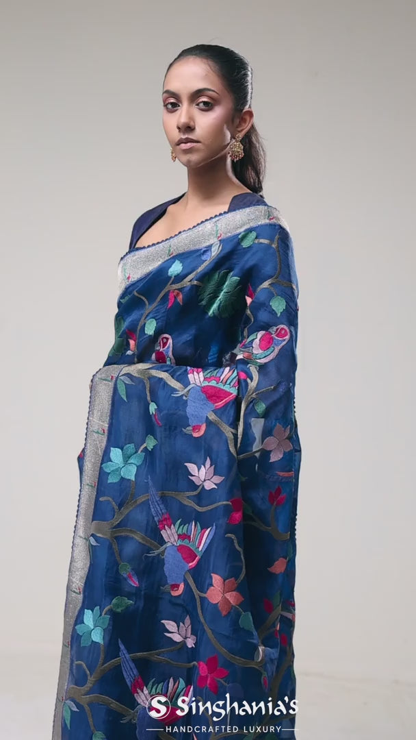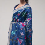 A beautiful prussian blue organza designer saree with floral jaal design all over in colourful jamdani-styled threadwork embroidery. Accentuated with small munia-inspired embroidery border, this saree is suitable for festive and wedding occasions.