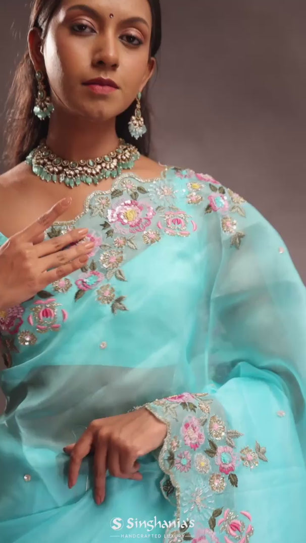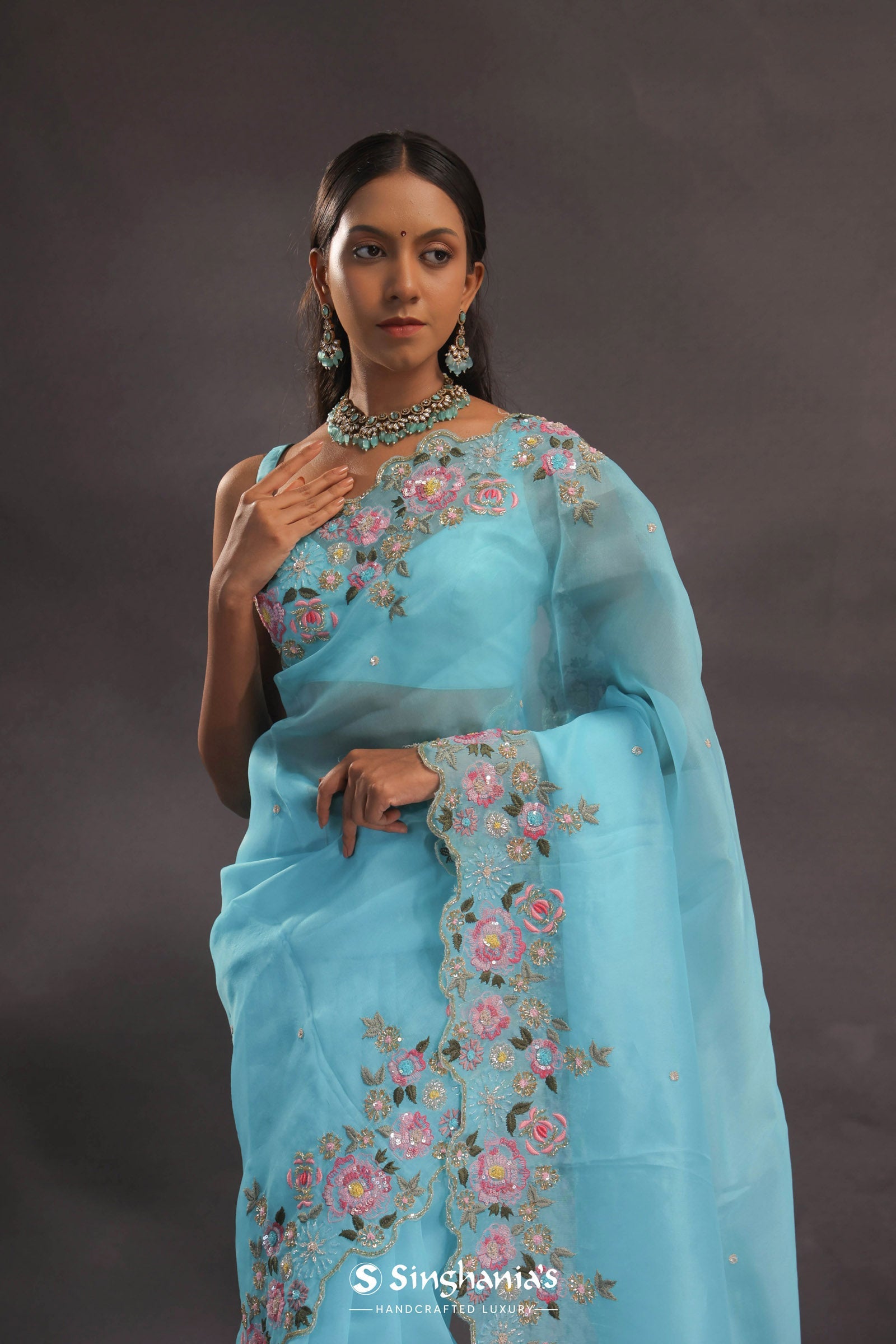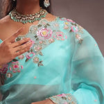 This sky blue organza embroidery saree features a delicate, ethereal fabric that exudes elegance and grace. The soft, semi-transparent material is adorned with intricate floral embroidery along the borders, adding a touch of femininity and charm. The floral motifs are skillfully woven, creating a beautiful contrast against the serene sky blue hue. Perfect for formal events or festive occasions, this saree blends traditional craftsmanship with a contemporary flair, making it a timeless addition to any wardrobe.