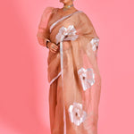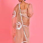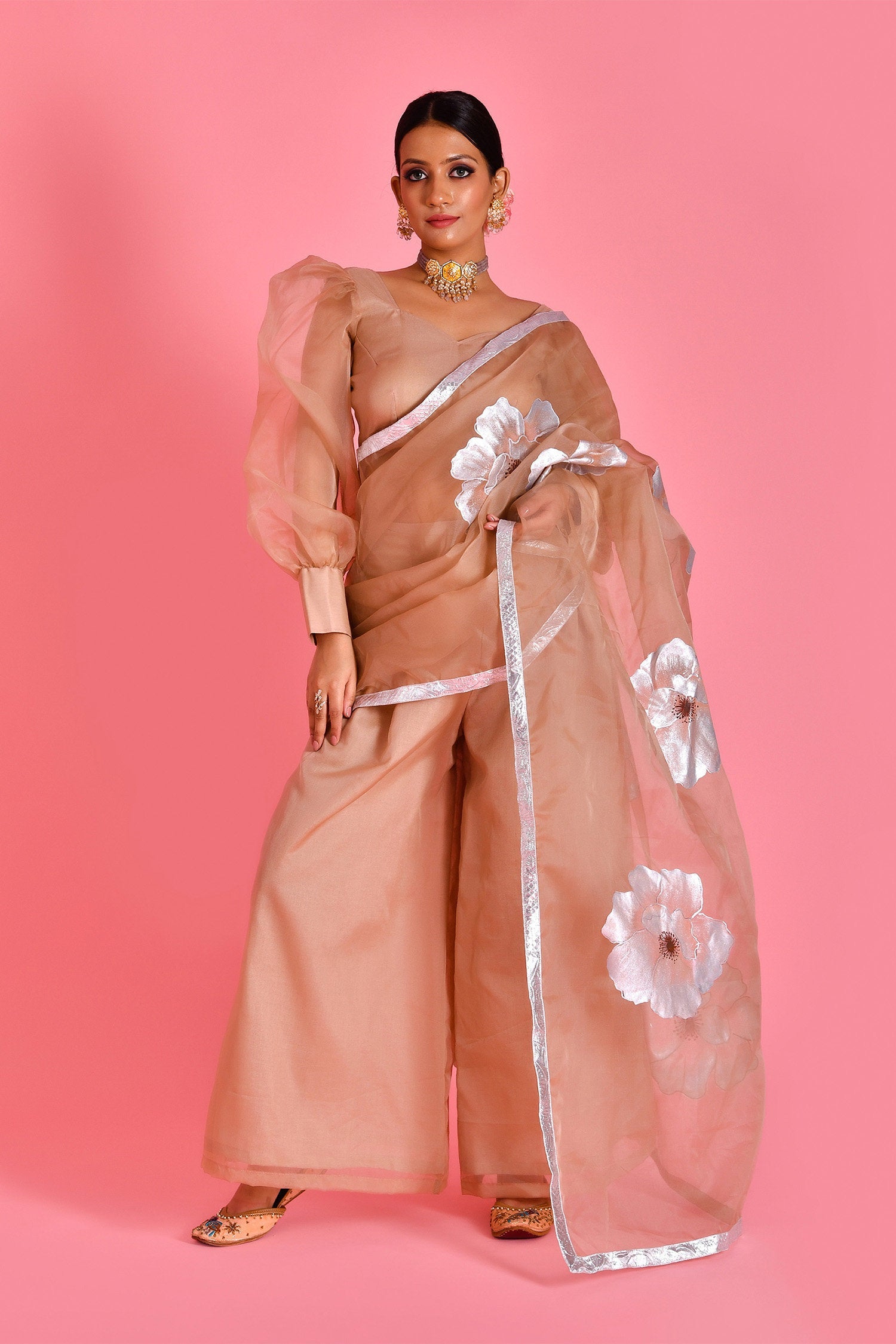 The Beige organza palazzo pant drape style saree with floral paint for a distinguished beautiful look with neat finish.