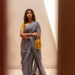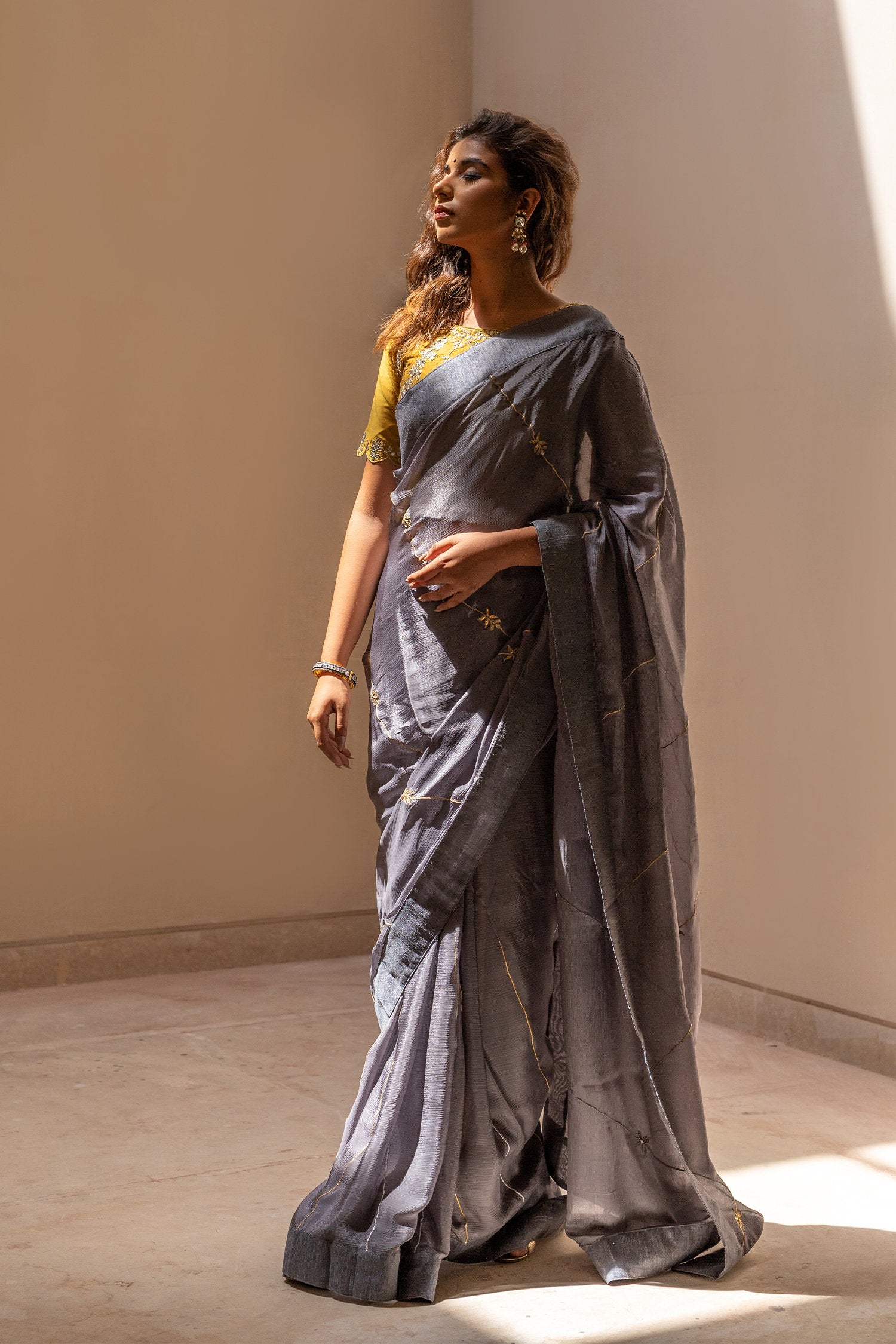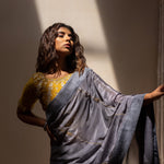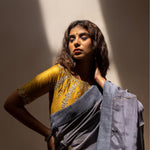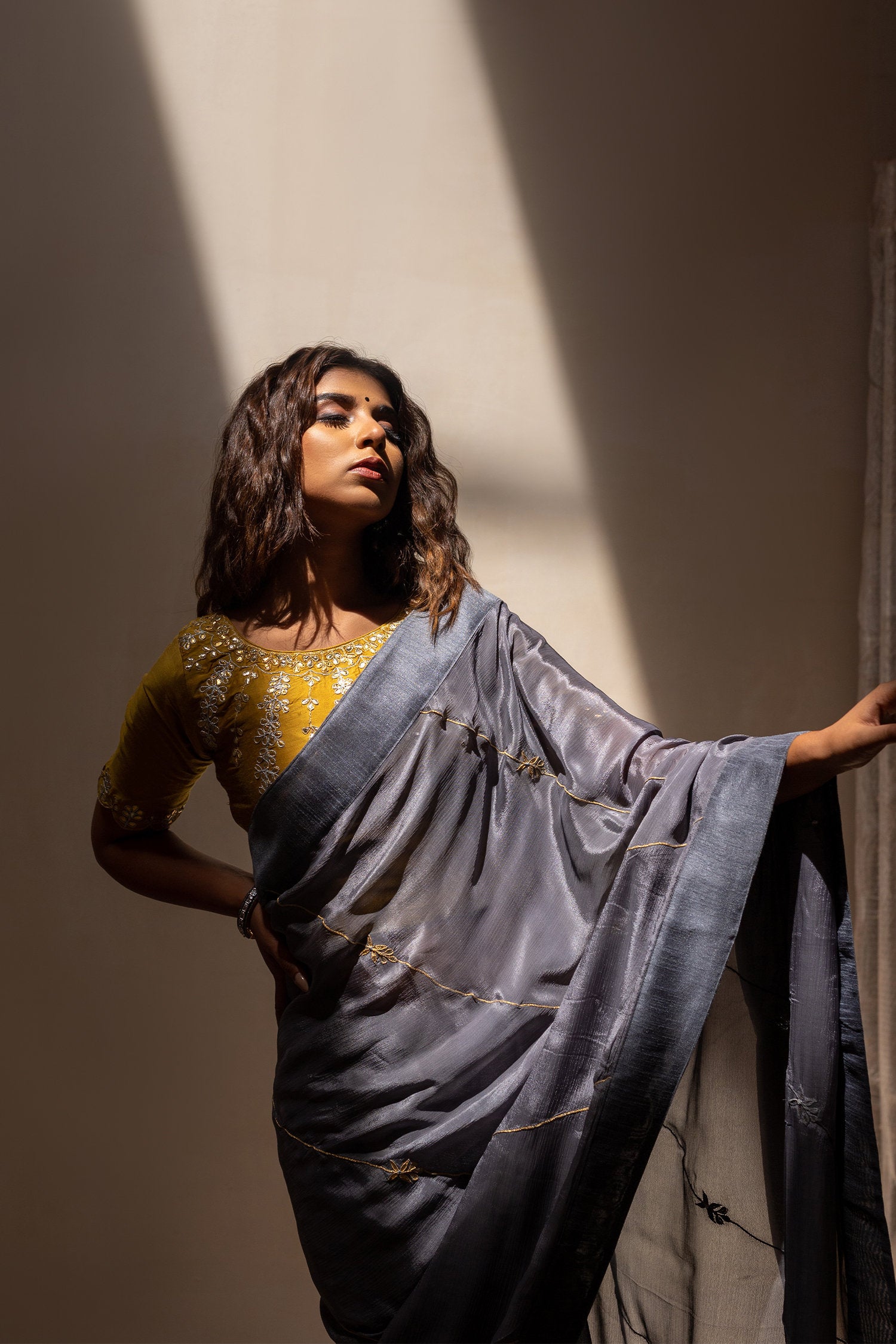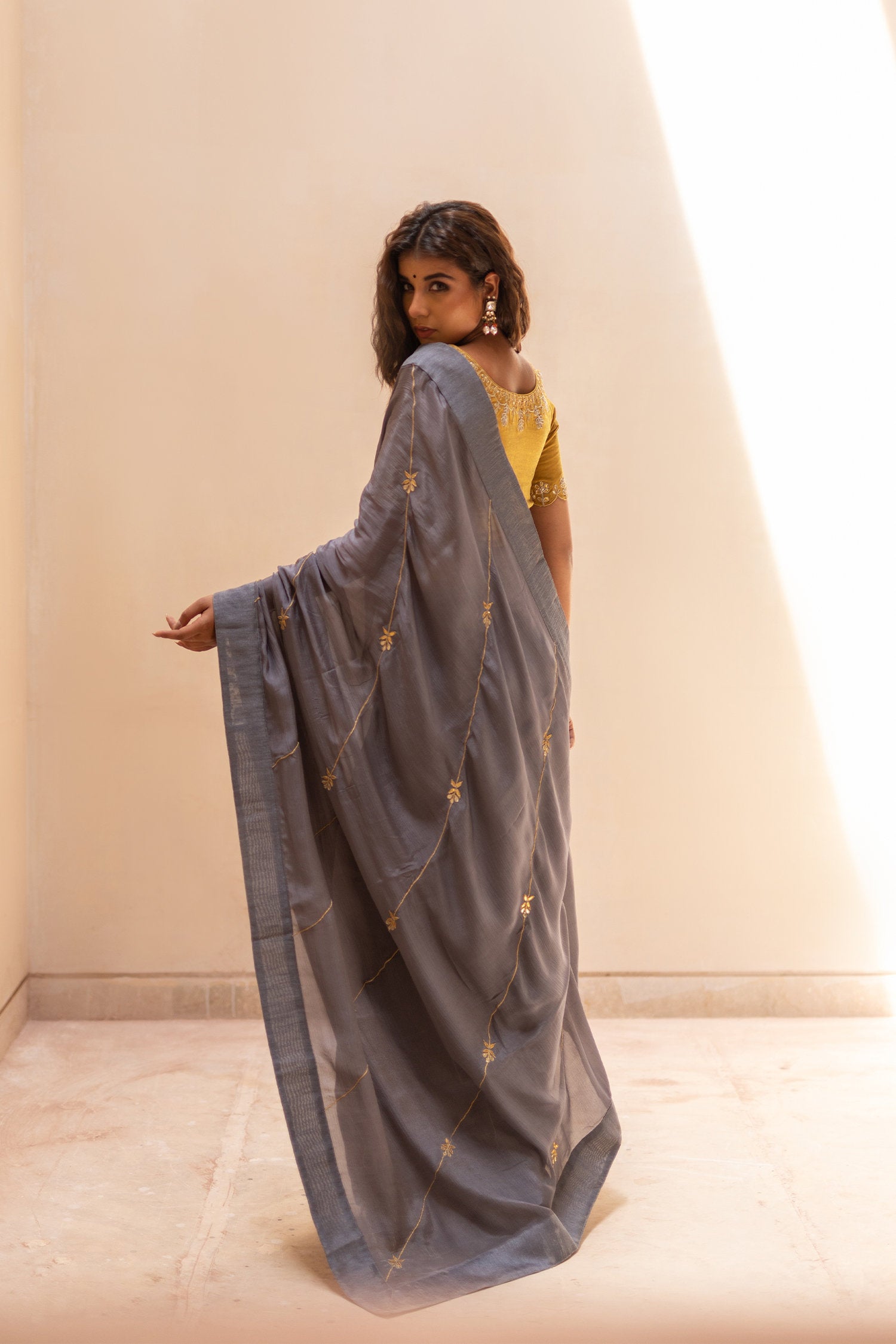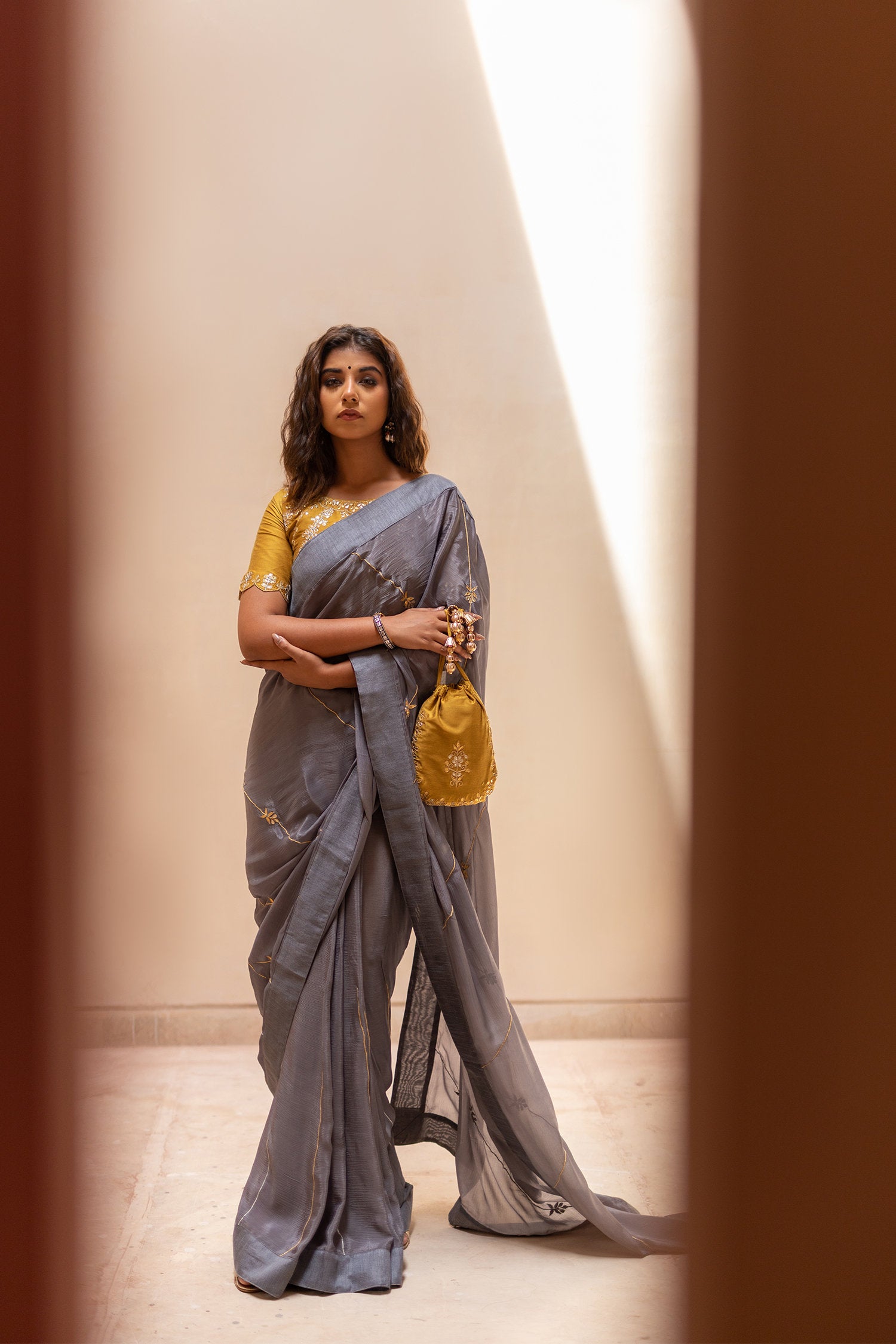Grey Gota Patti Chinon Saree With Mustard Cotton Silk Blouse