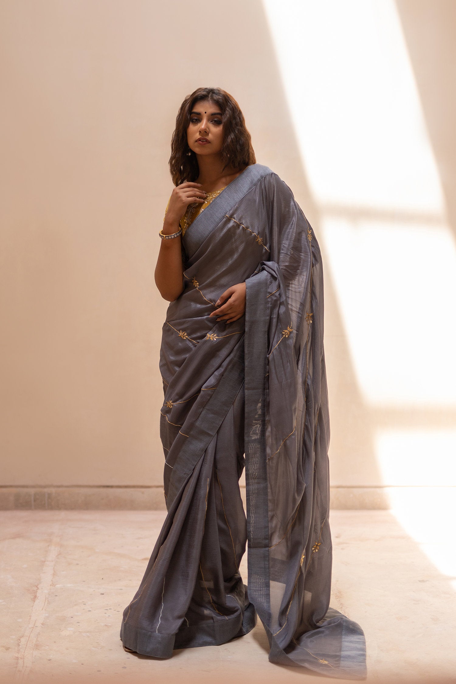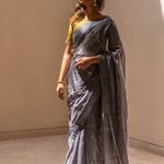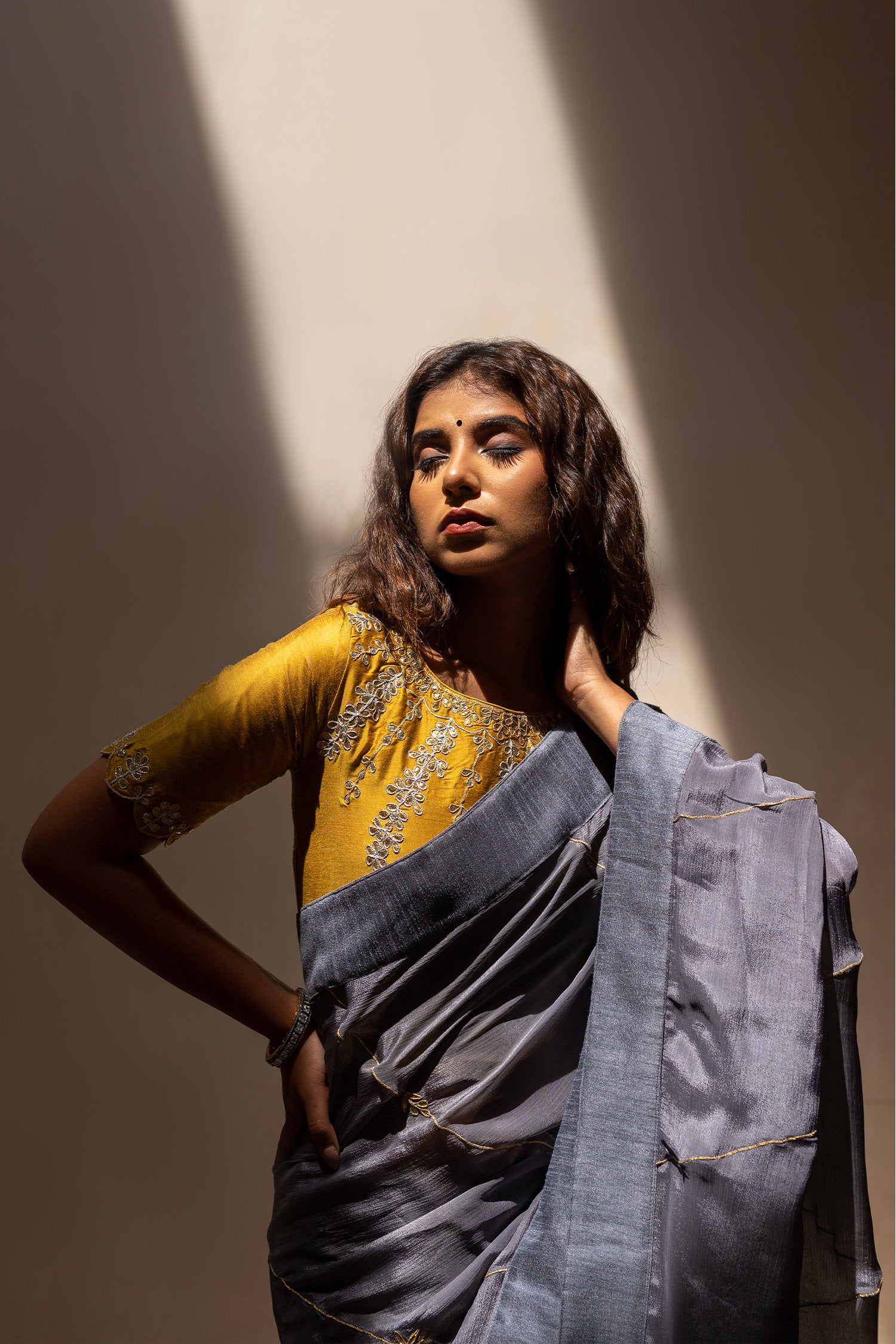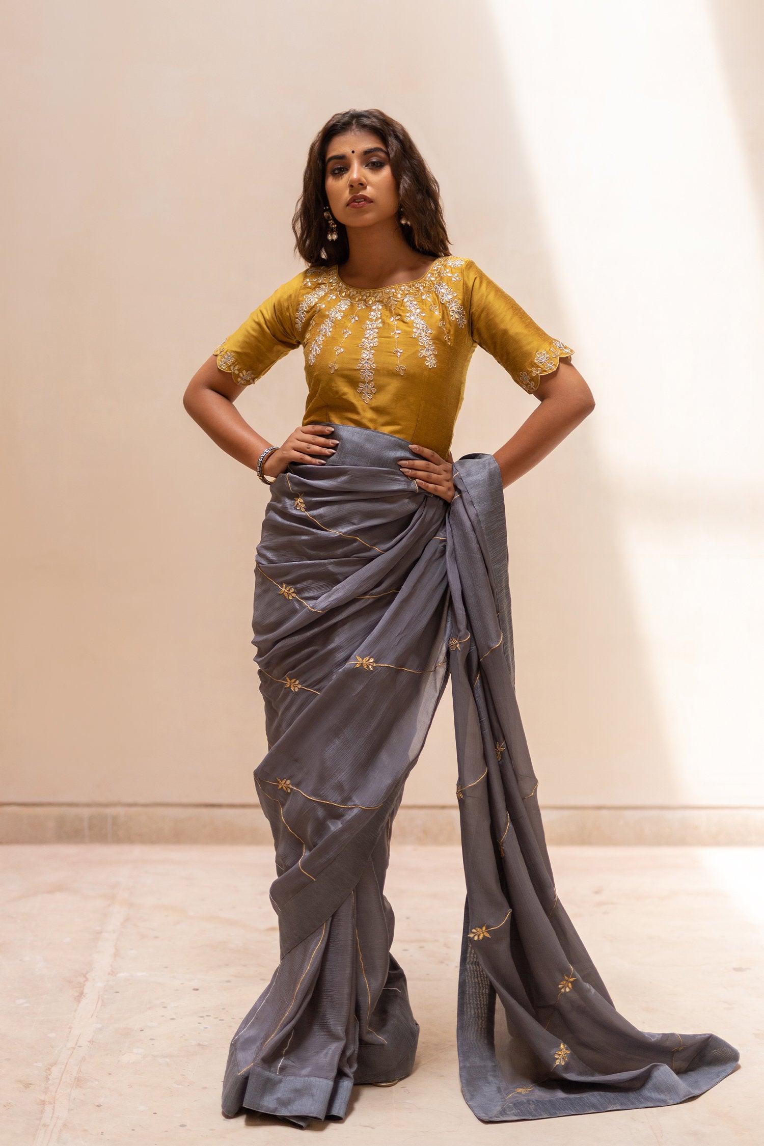 The grey gota patti chinon saree with mustard cotton silk blouse for a beautiful look combined with style and tradition.