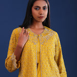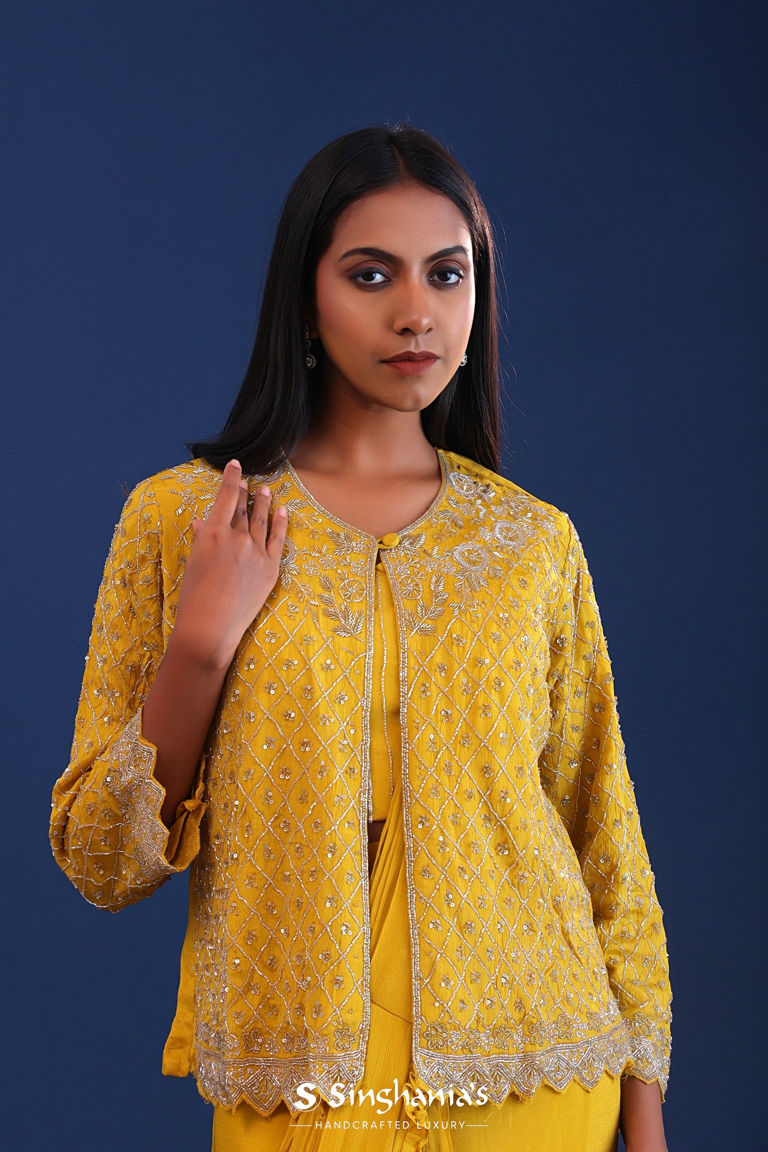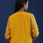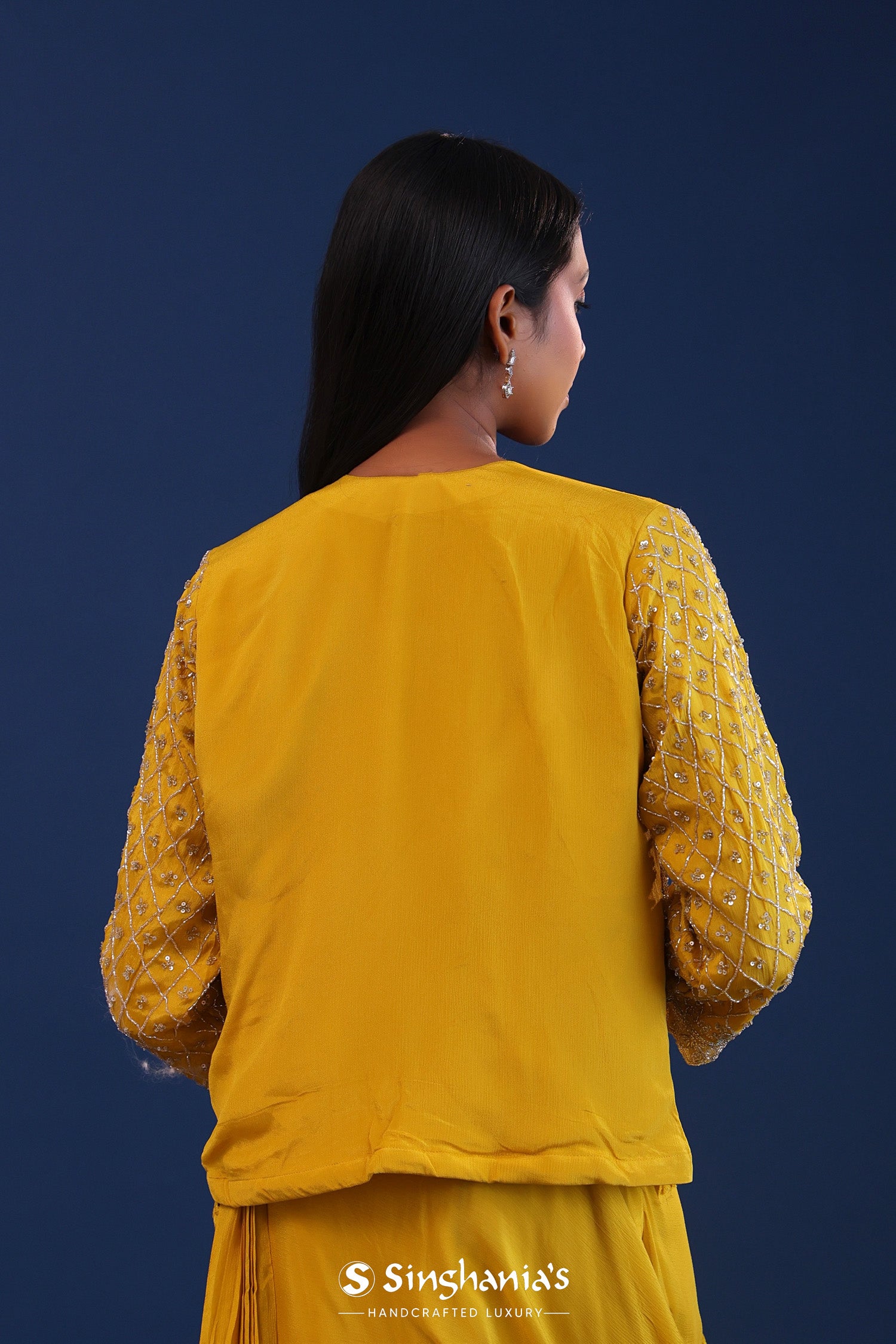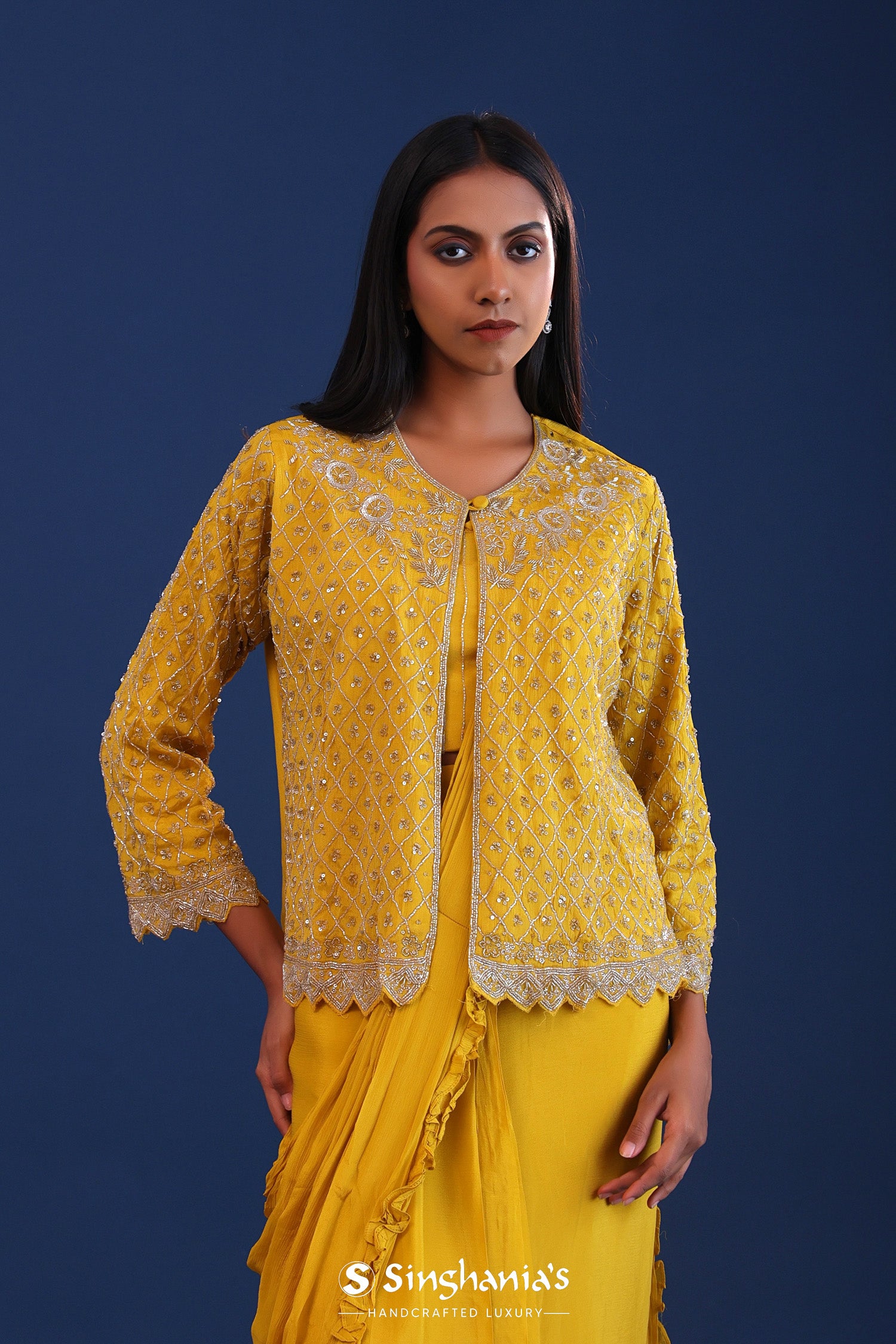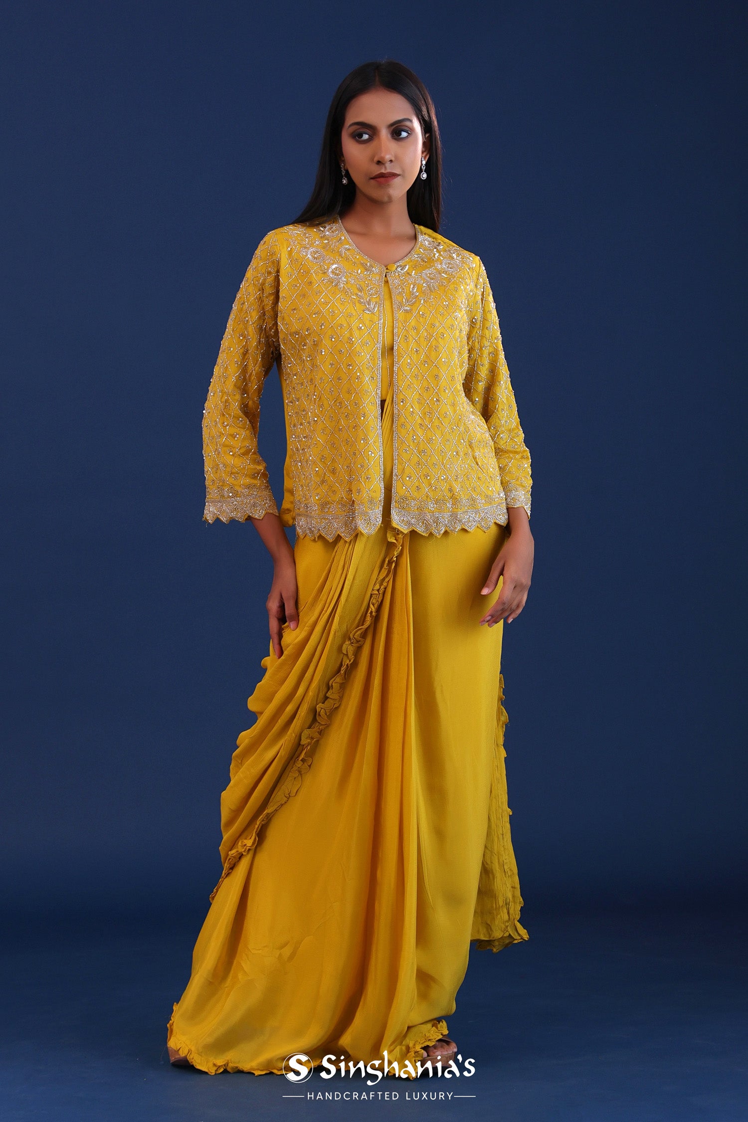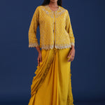 The mustard yellow chinon drape saree with cutdana work along with detachable jacket for a perfect blend of tradition and style.