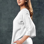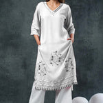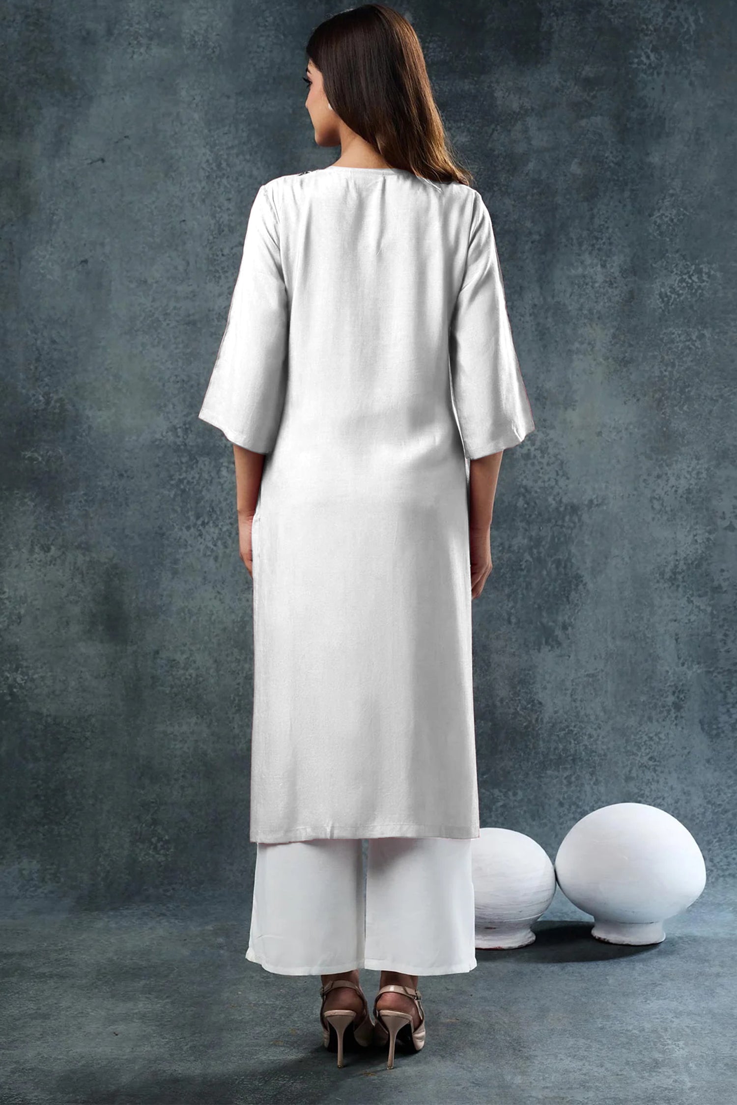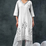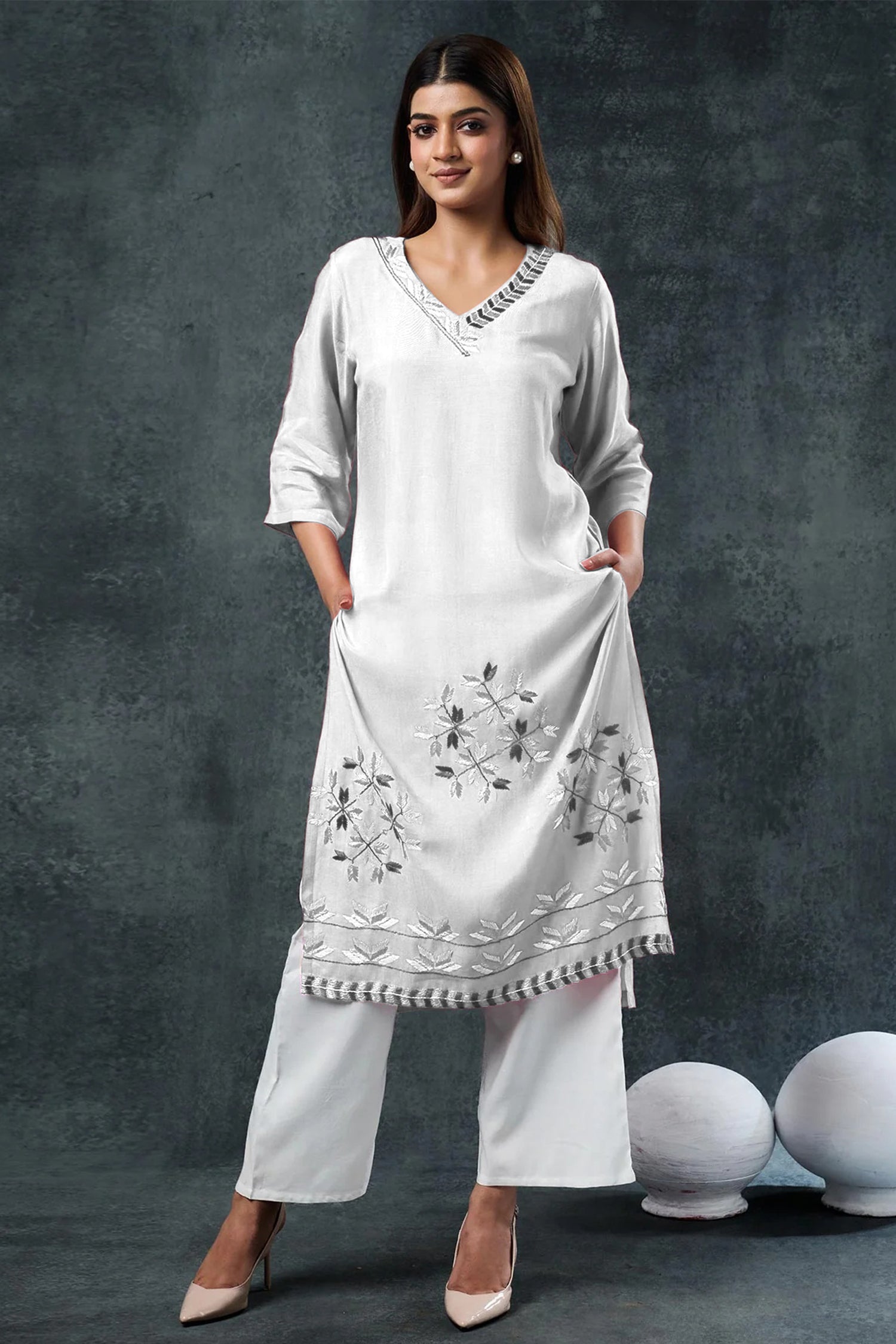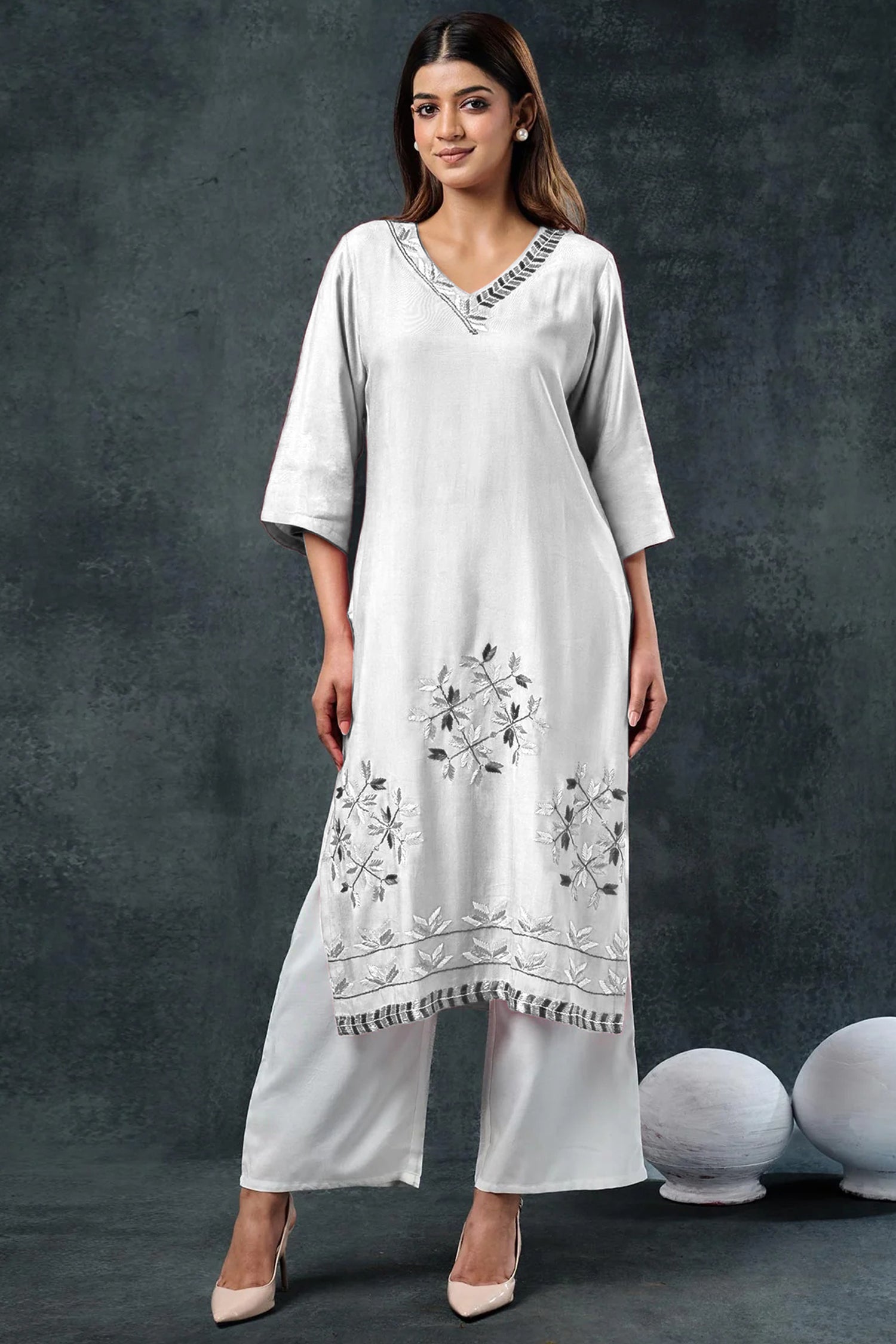 The V neckline and mid-forearm sleeves of Off-white rayon kurta set features leaf embroidery complemented by palazzo pants
