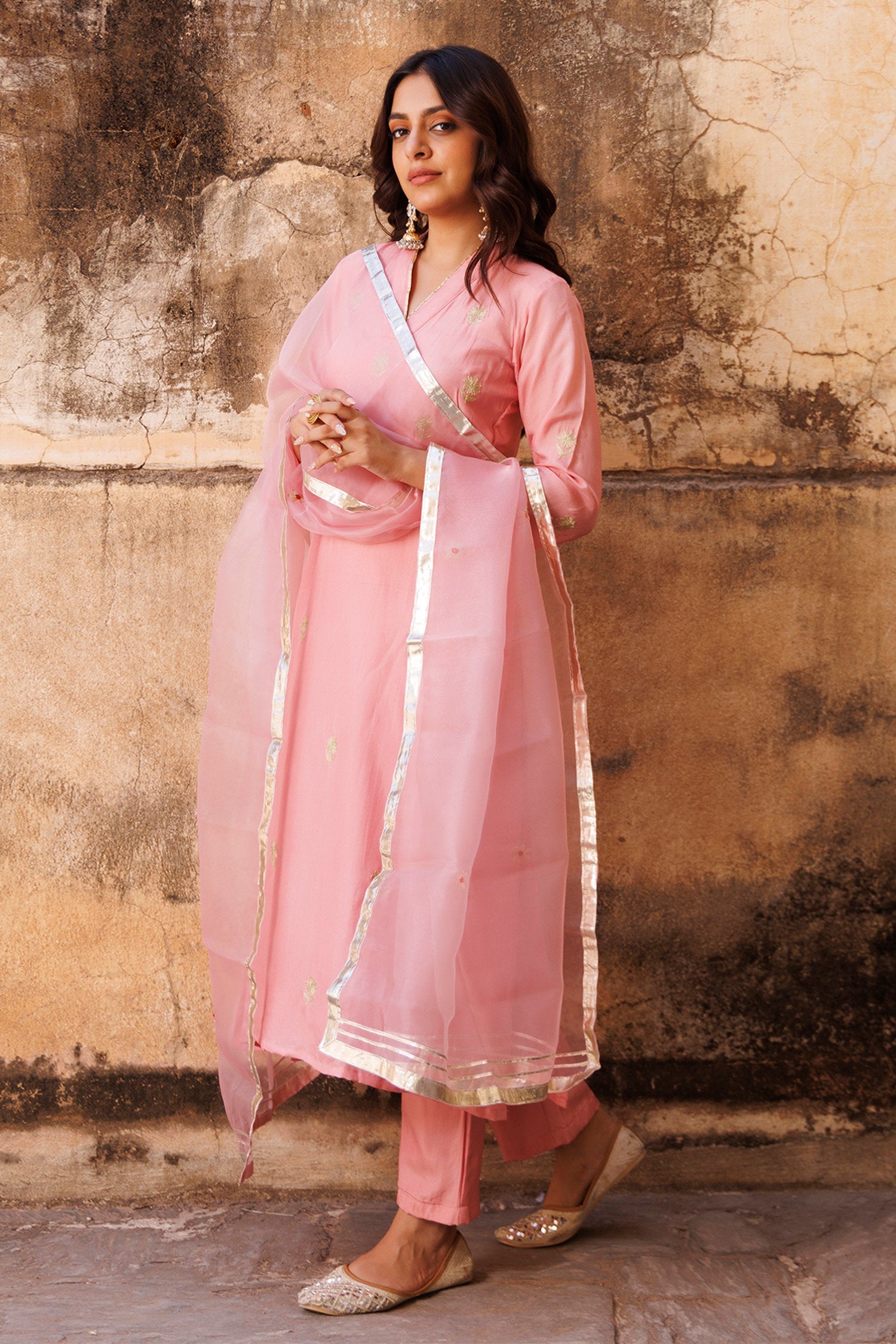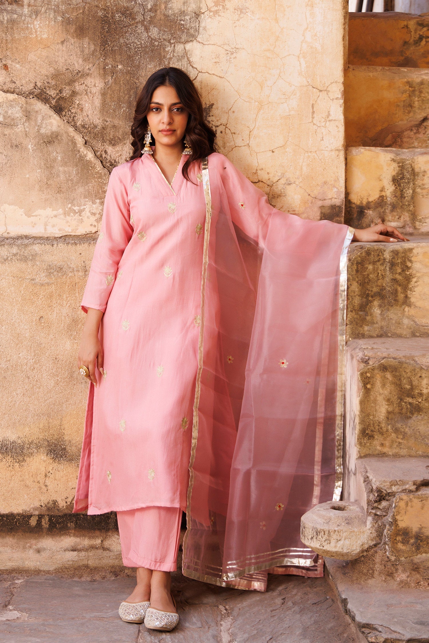 Pastel pink uppada silk kurta set features V neckline and mid-forearm length sleeves paired with straight pants along with dupatta adorned with aari embroidery. It emits grace and elegance making it perfect choice for any occasions.