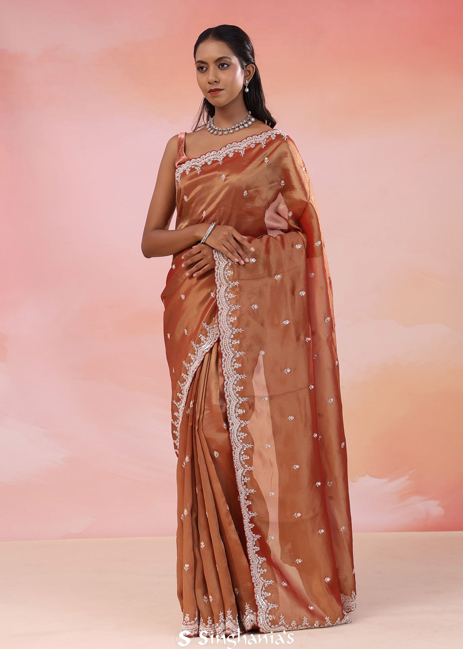 Copper Rose Pink Organza Tissue Saree With Scallop Border