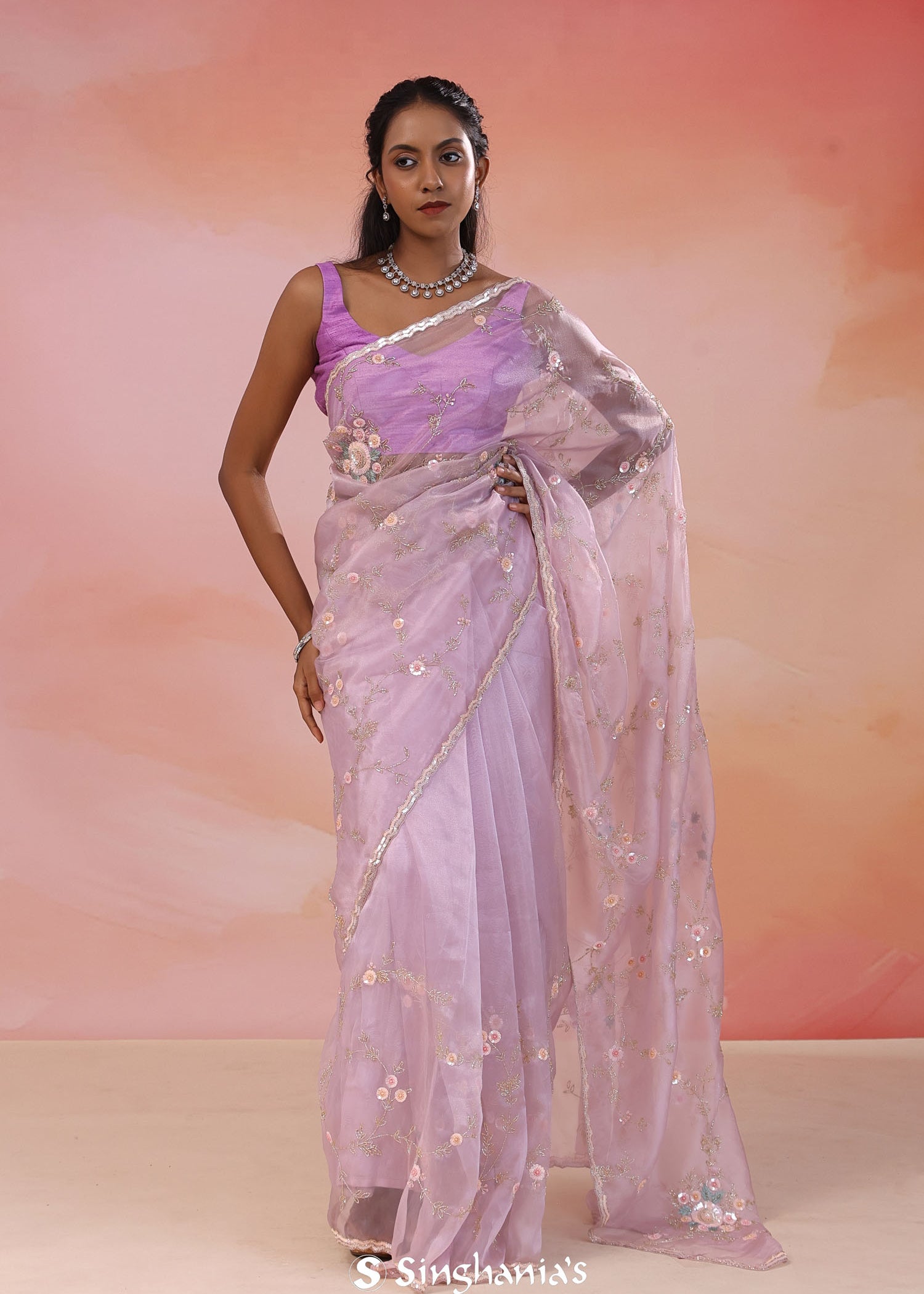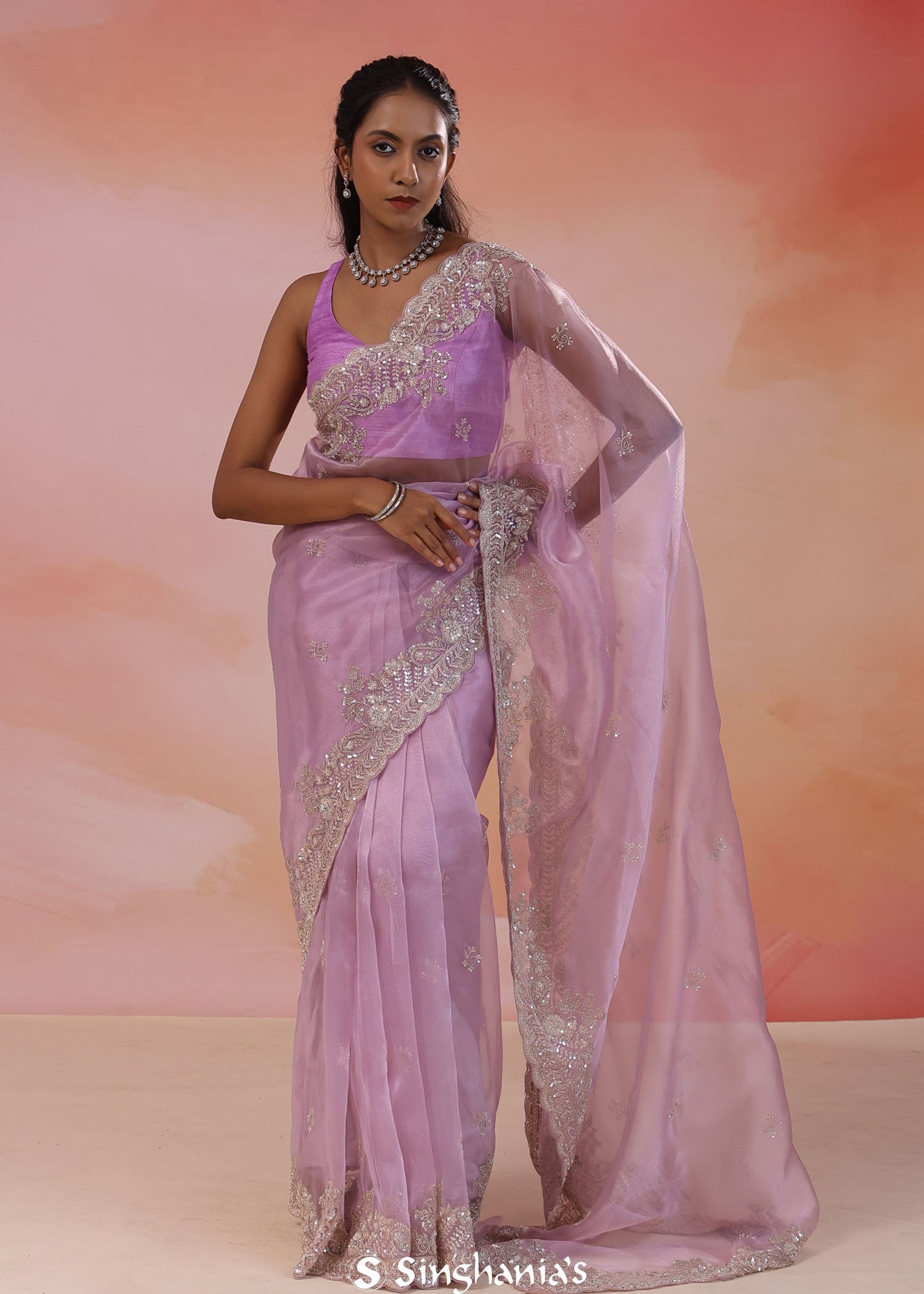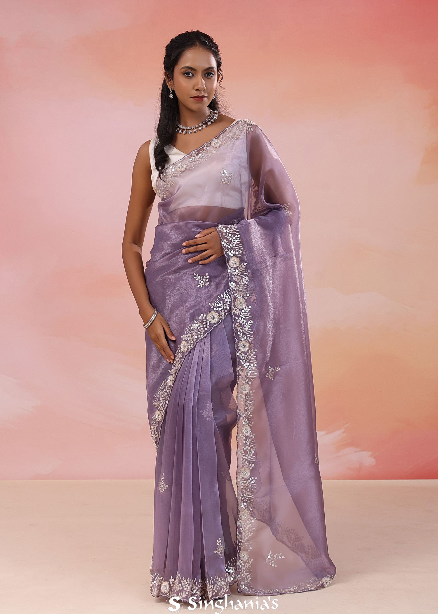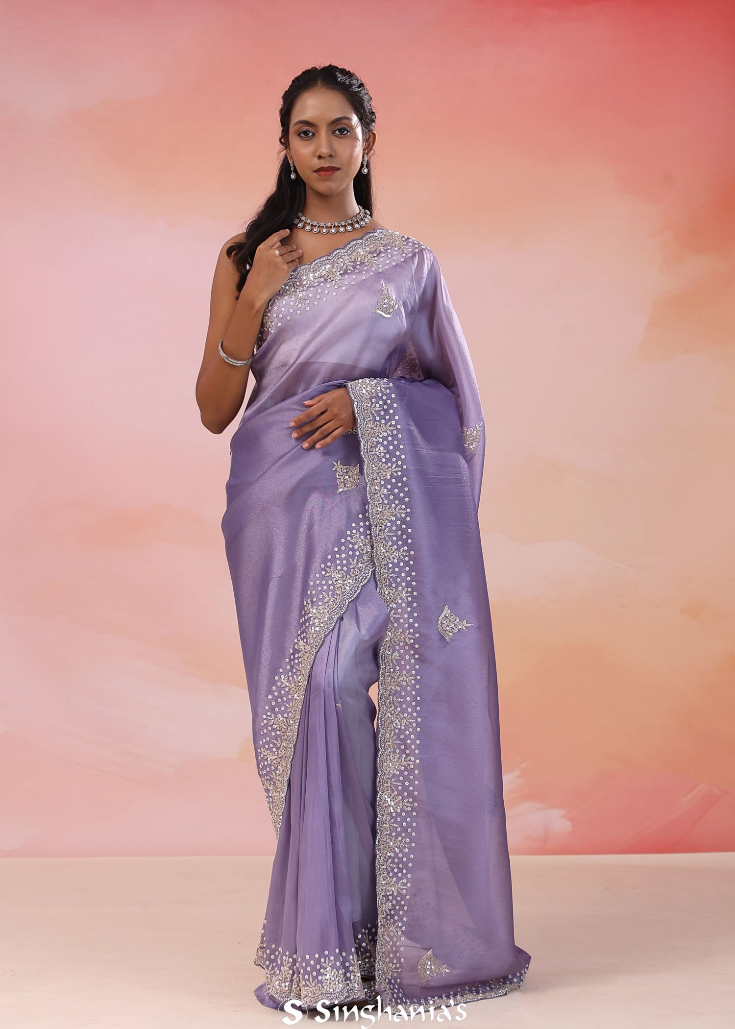 Dusty Lavender Organza Tissue Saree With Scallop Border