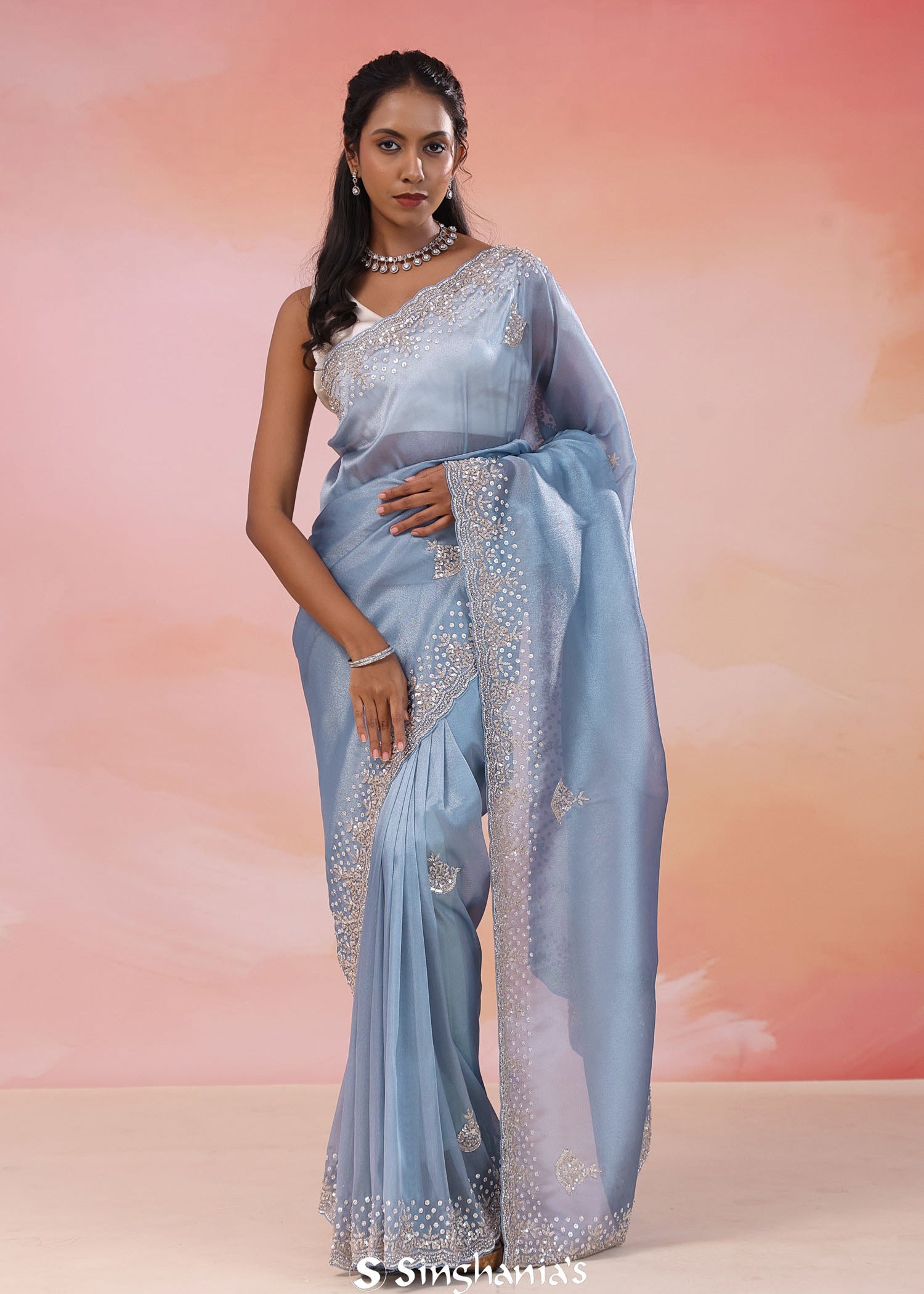 Dark Pastel Blue Organza Tissue Saree With Scallop Border