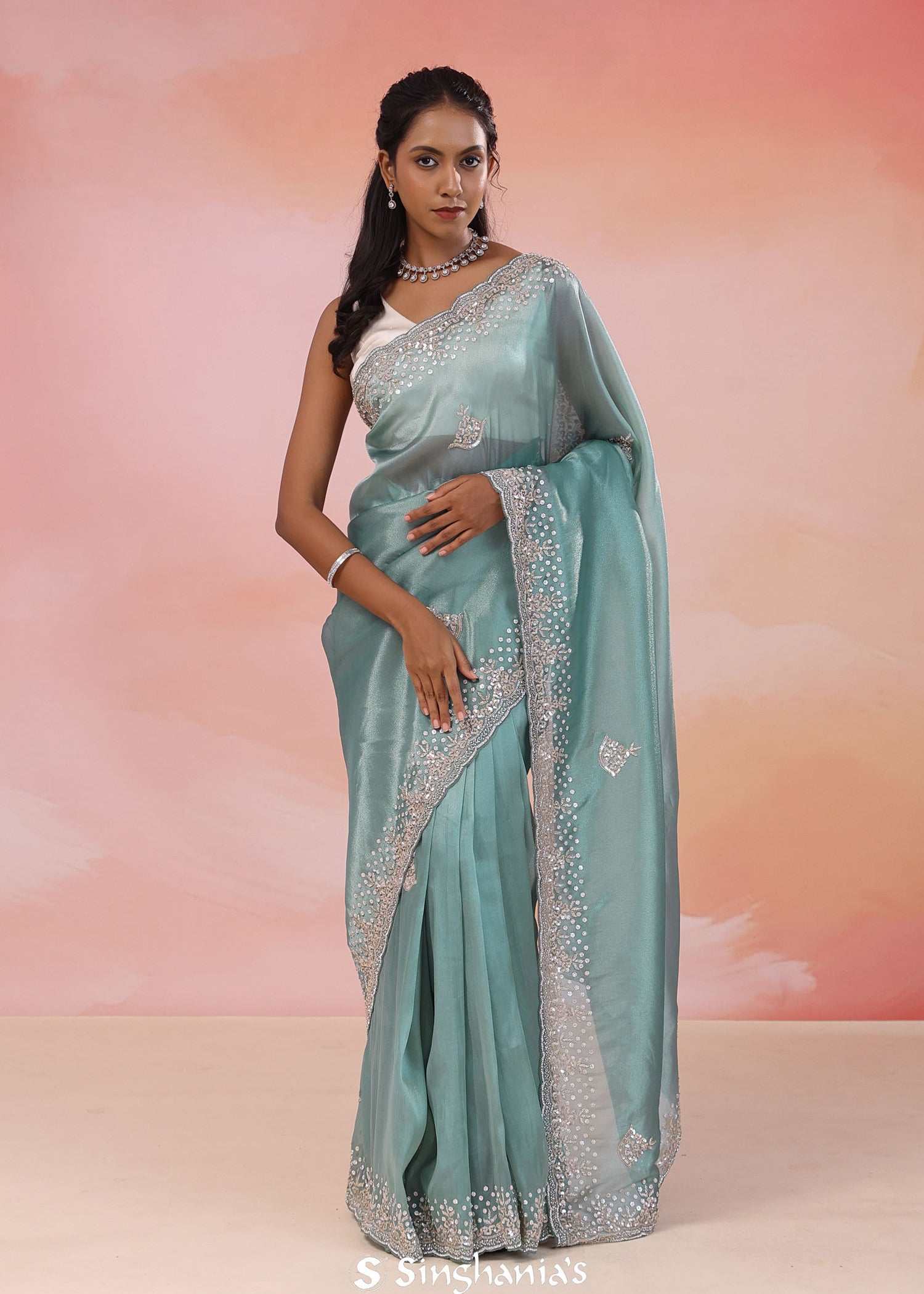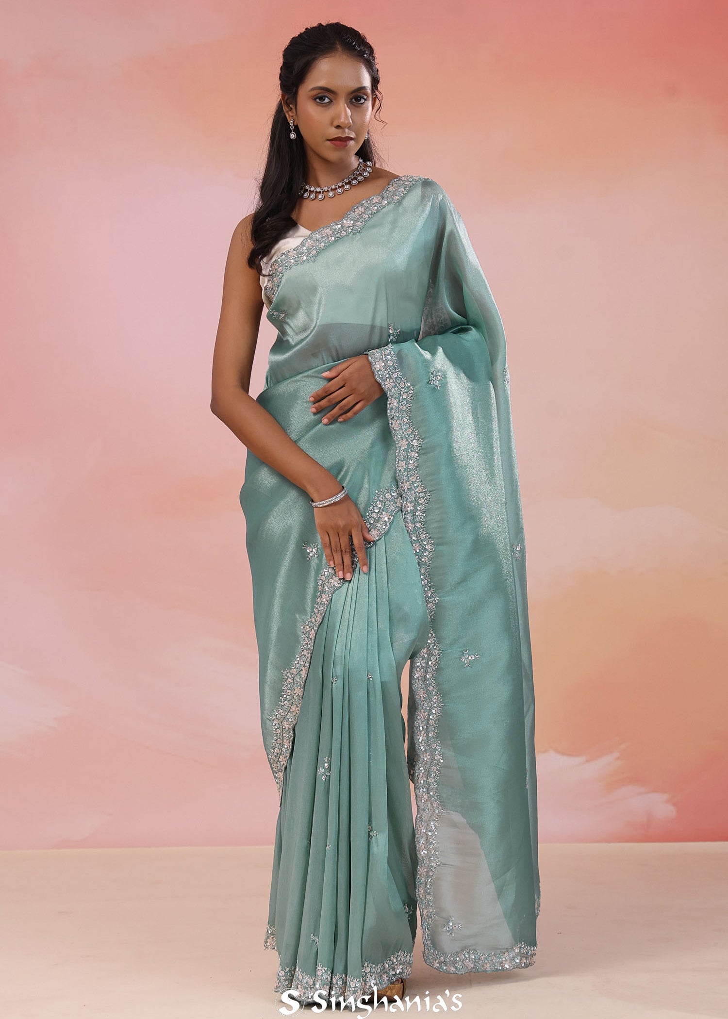 Como Greenish Cyan Organza Tissue Saree With Scallop Border