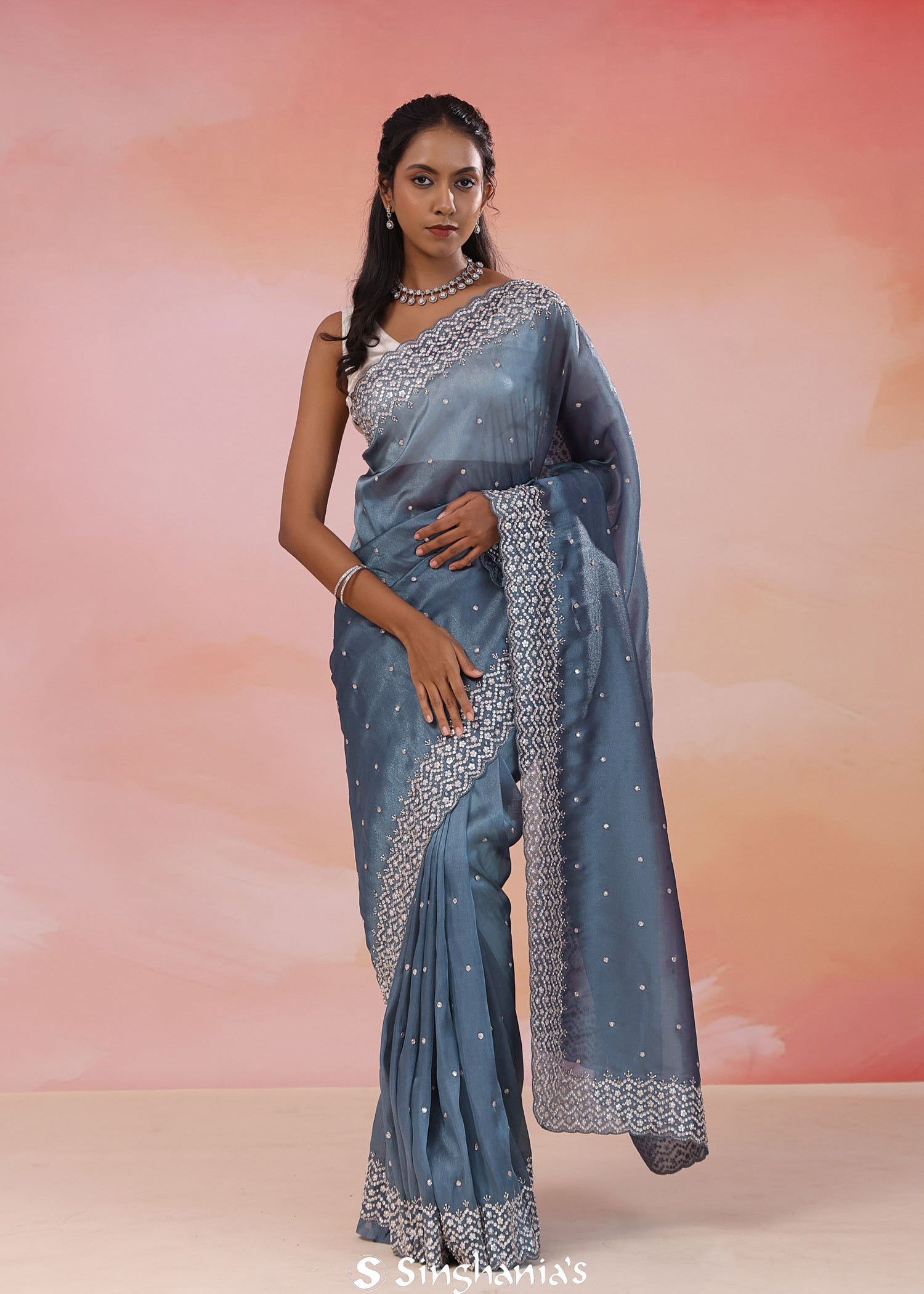 Gray Blue Organza Tissue Saree With Scallop Border