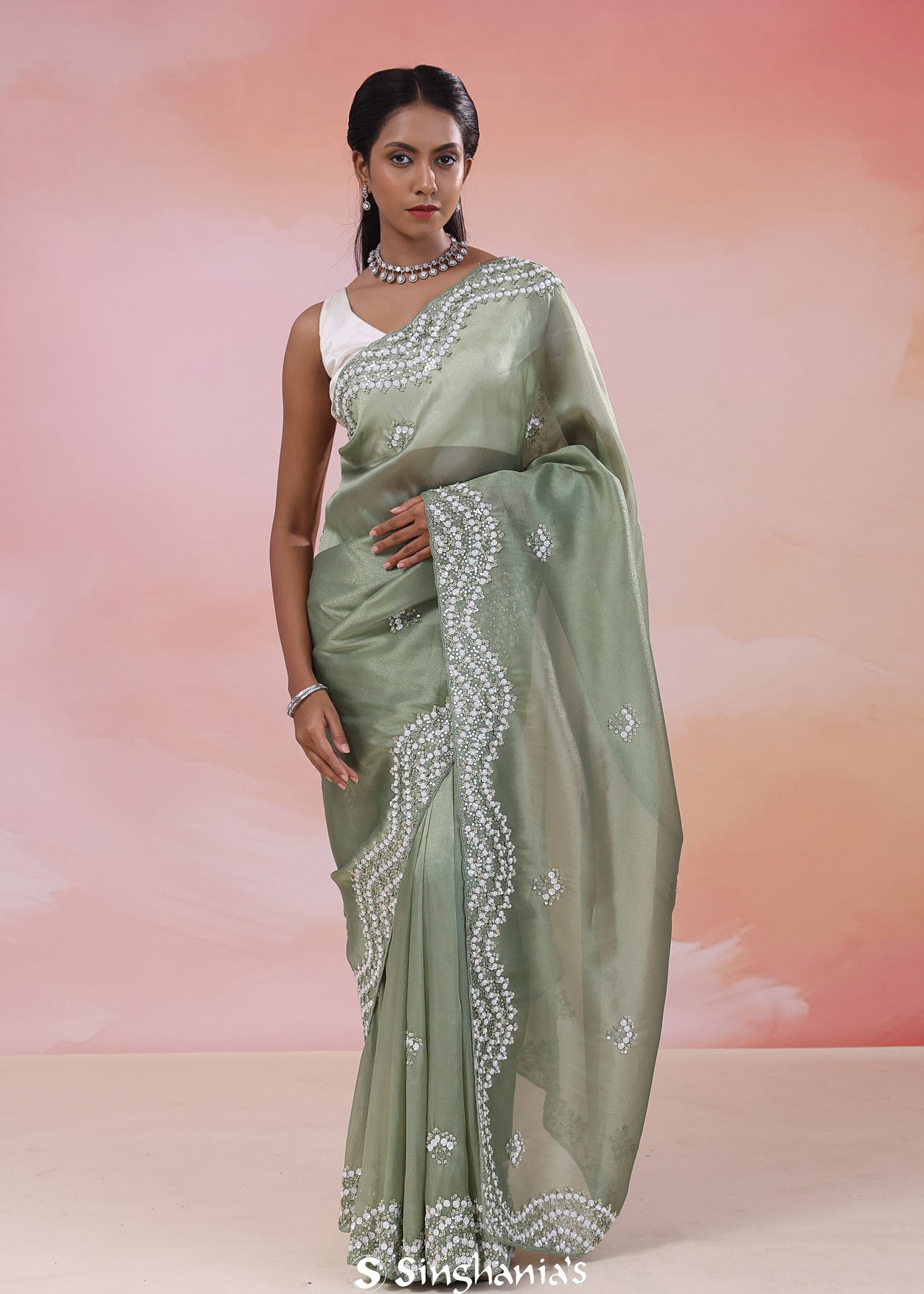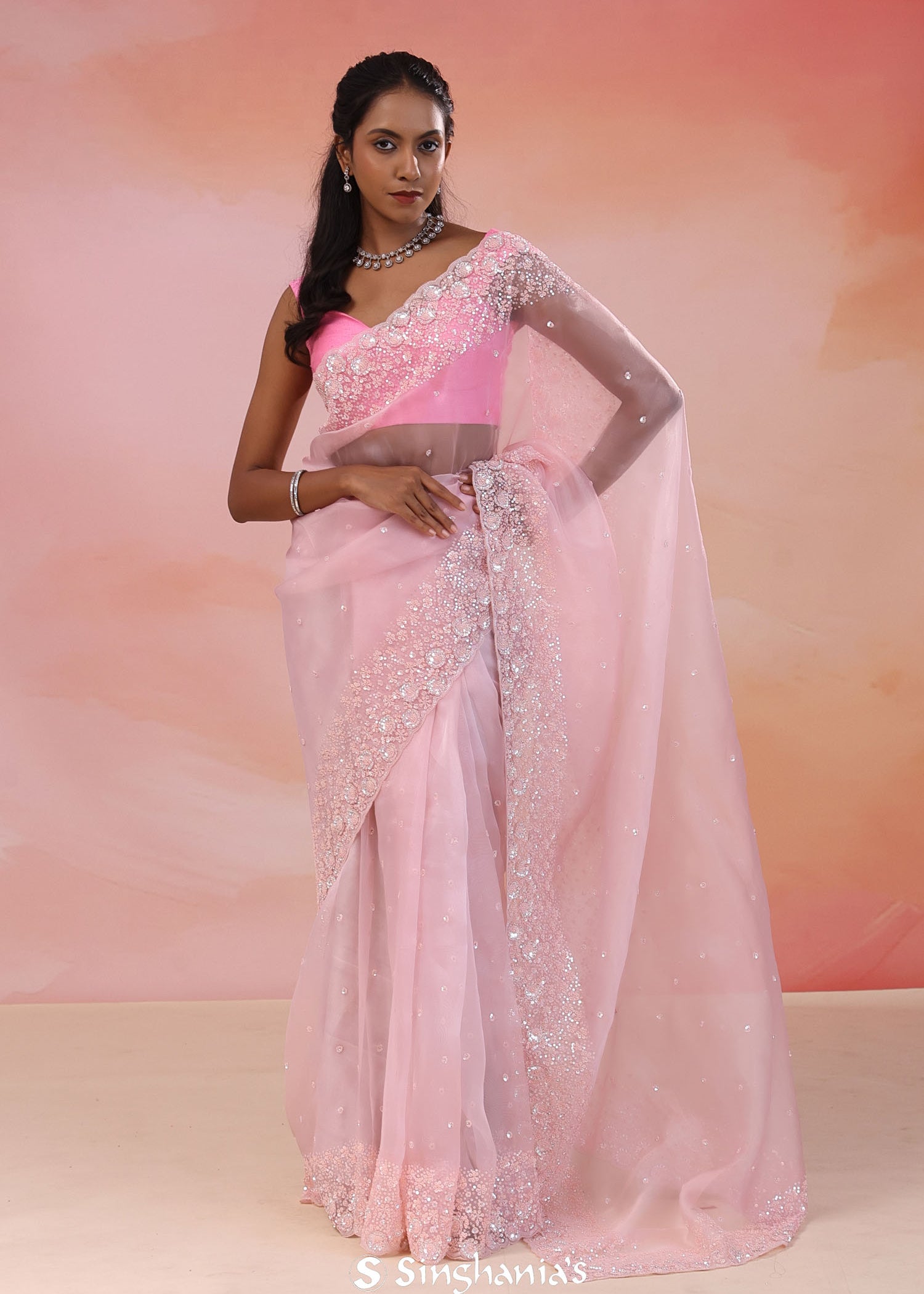 Pastel Pink Organza Tissue Saree With Scallop Border