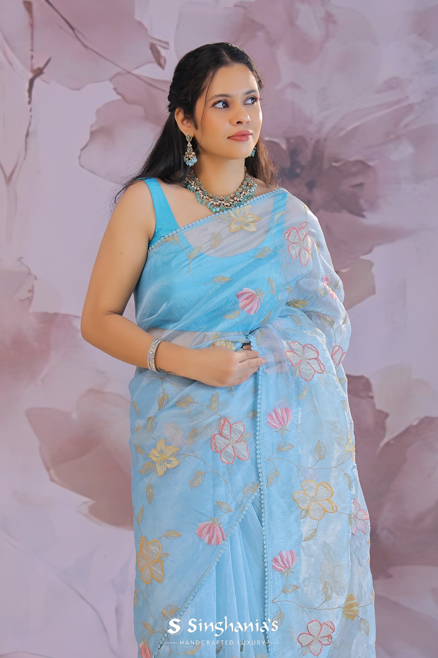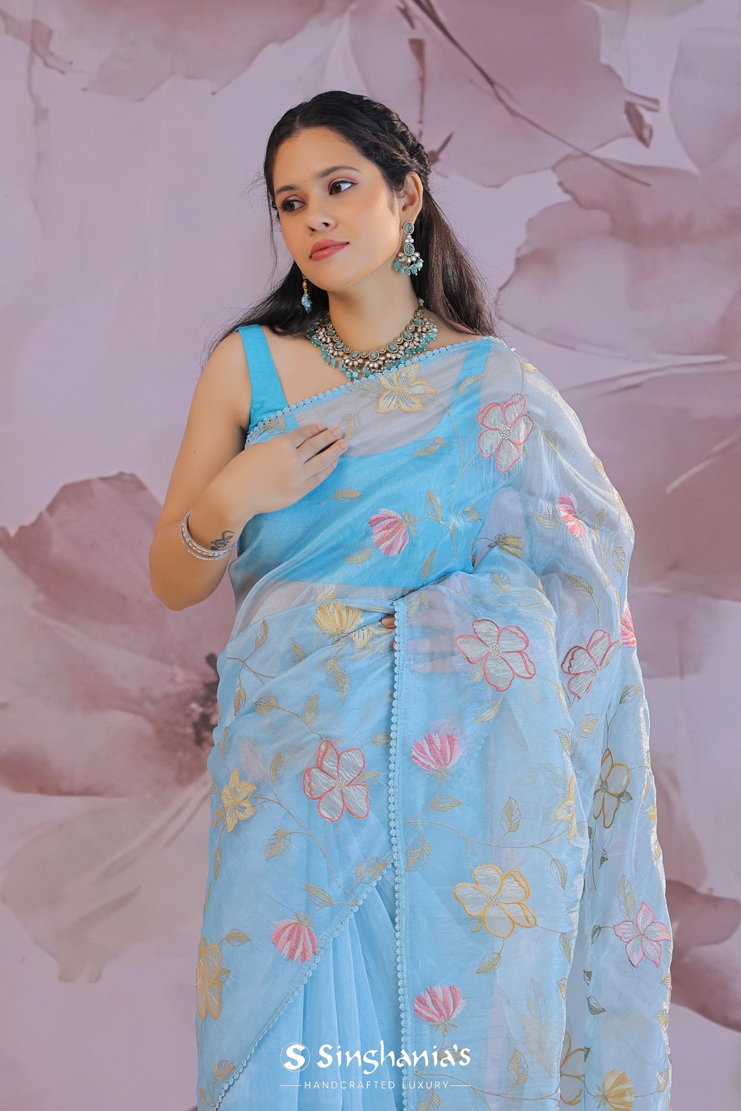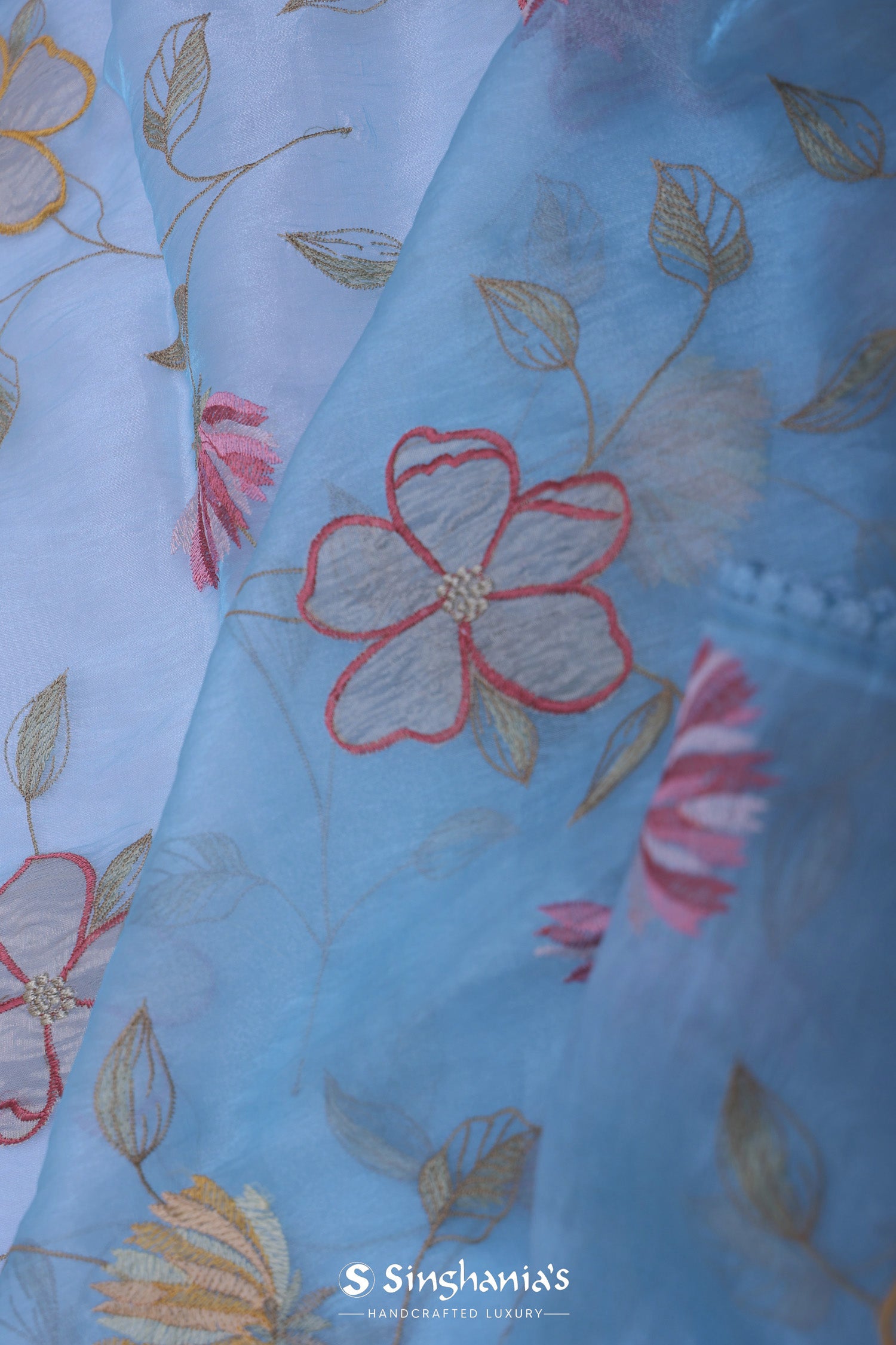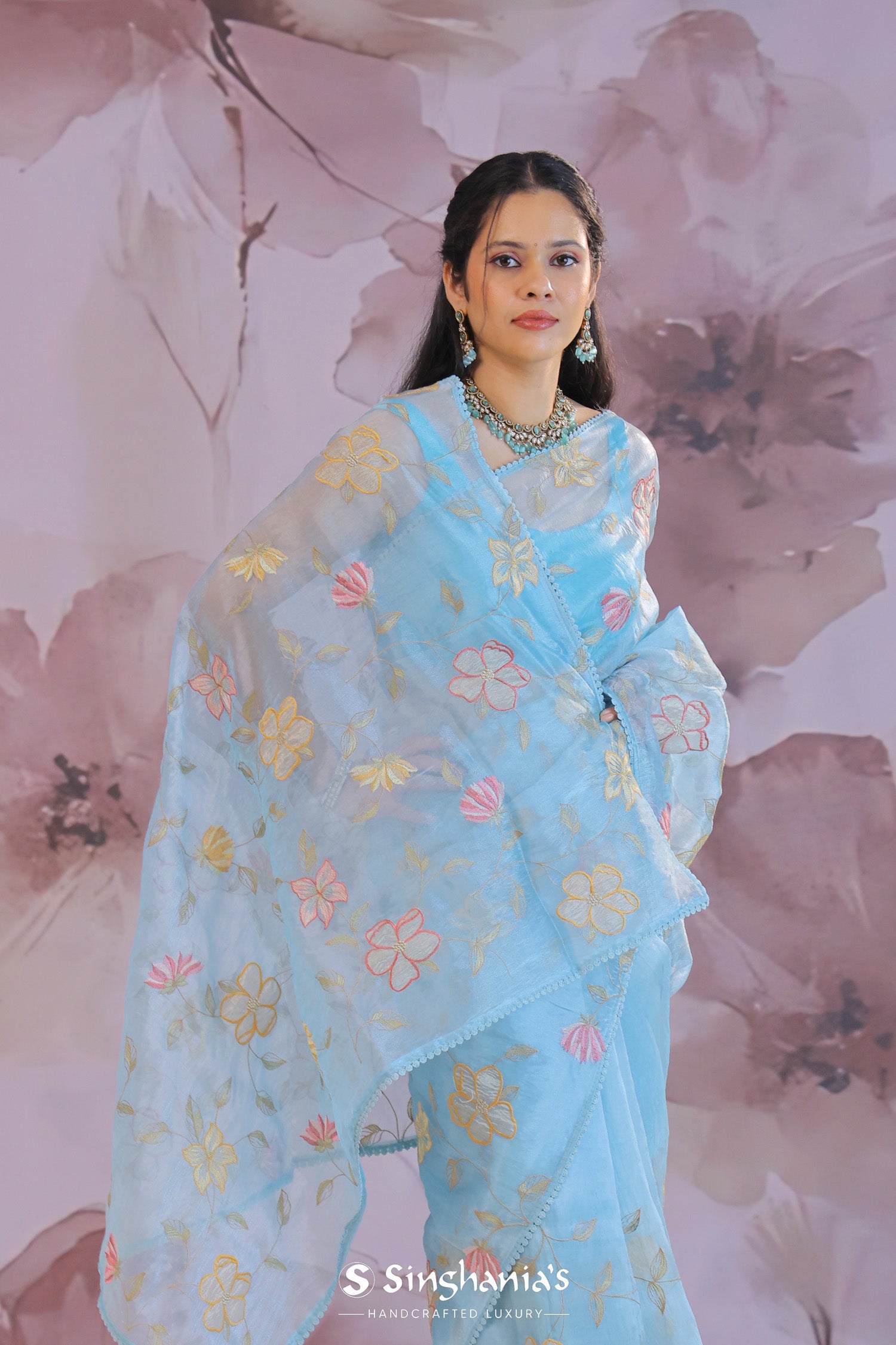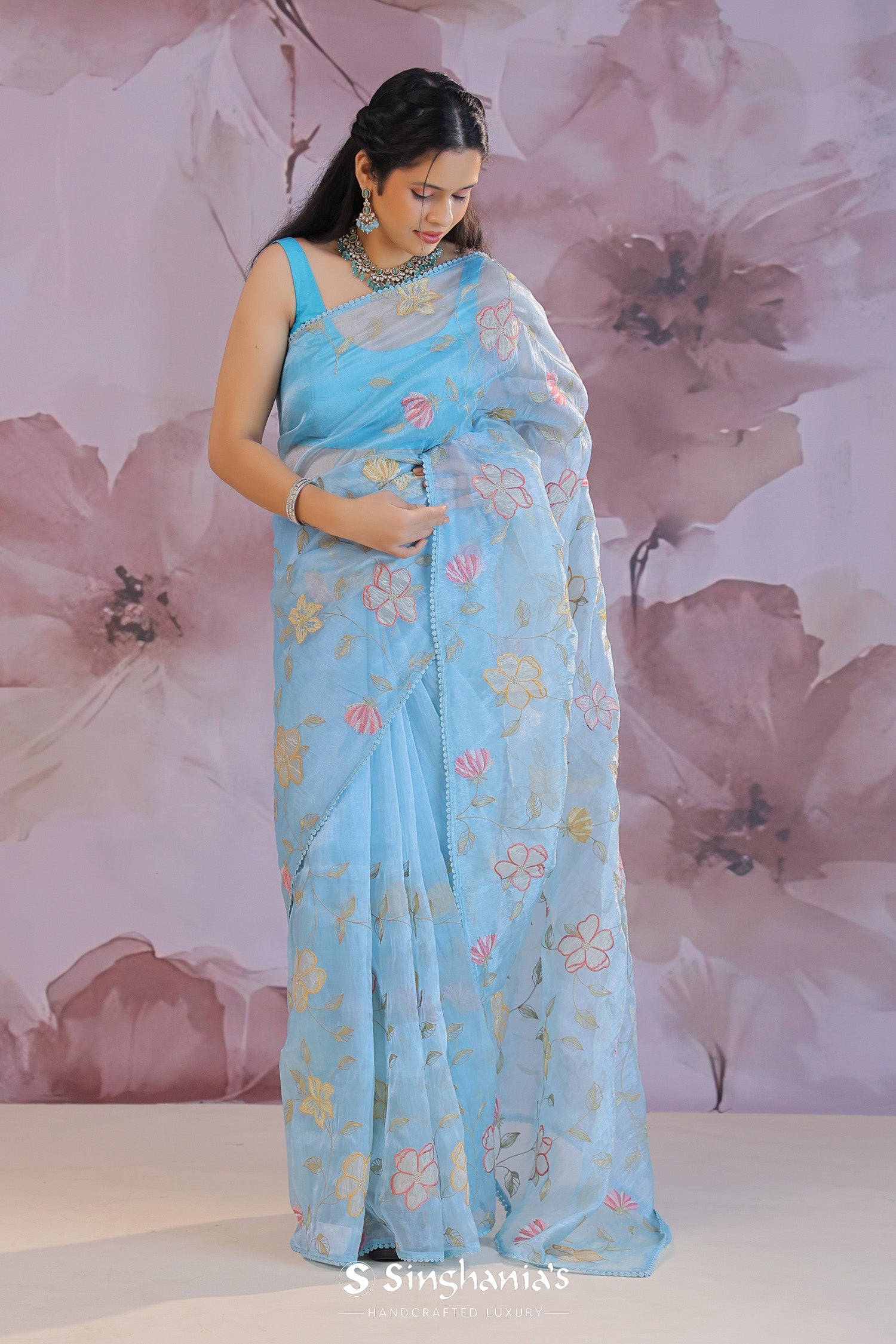 Dark pastel blue organza tissue saree features floral and leaf embroidery spread all over the body of the saree in contrast colors makes it stand out from other saree.