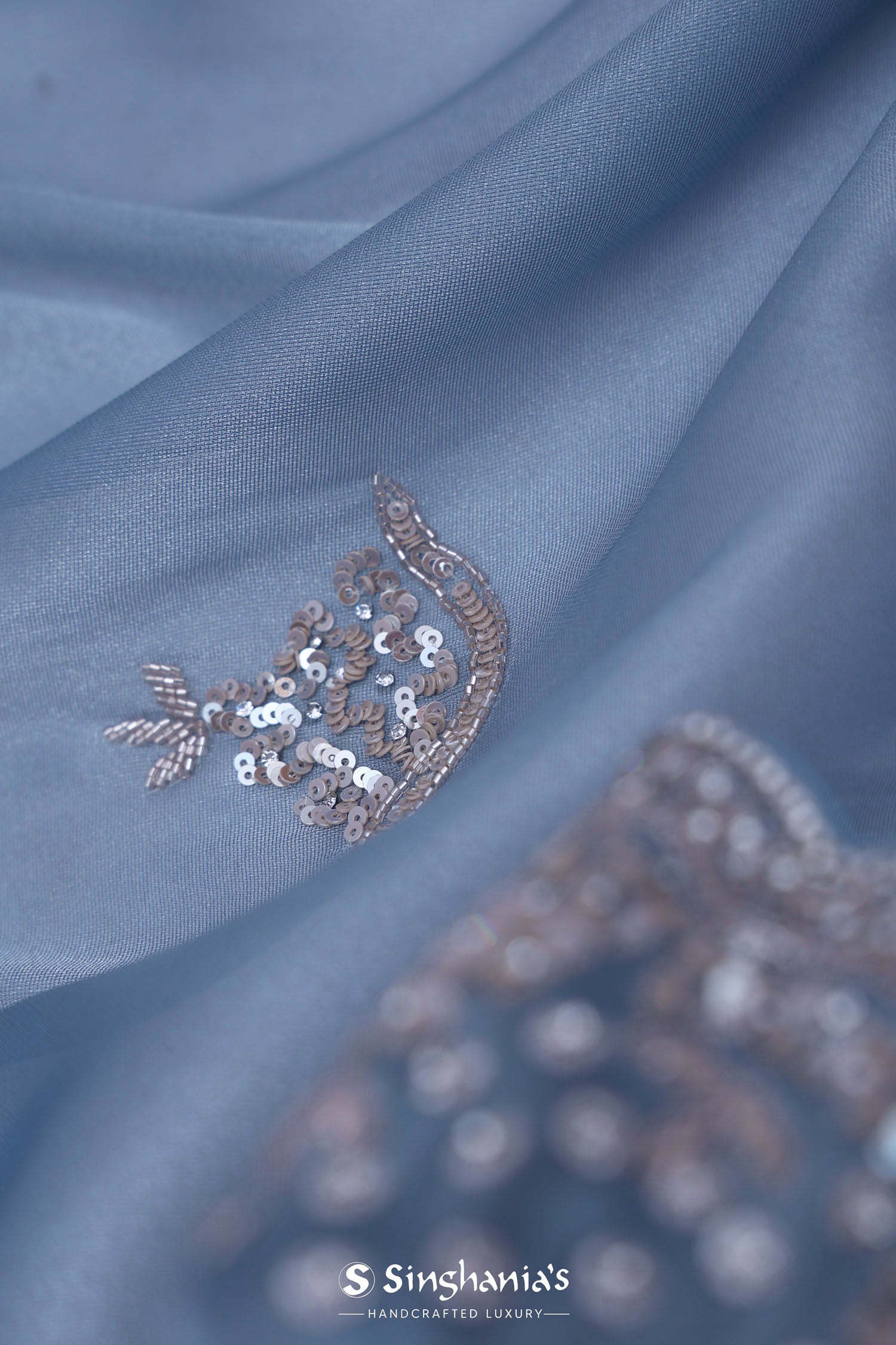 The butta's formed with sequins work scattered on the body of Dark pastel Blue organza tissue saree complemented with fancy border and unstitched blouse