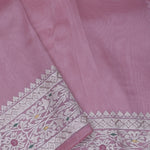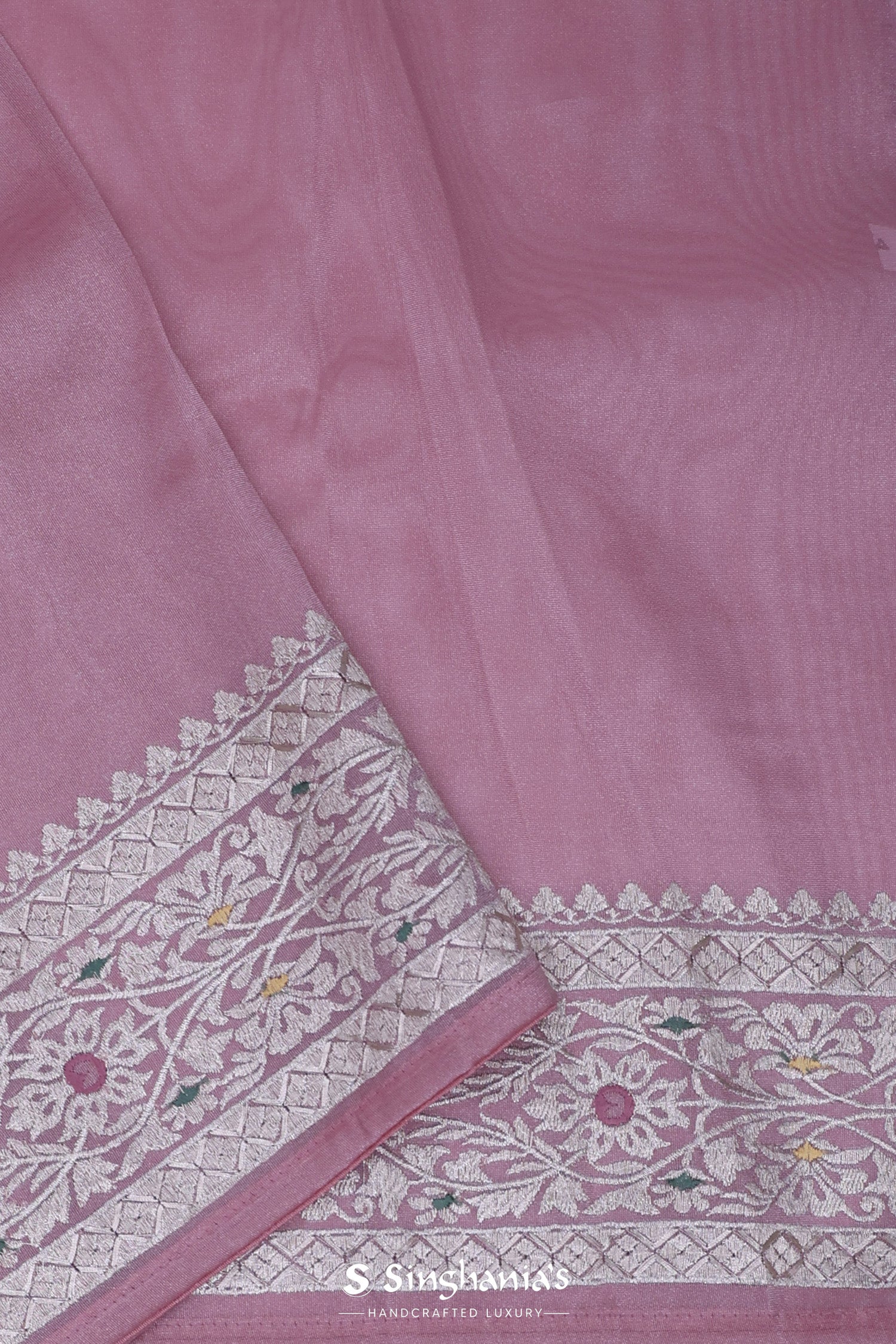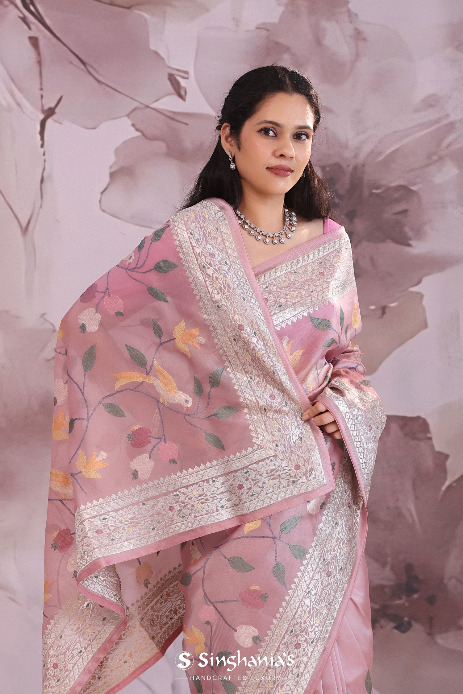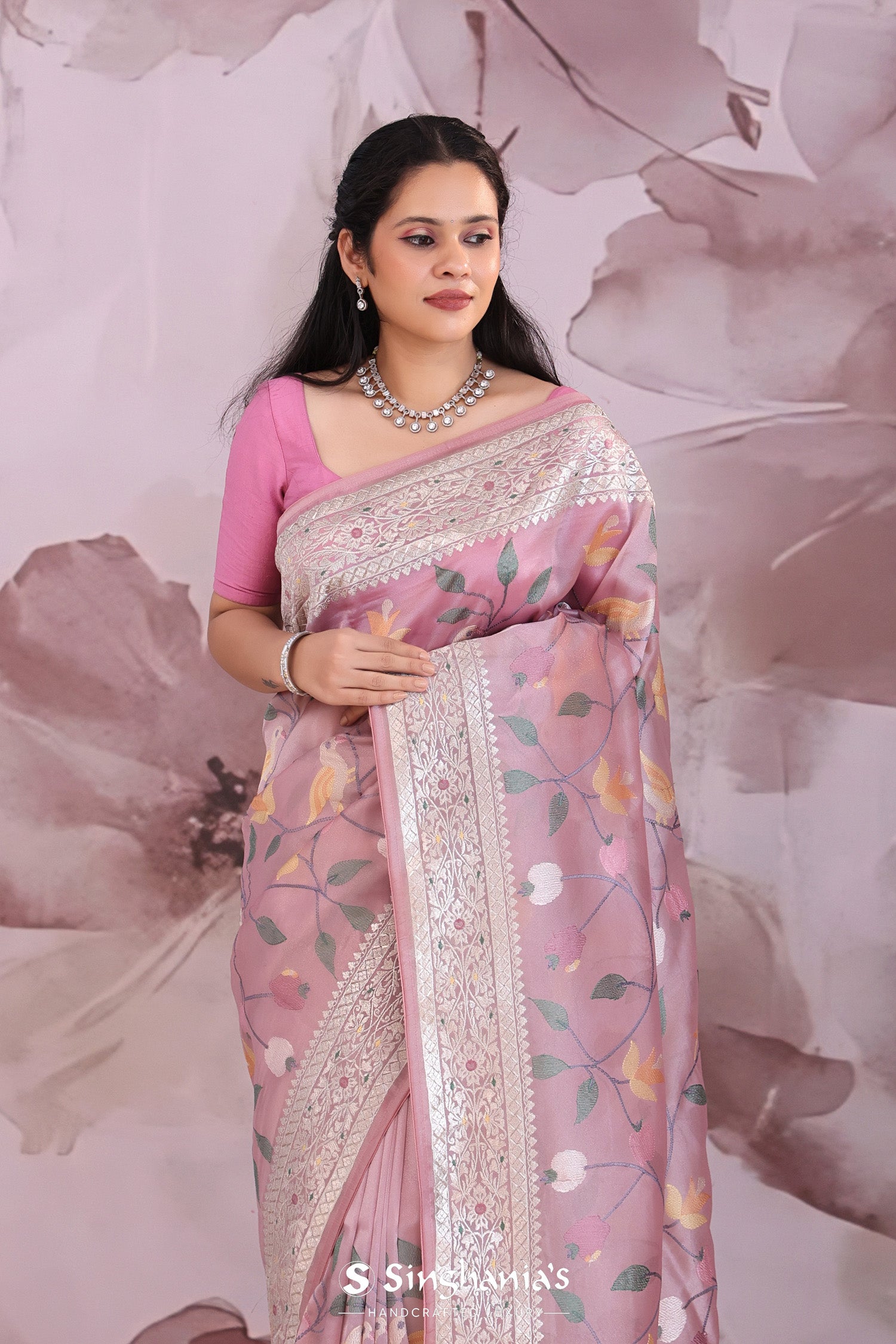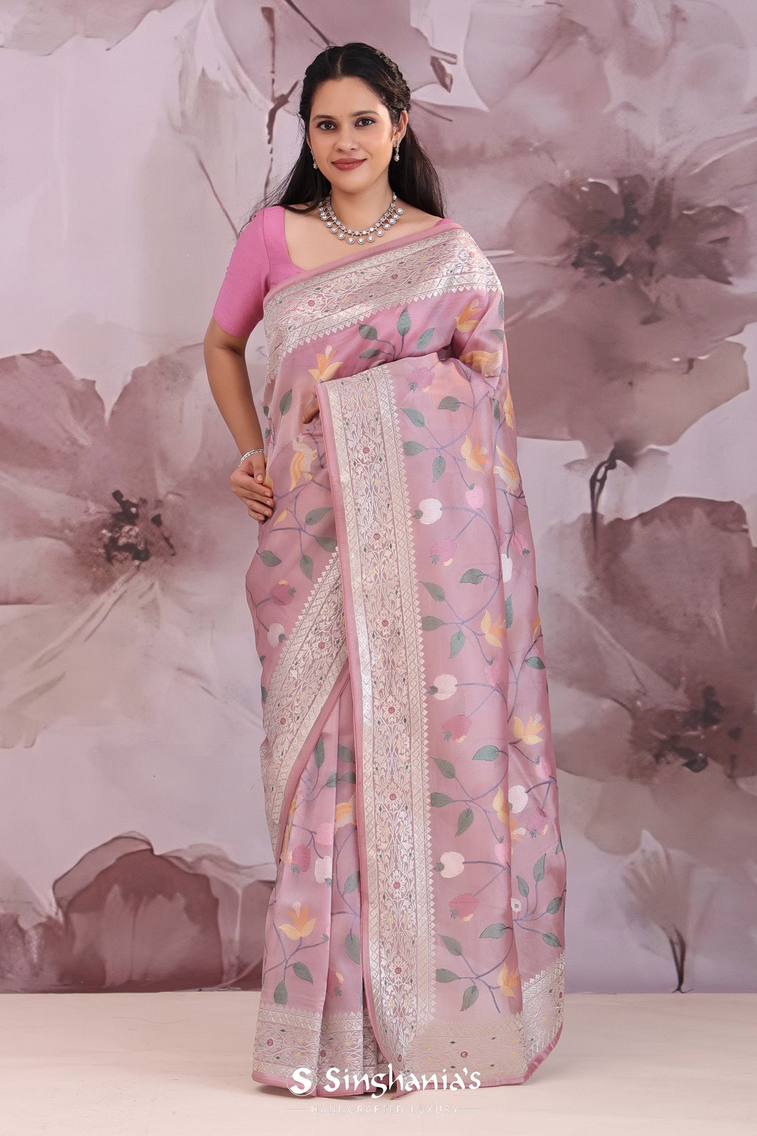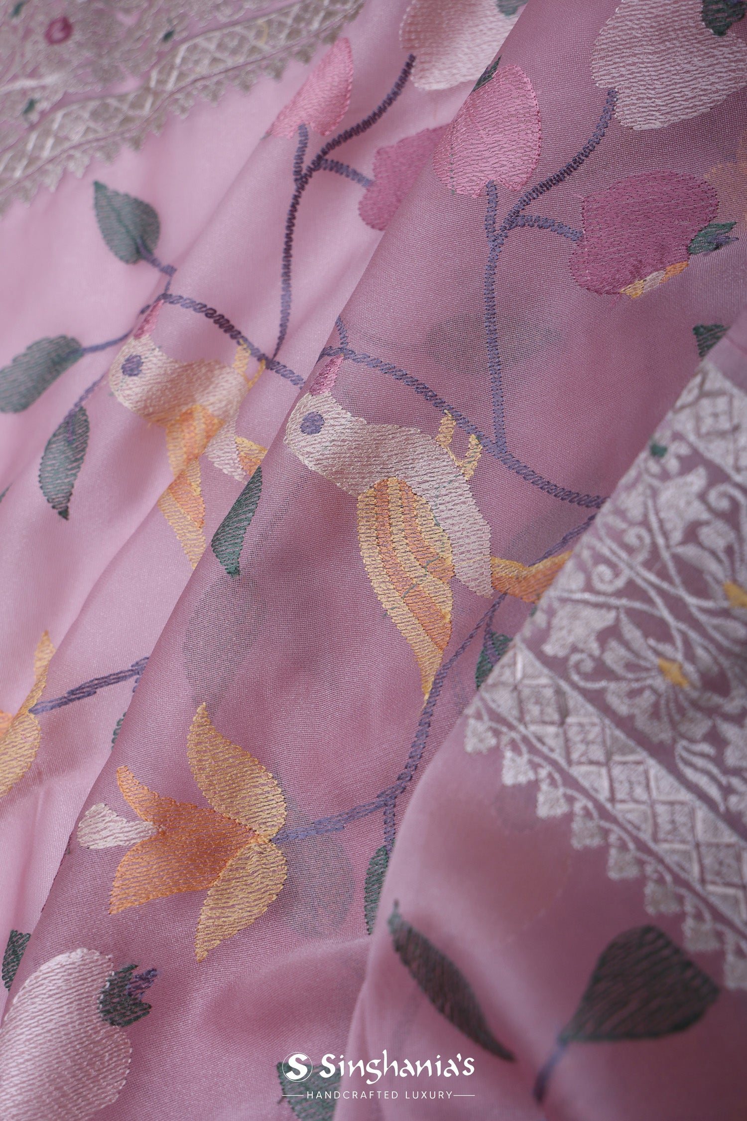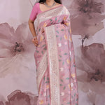 This Dusky pink organza saree features leaf,floral and avian jaal embroidered spread all across the body of saree along with meenakari border which is adding the charm to overall look.