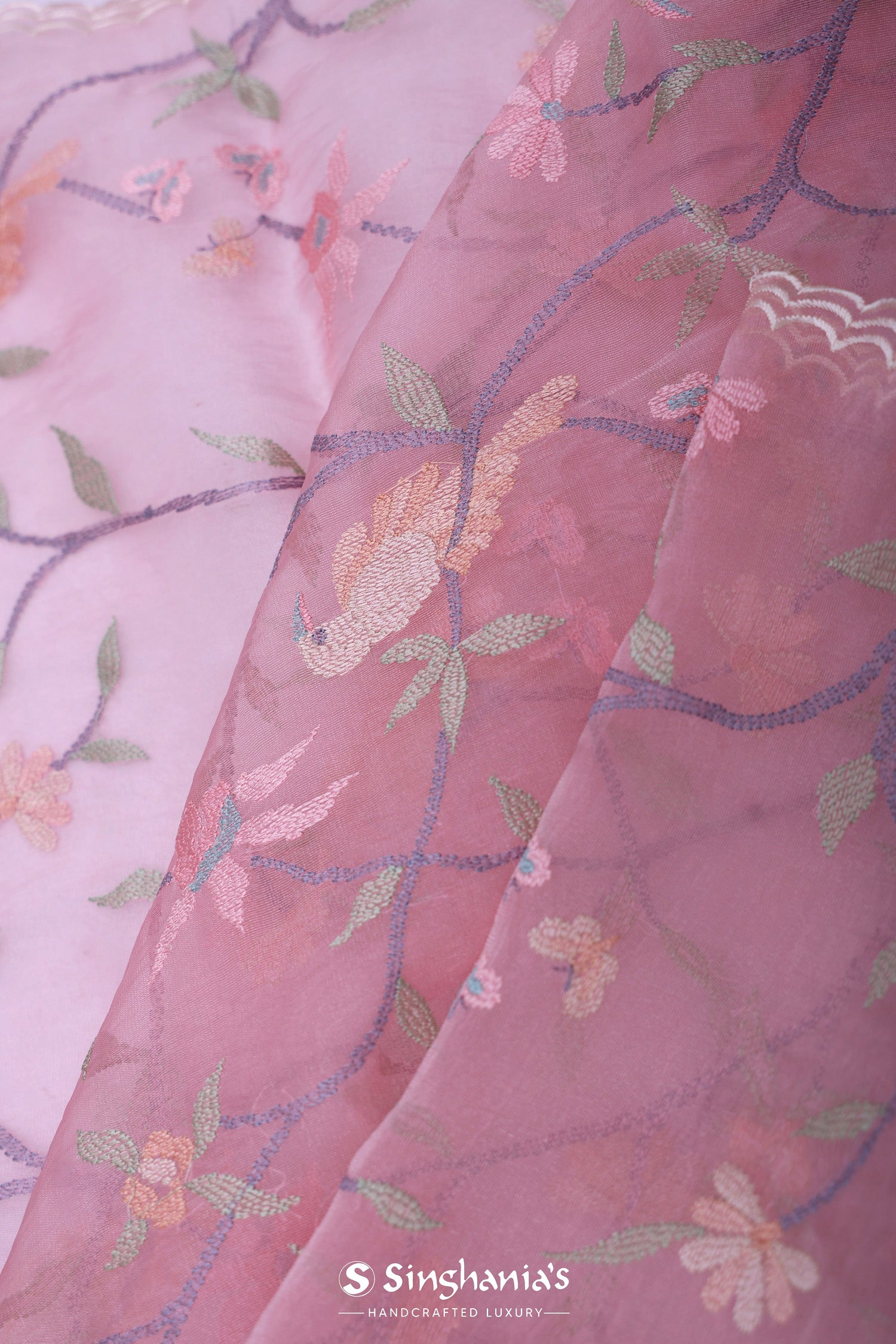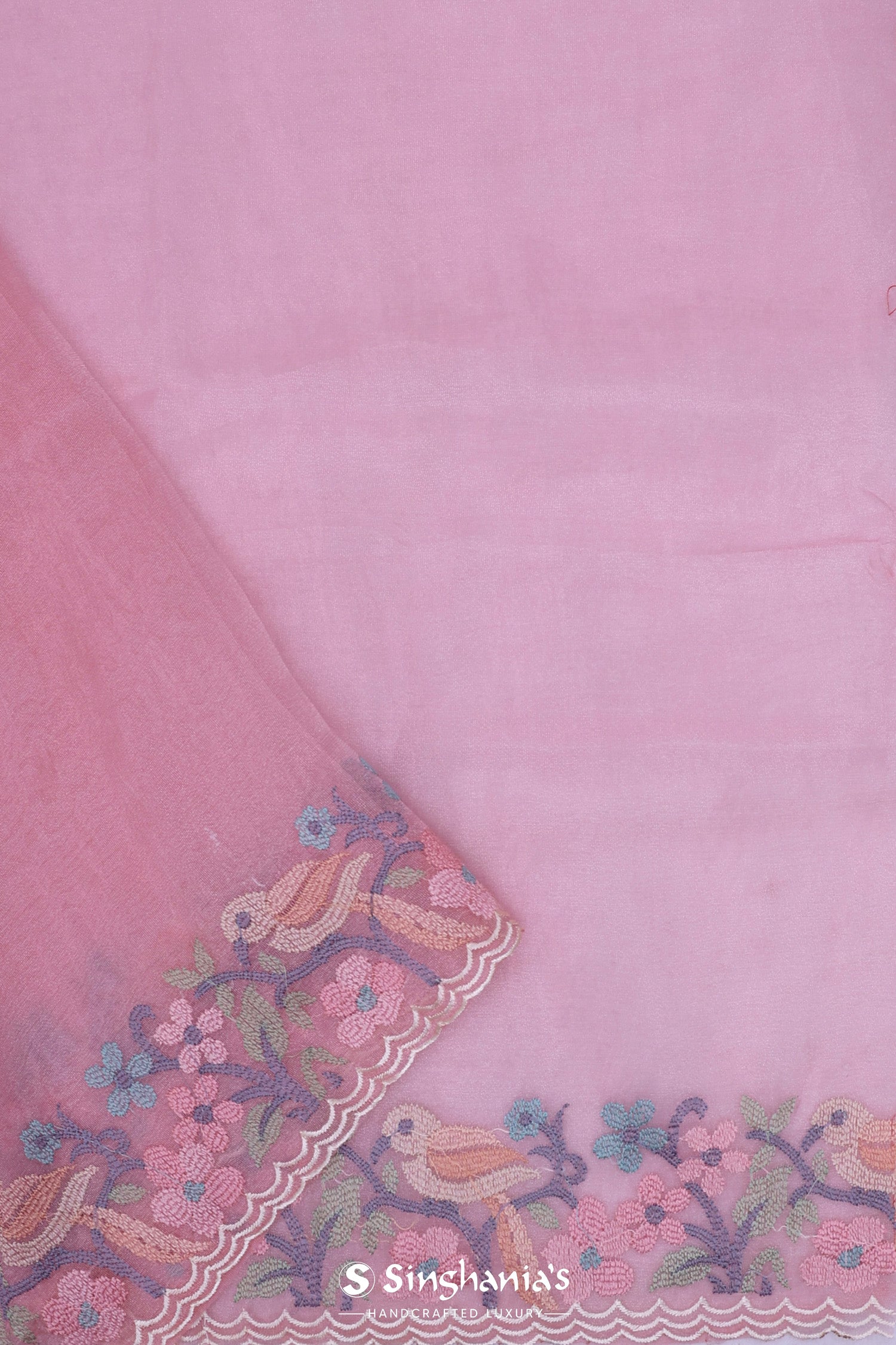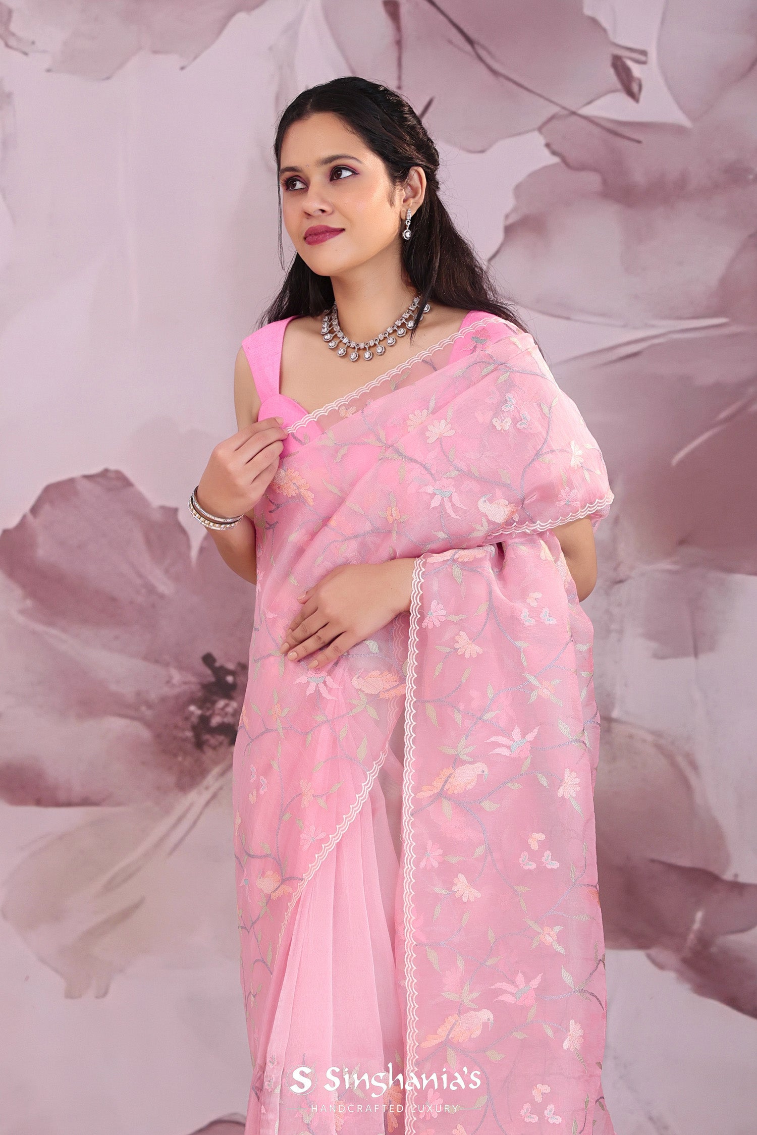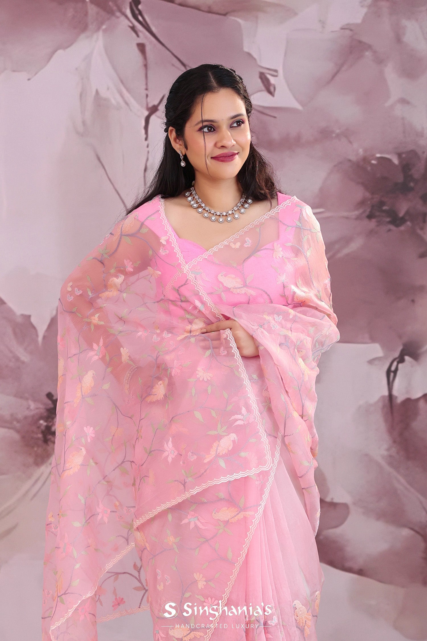 Flamingo pink organza saree presents leaf,avian and floral embroidery jaal in contrast colors along with scallop border which would light up every moment when you drape yourself with this .