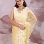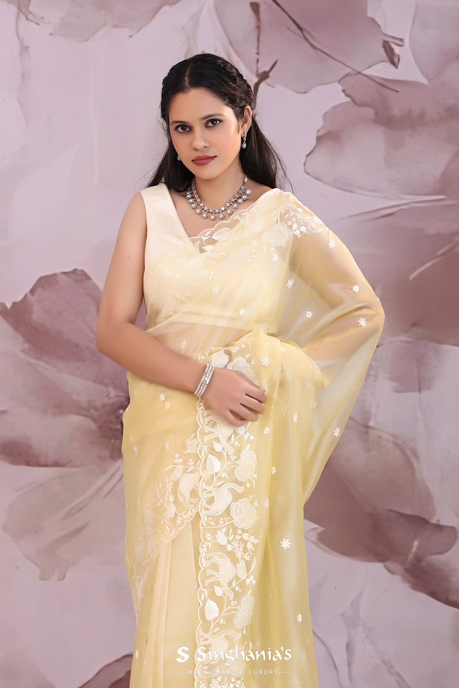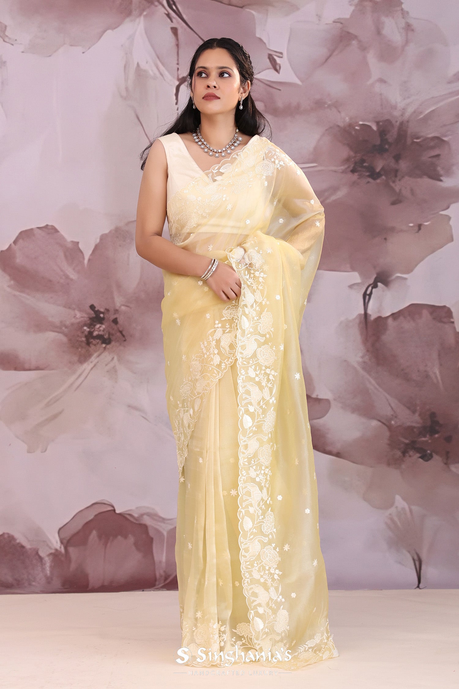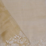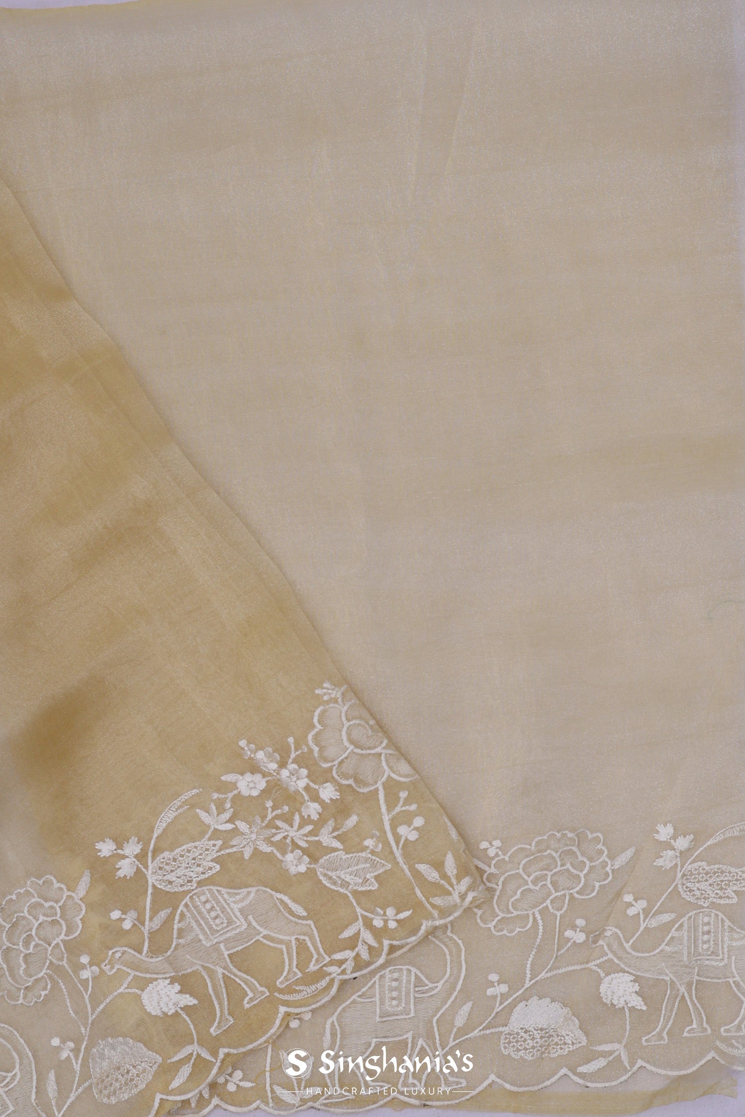 Light french beige organza tissue saree features floral butti's along with scallop border embellished with floral and camel figures which would light up every moment when you drape yourself with this.