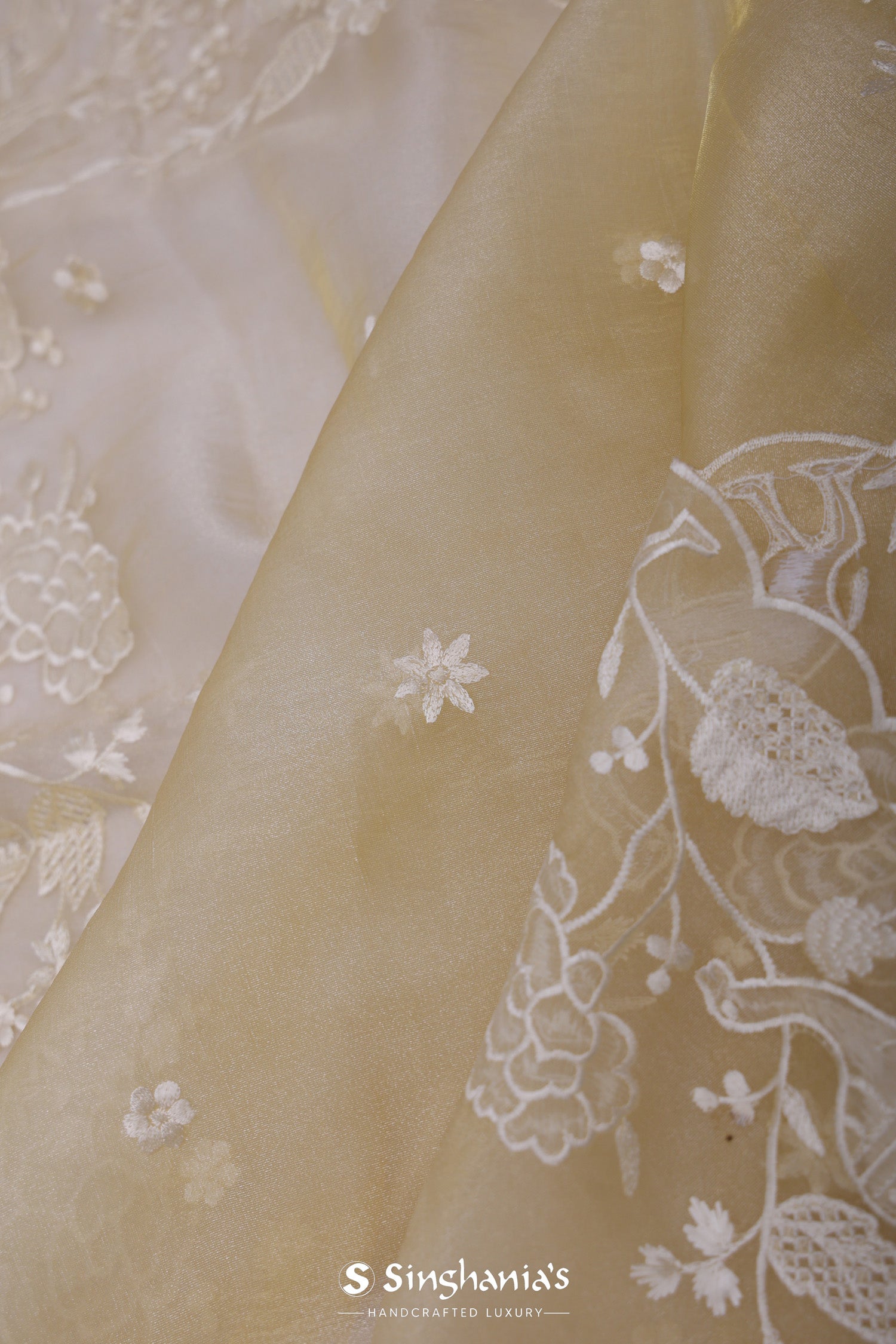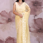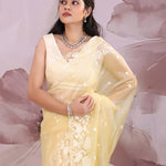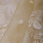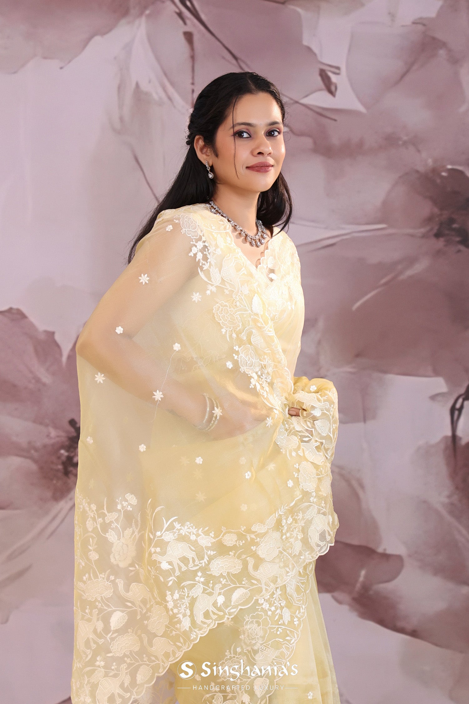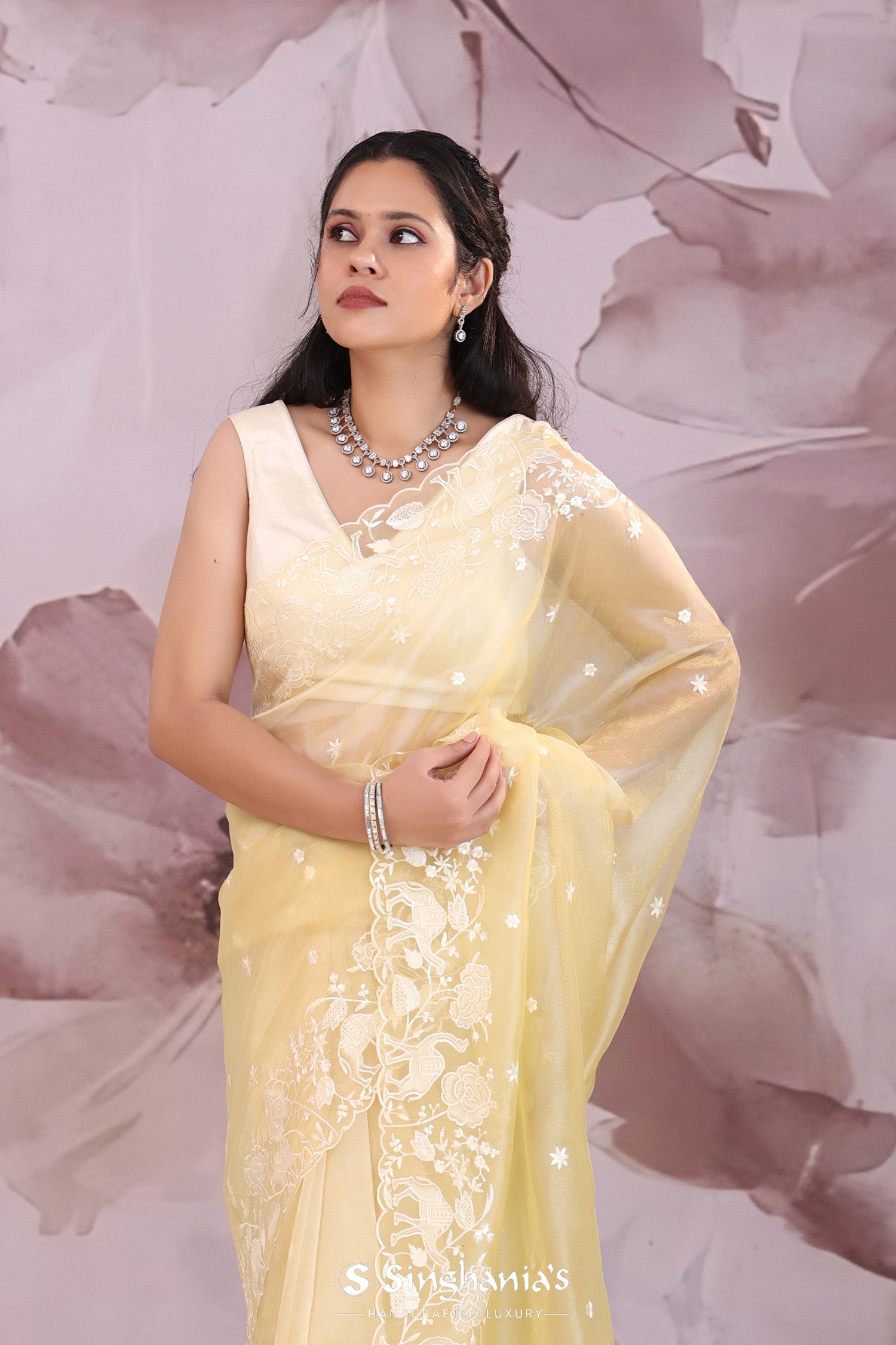 Light french beige organza tissue saree features floral butti's along with scallop border embellished with floral and camel figures which would light up every moment when you drape yourself with this.