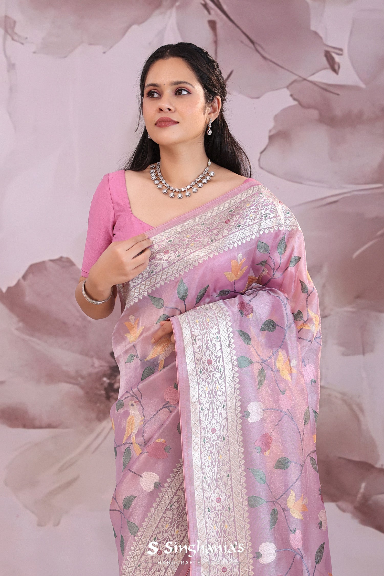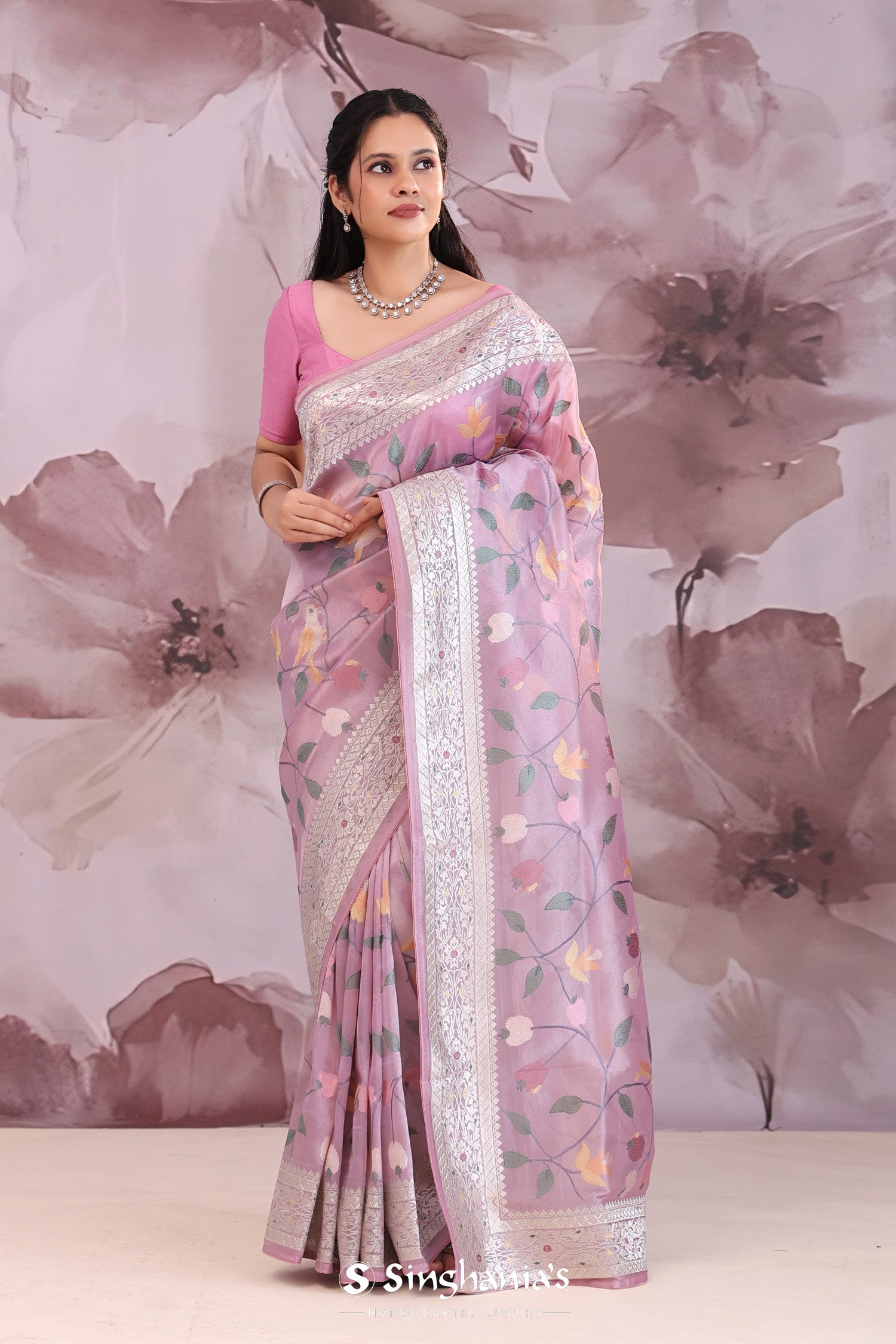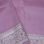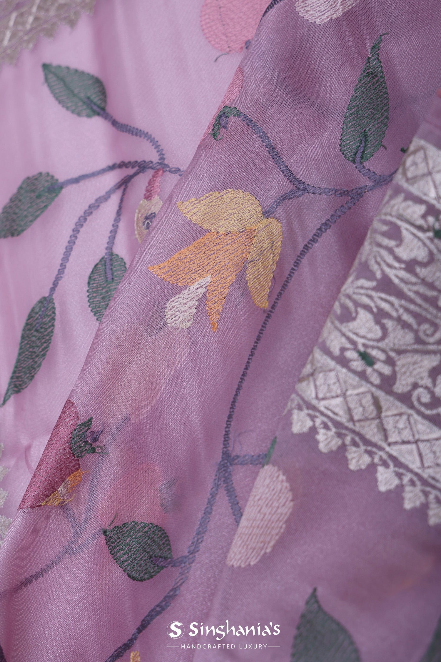 Lilac tissue saree features leaf,floral and avian jaal embroidered spread all across the body of saree along with meenakari border which is adding the charm to overall look.
