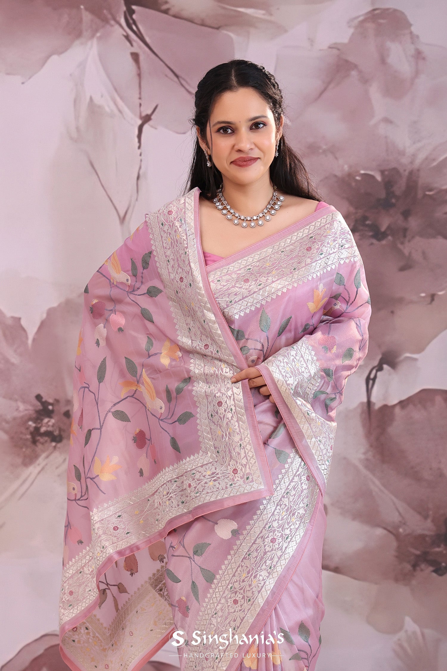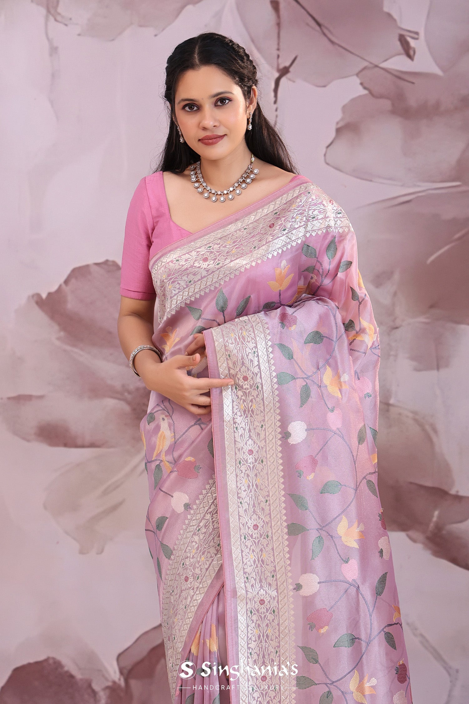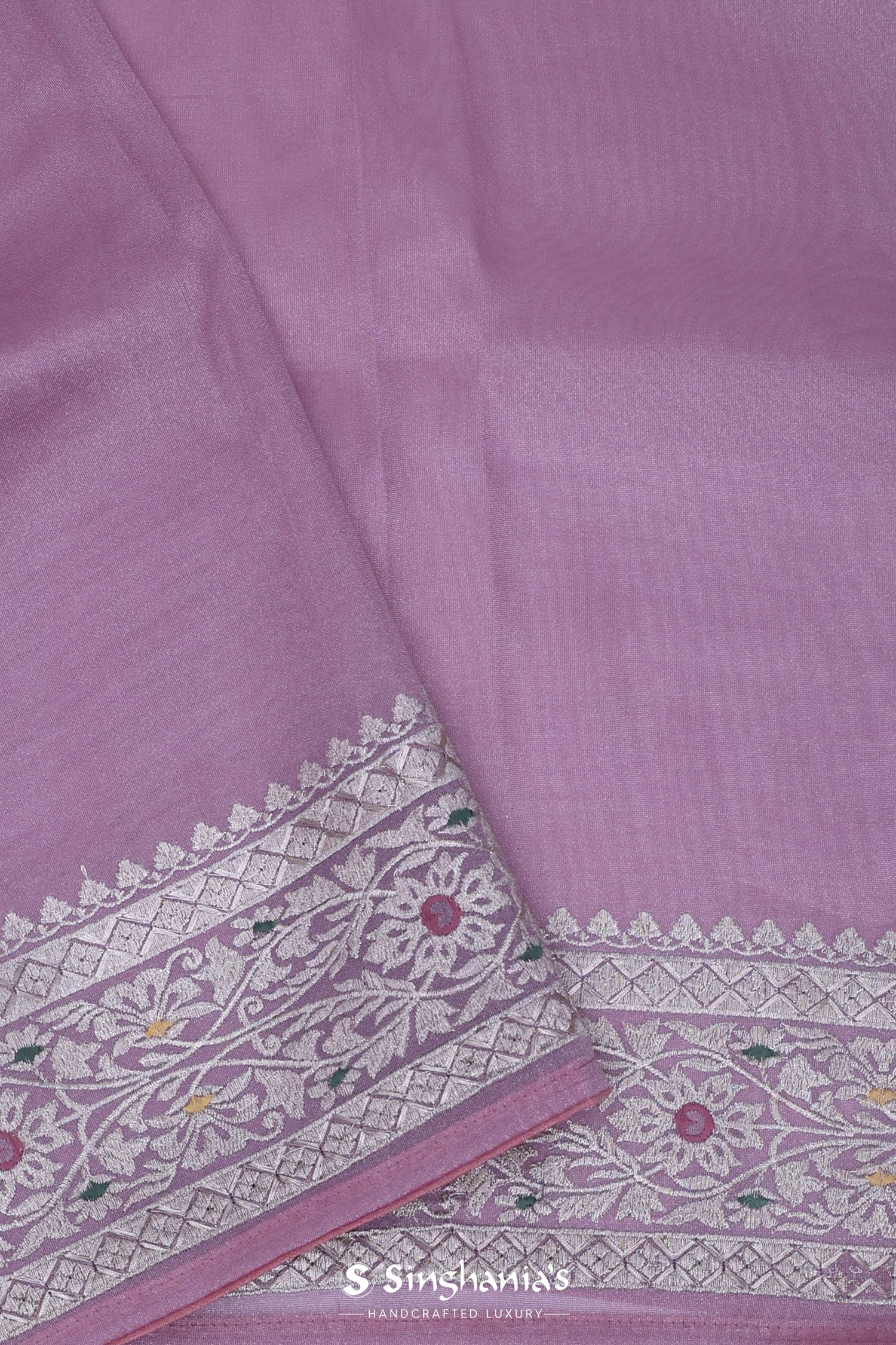 Lilac tissue saree features leaf,floral and avian jaal embroidered spread all across the body of saree along with meenakari border which is adding the charm to overall look.