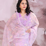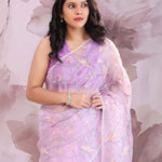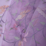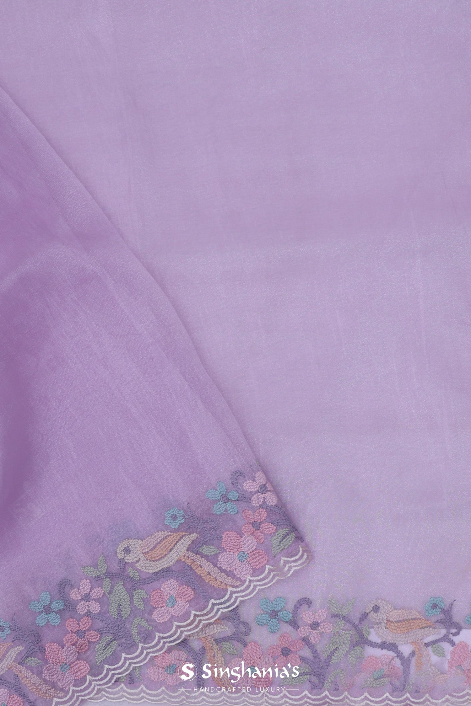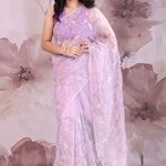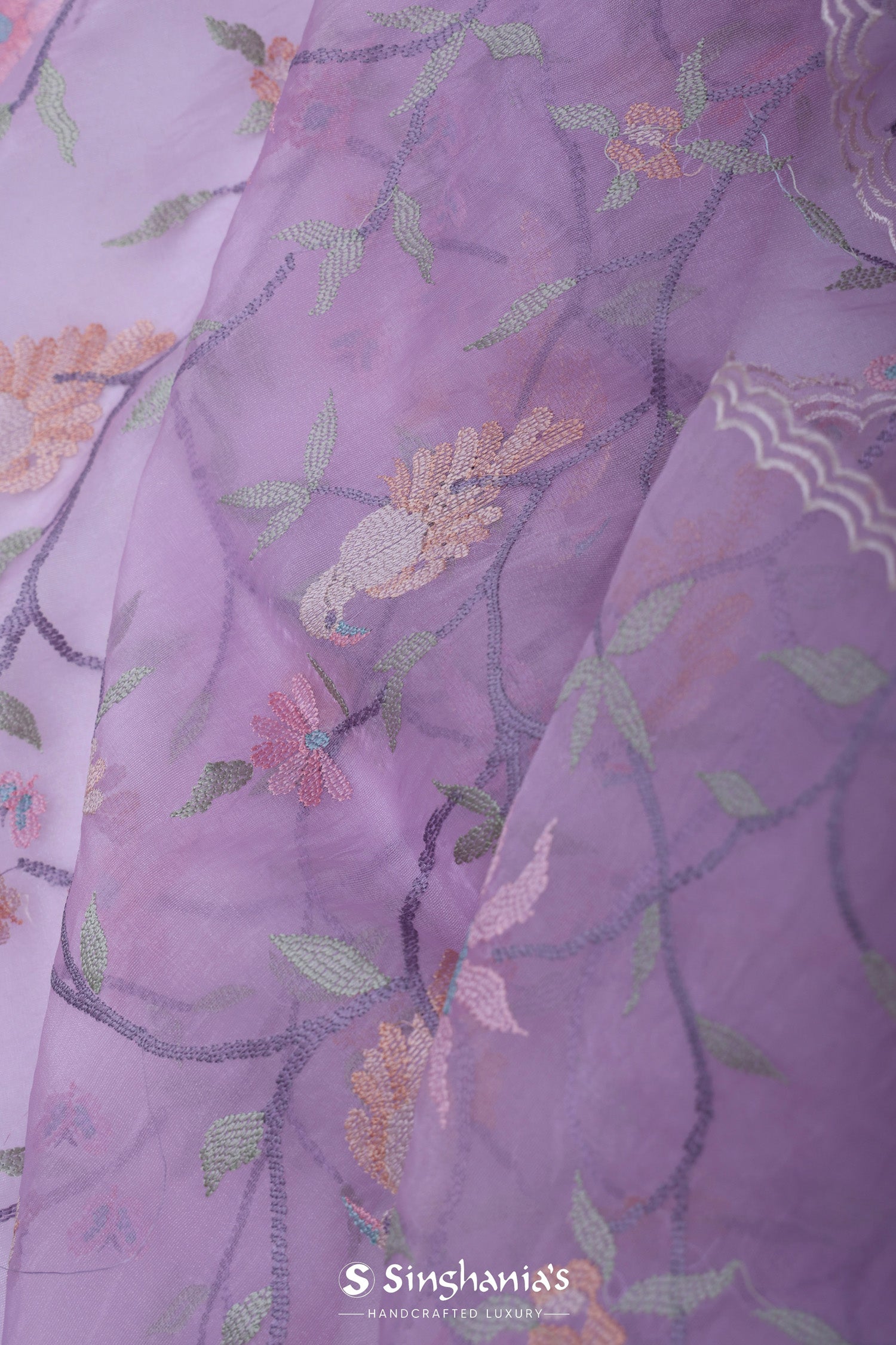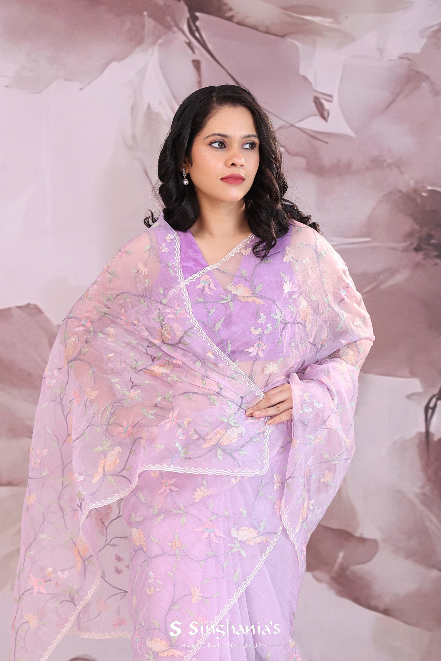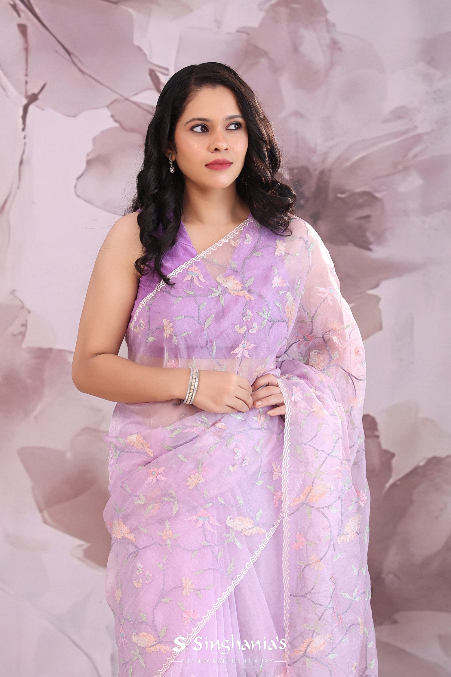 Mauve purple organza saree features leaf and floral embroidery jaal in contrast colors along with scallop border which would light up every moment when you drape yourself with this .