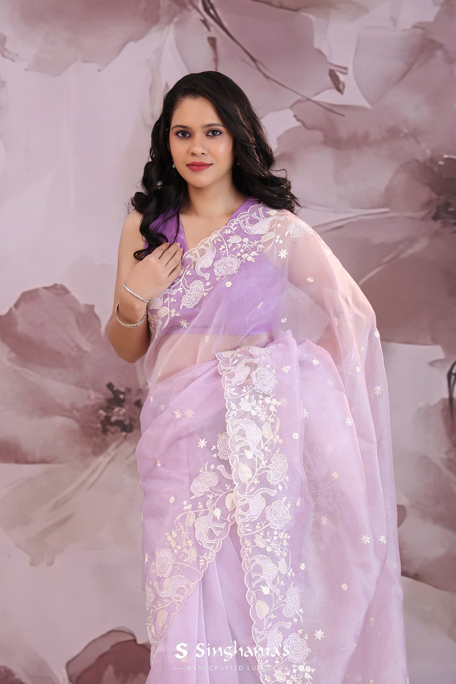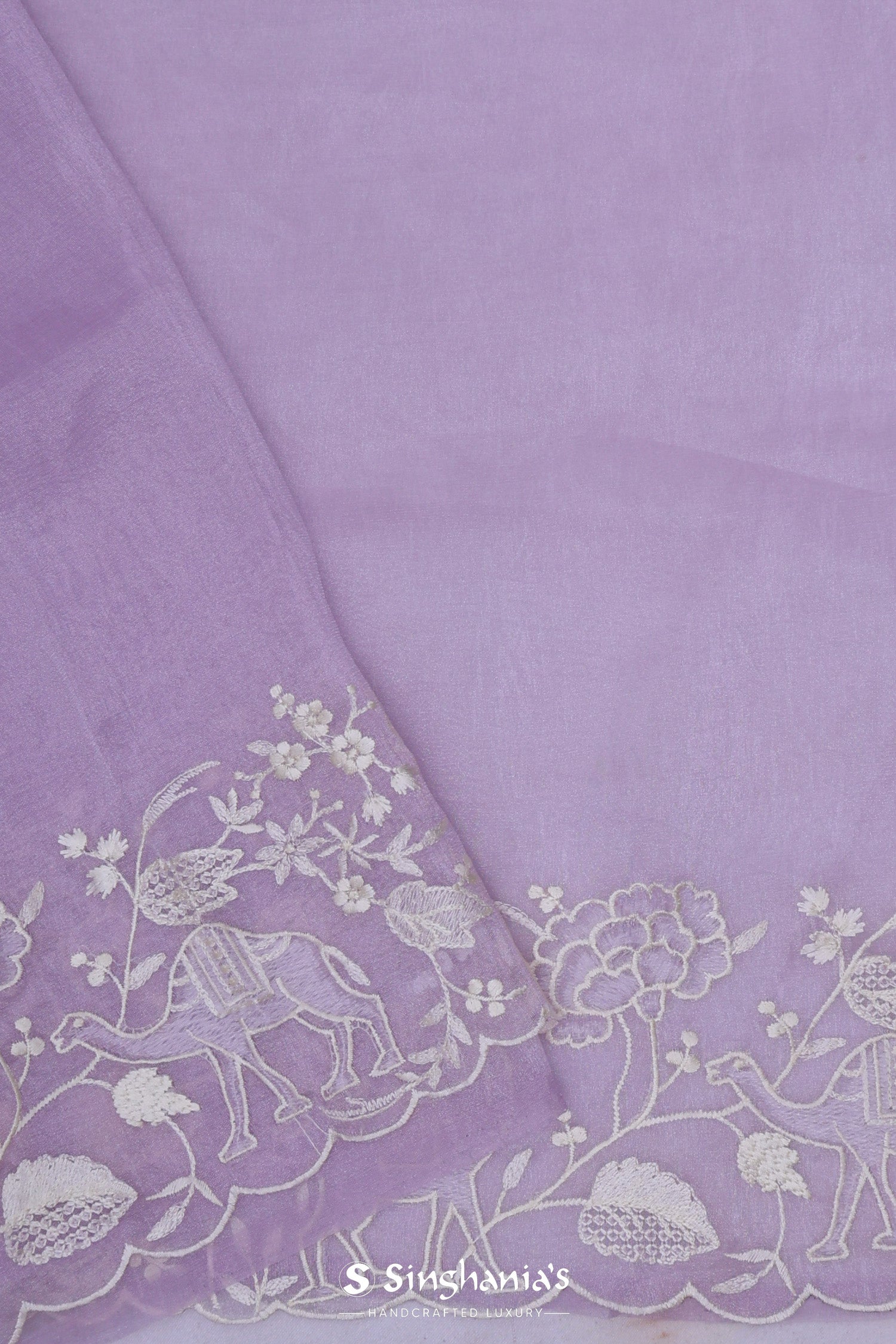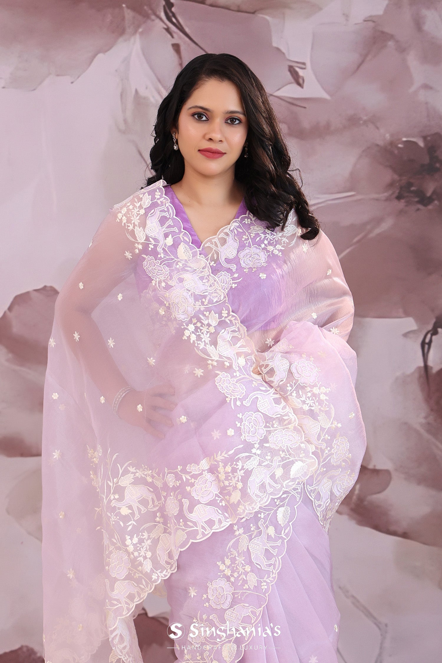 This Mauve purple organza tissue saree features floral butti's along with scallop border embellished with floral and camel figures which would light up every moment when you drape yourself with this.