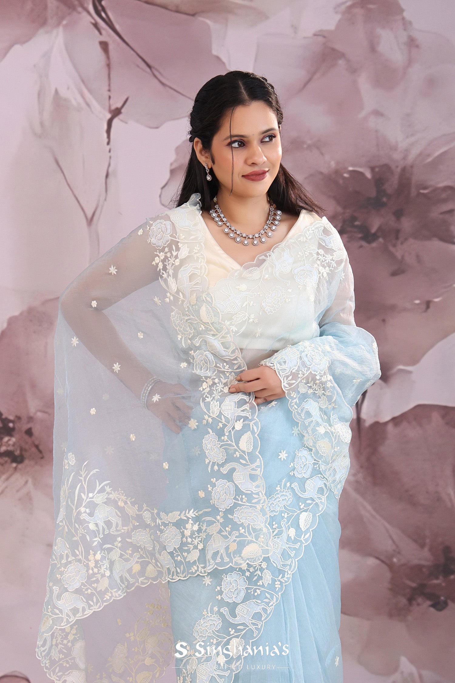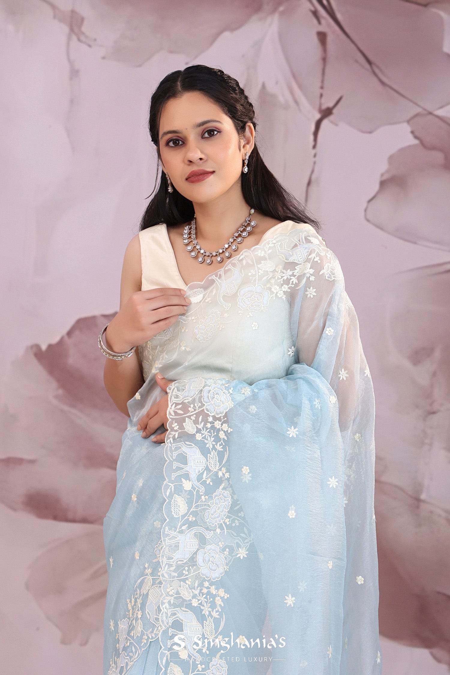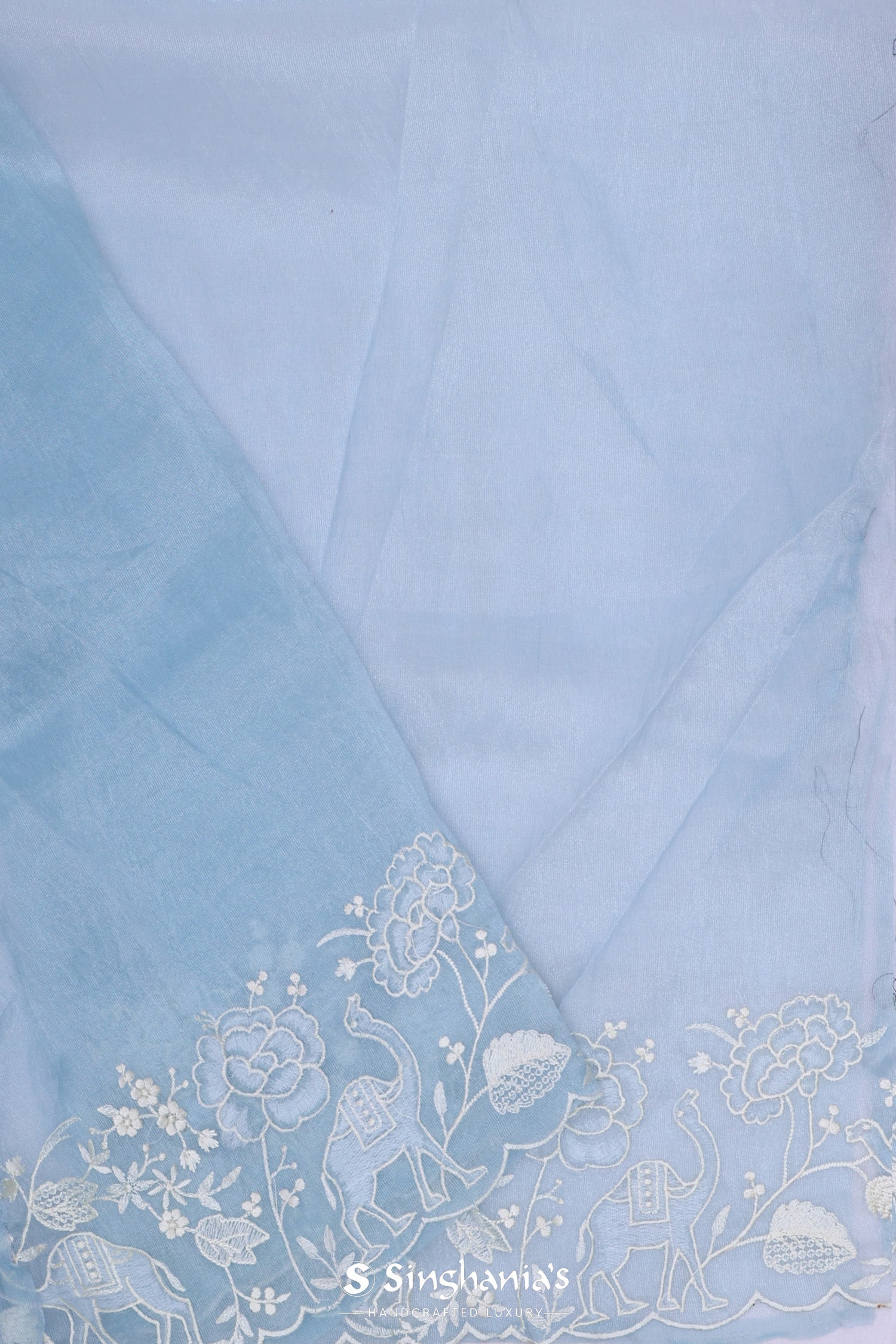 Powder blue organza tissue saree features floral butti's along with scallop border embellished with floral and camel figures which would light up every moment when you drape yourself with this.