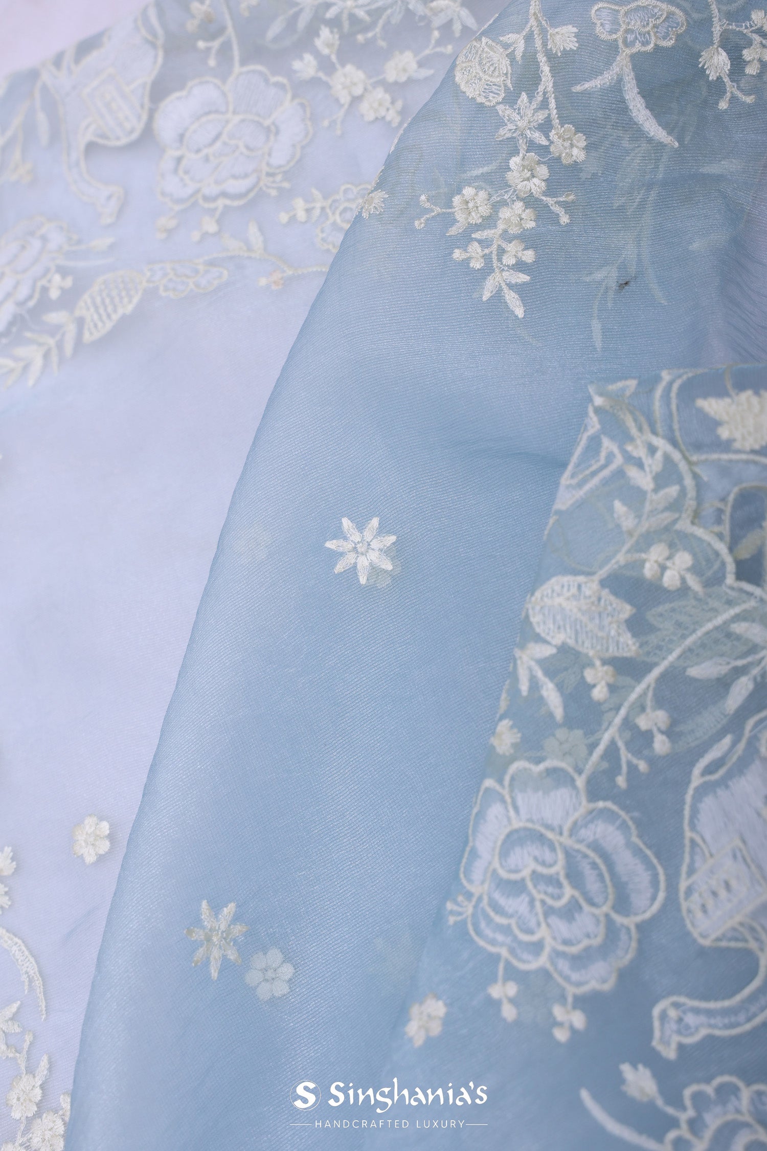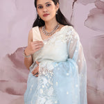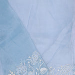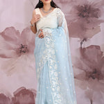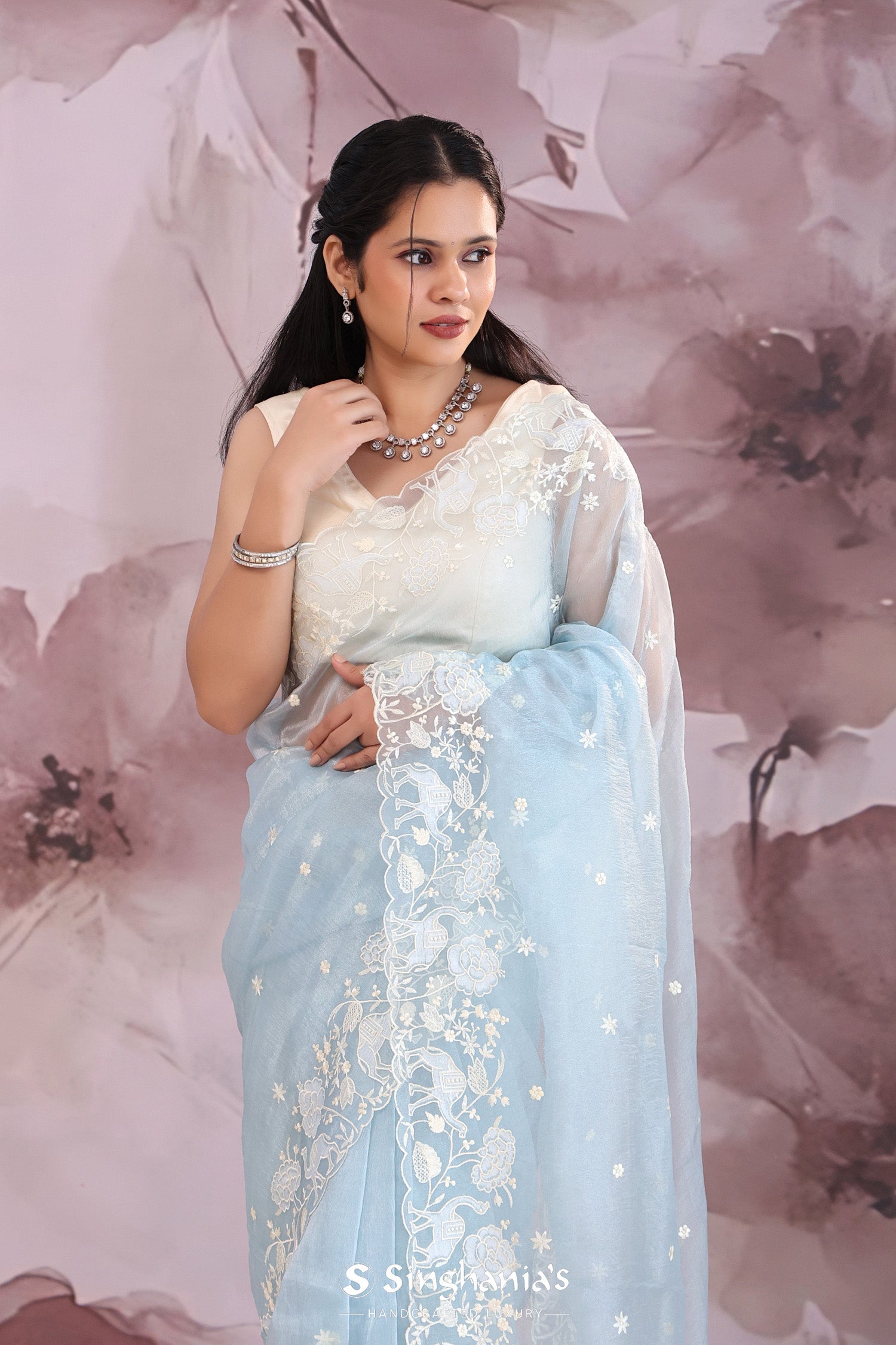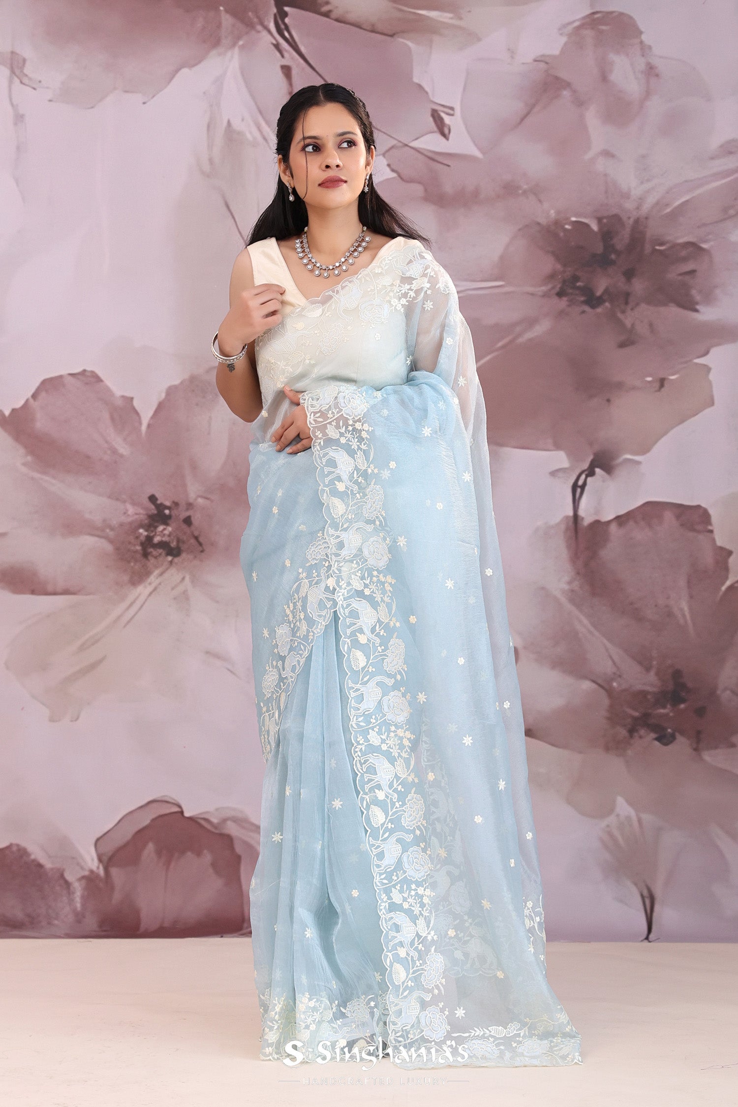 Powder blue organza tissue saree features floral butti's along with scallop border embellished with floral and camel figures which would light up every moment when you drape yourself with this.
